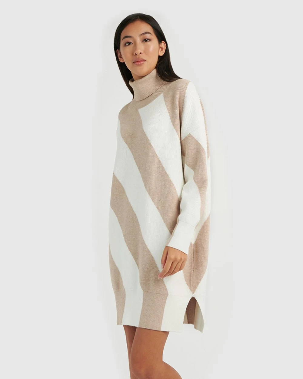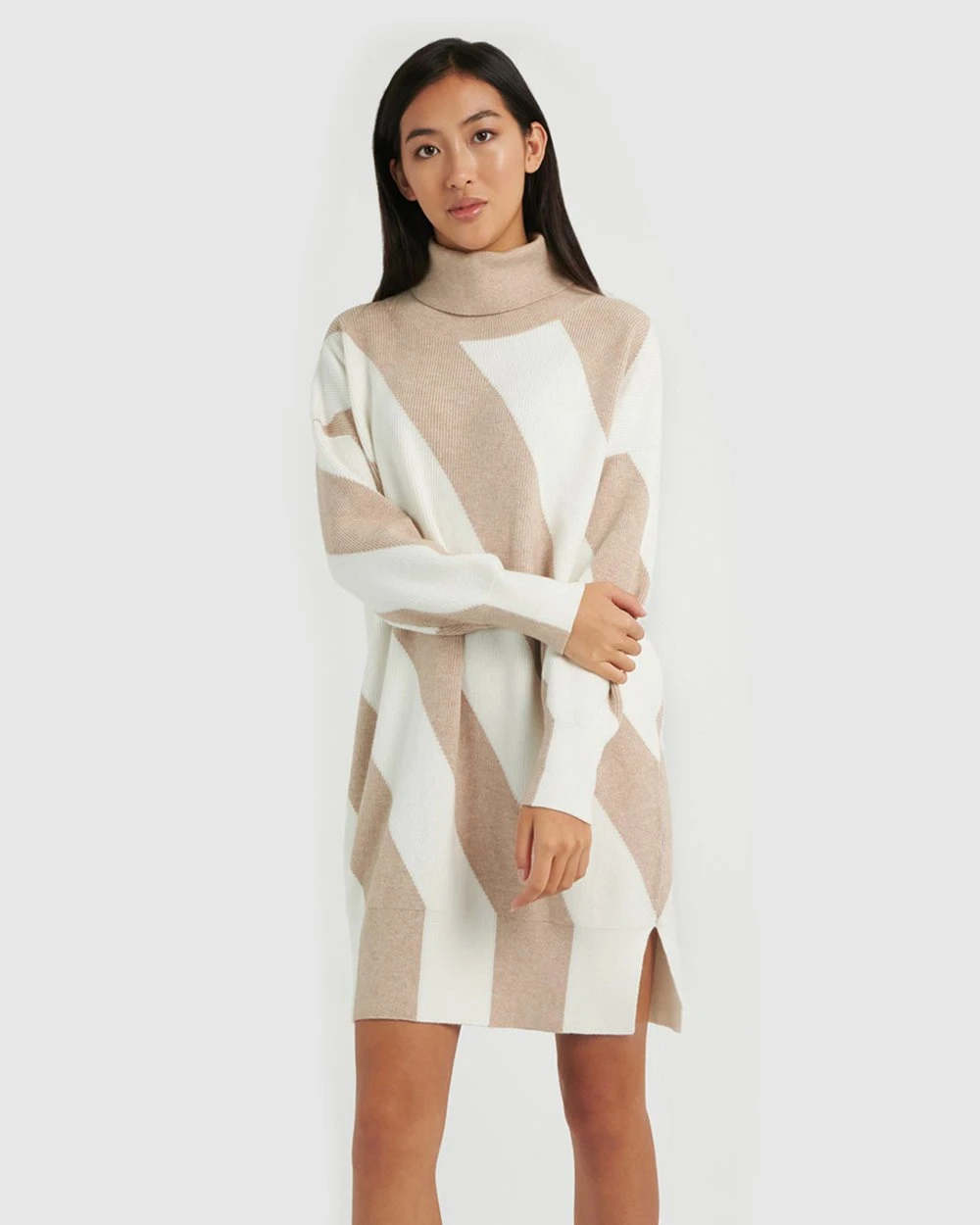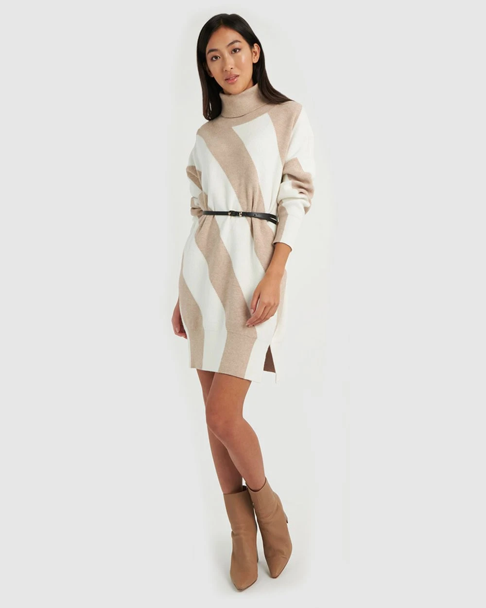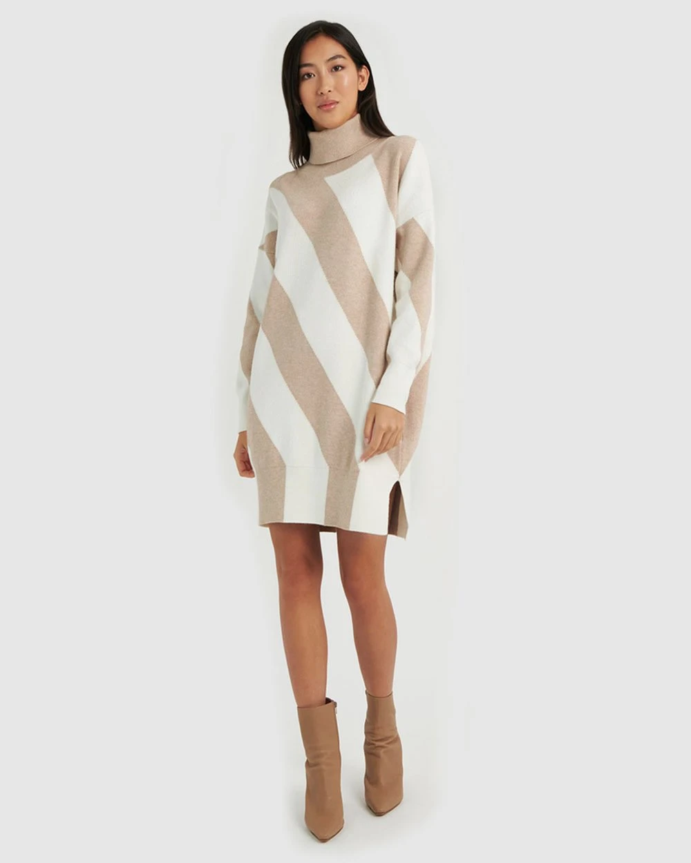 For a cosy and quirky look, the Remi Stripe Knit Dress by Forcast is the right pick, featuring rolled turtleneck, diagonal stripe block print and contrast ribbed edges. Guaranteed to be a favourite this season, this design will keep you warm and looking sophisticated. For a chic look to take you from meeting to mingling, pair with a coat and ankle boots.
