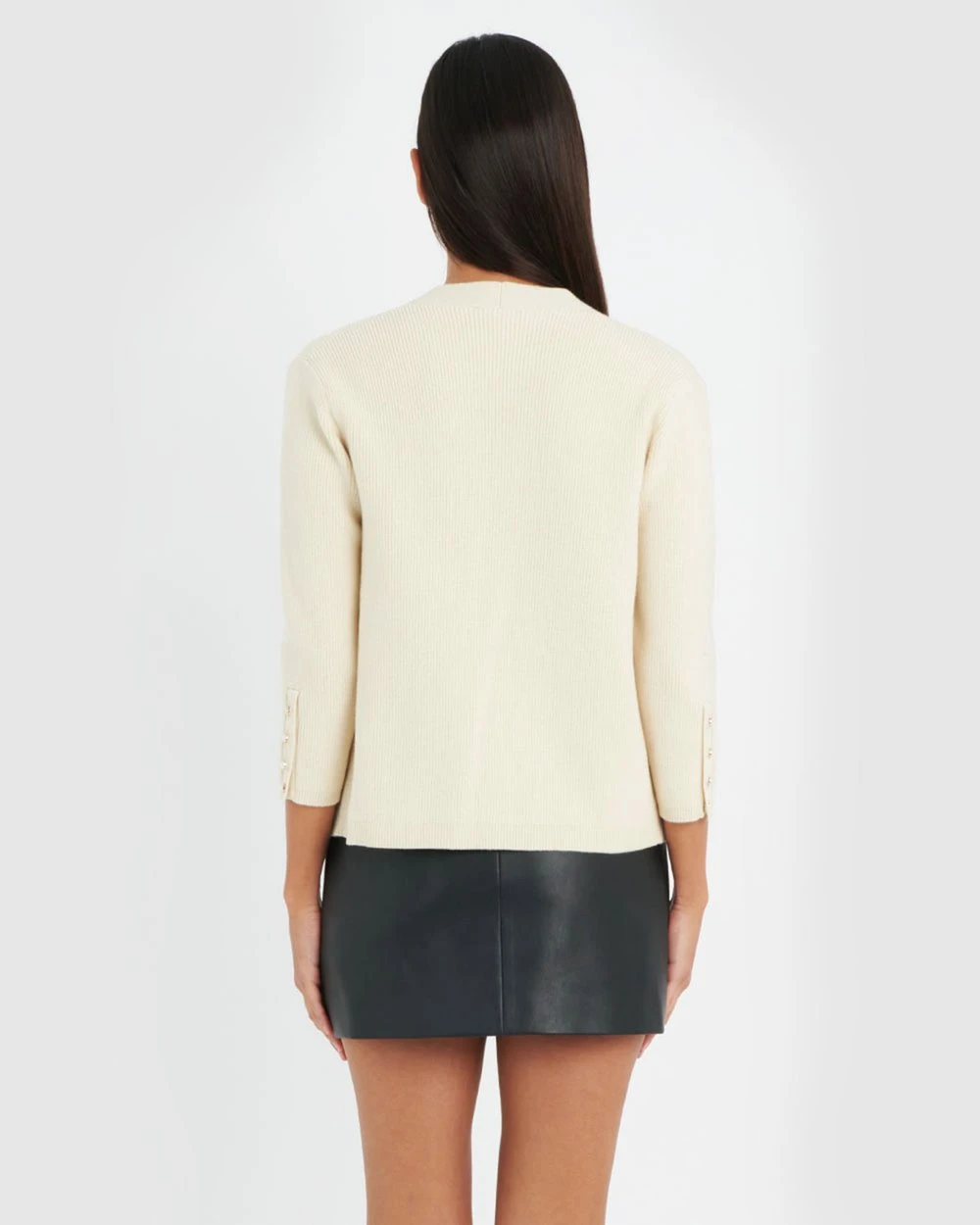Uniquely captivating, the Roxanne Collarless Cardigan by Forcast is a minimal piece perfect for the chilly days coming ahead. It will surely elevate the simple pieces of your work wardrobe, featuring ¾ sleeves with button cuff details and textured ribbed fabrication throughout.