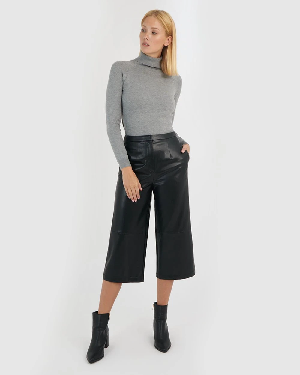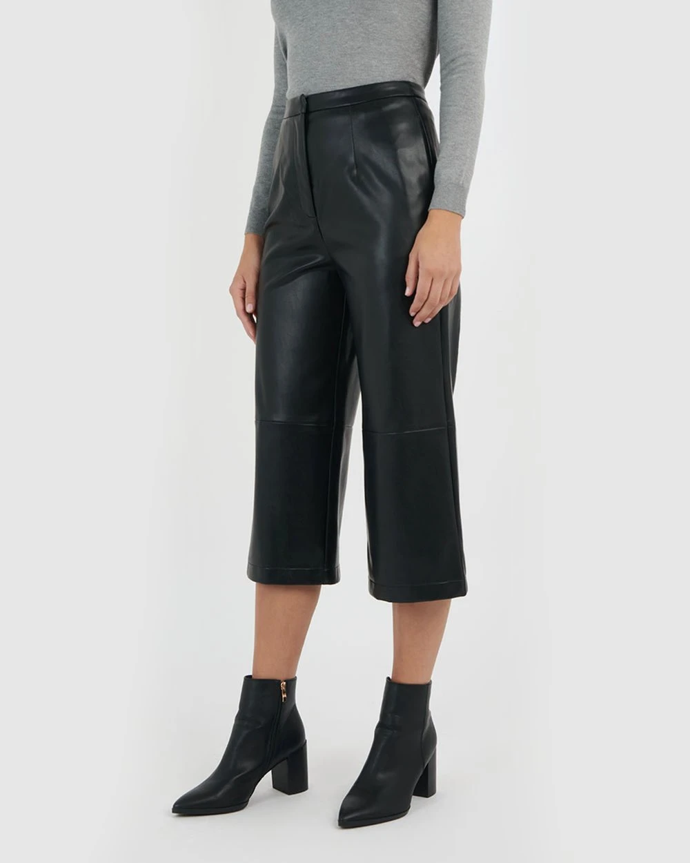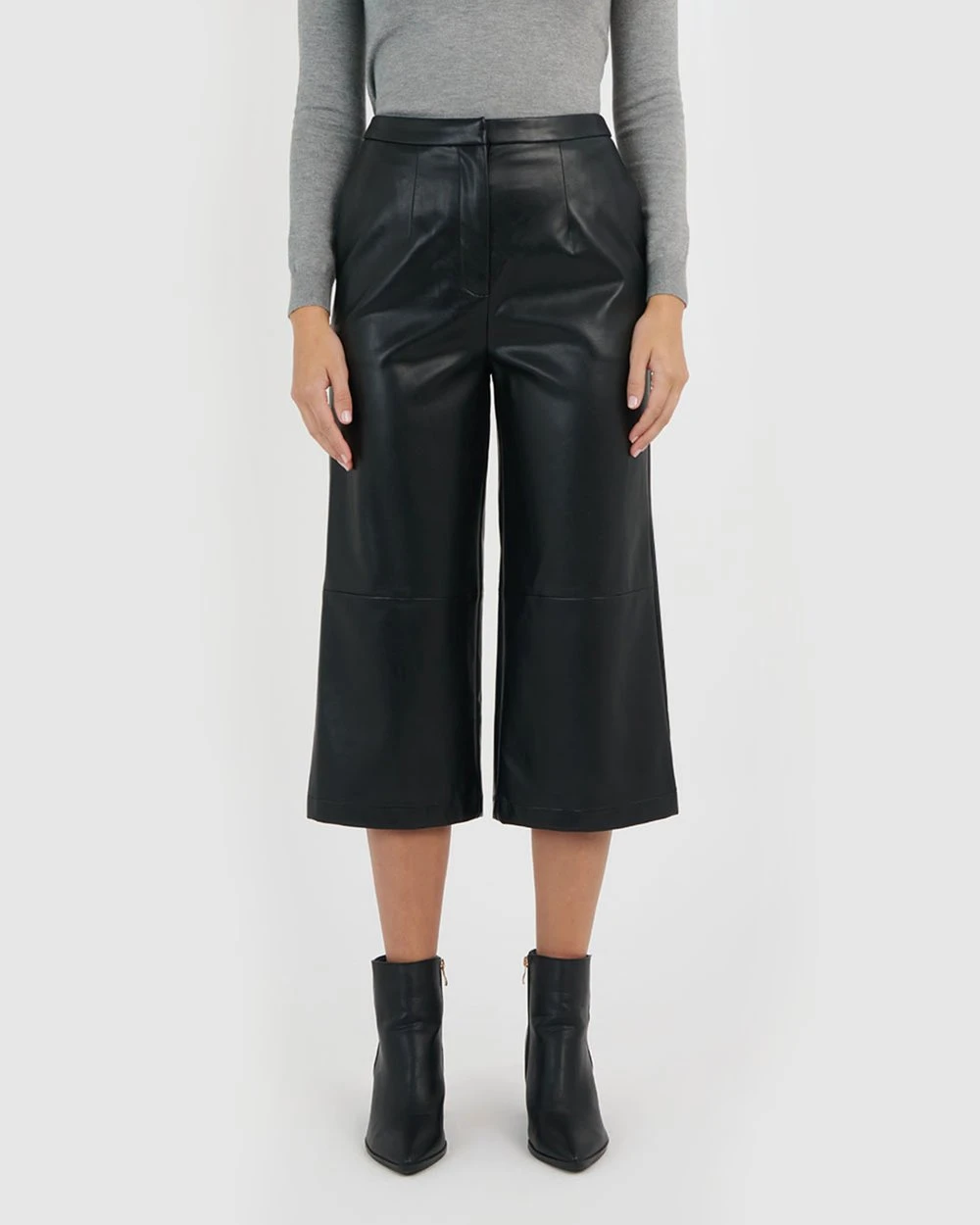 The Sana Faux Leather Culottes by Forcast, with its cropped hem, offers a refreshed and modern take on the leather pants. Featuring the smooth faux leather texture and high waist with a flattering culottes silhouette, these pants complement the body in all the right places. Pair perfectly with a knit top for the office or a light blouse for that simple desk-to-dinner look.