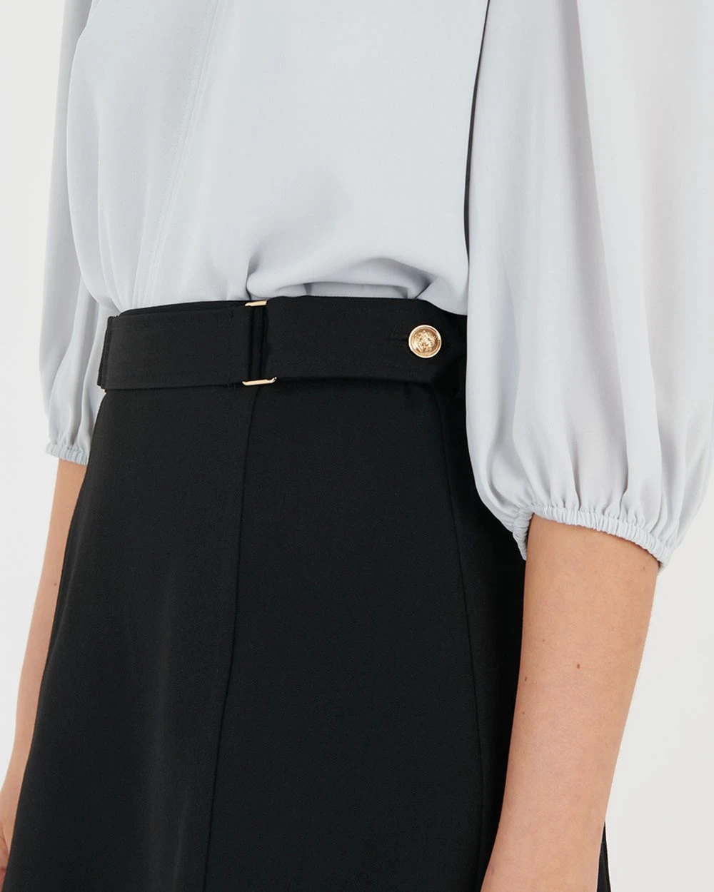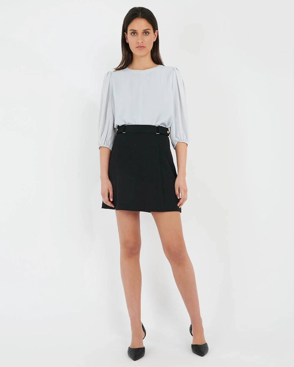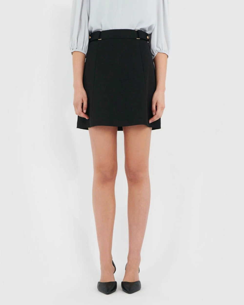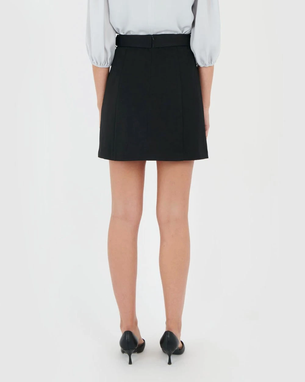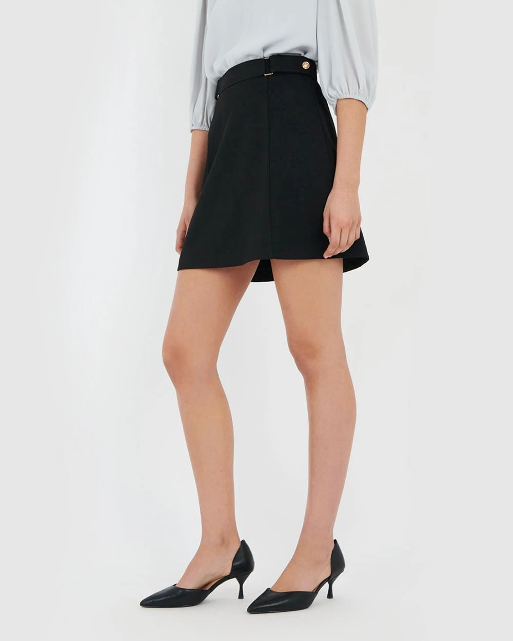 Add a statement piece to your work wardrobe with the Sasha Mini Skirt by Forcast. A classic and versatile piece that will style up your corporate wardrobe, featuring high waist A-line silhouette and unique attached waist belt with gold button details. Pair with the matching Sasha Double Breasted Jacket or complete the set with the Sasha Pants for a classic suit set with a twist.