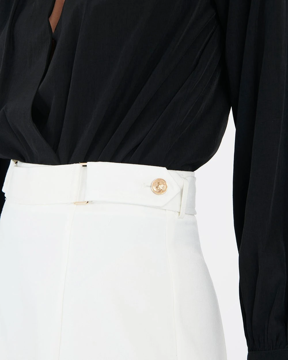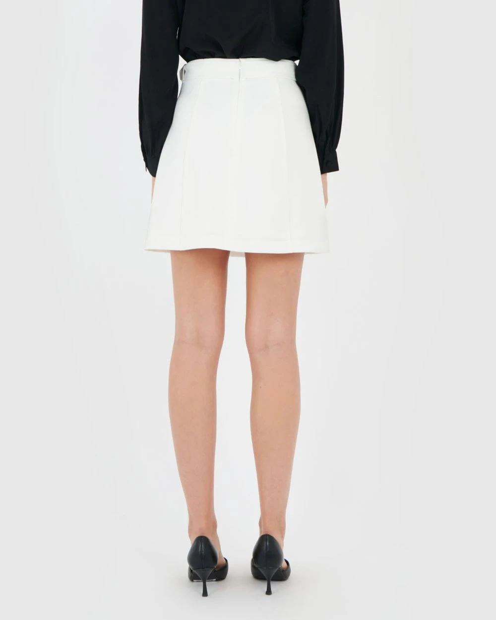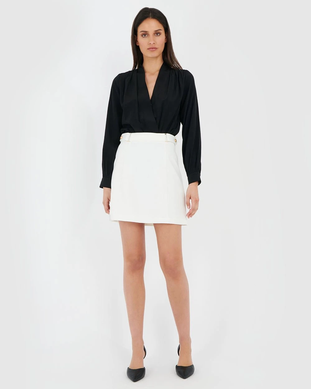 Add a statement piece to your work wardrobe with the Sasha Mini Skirt by Forcast. A classic and versatile piece that will style up your corporate wardrobe, featuring high waist A-line silhouette and unique attached waist belt with gold button details. Pair with the matching Sasha Double Breasted Jacket or complete the set with the Sasha Pants for a classic suit set with a twist.