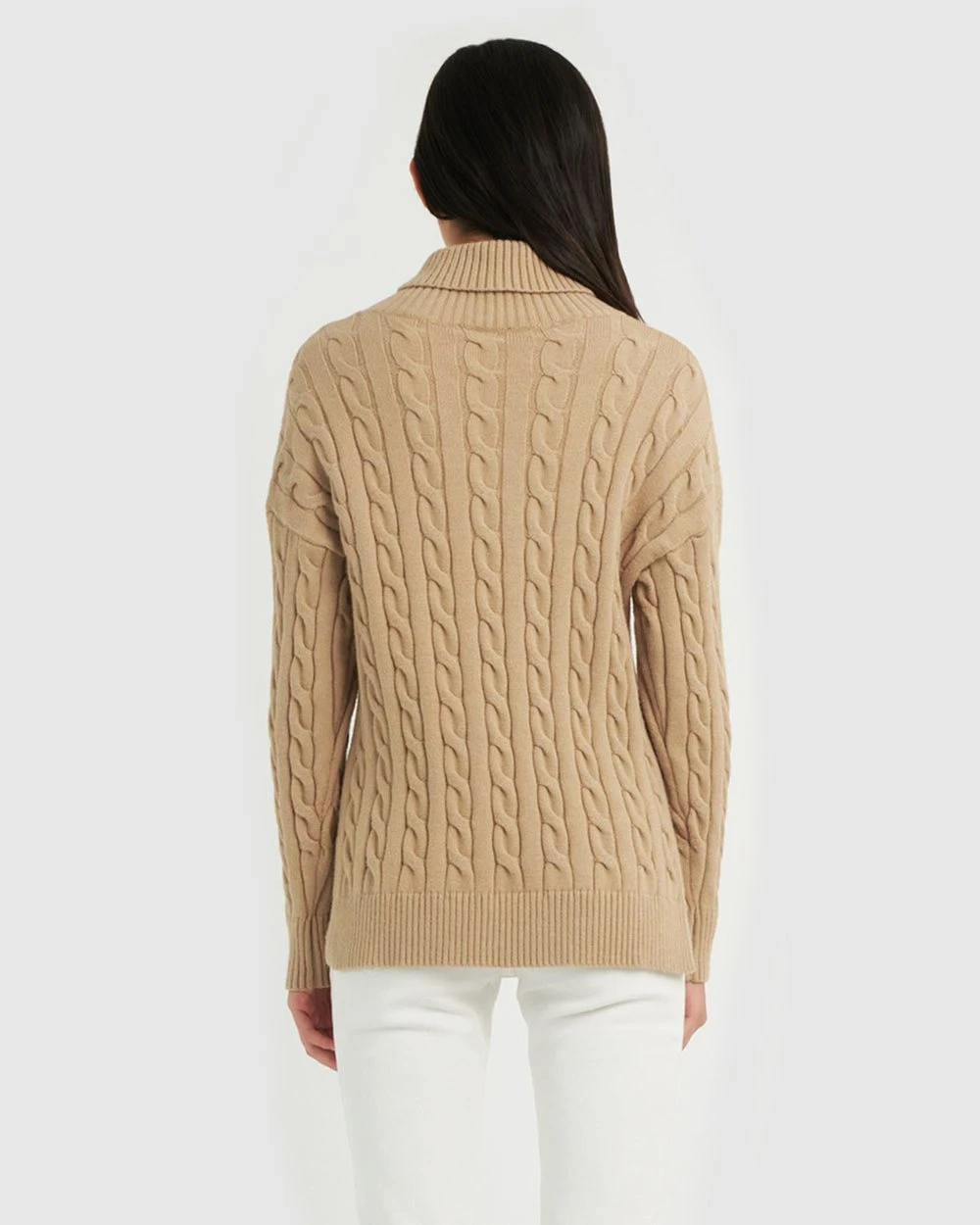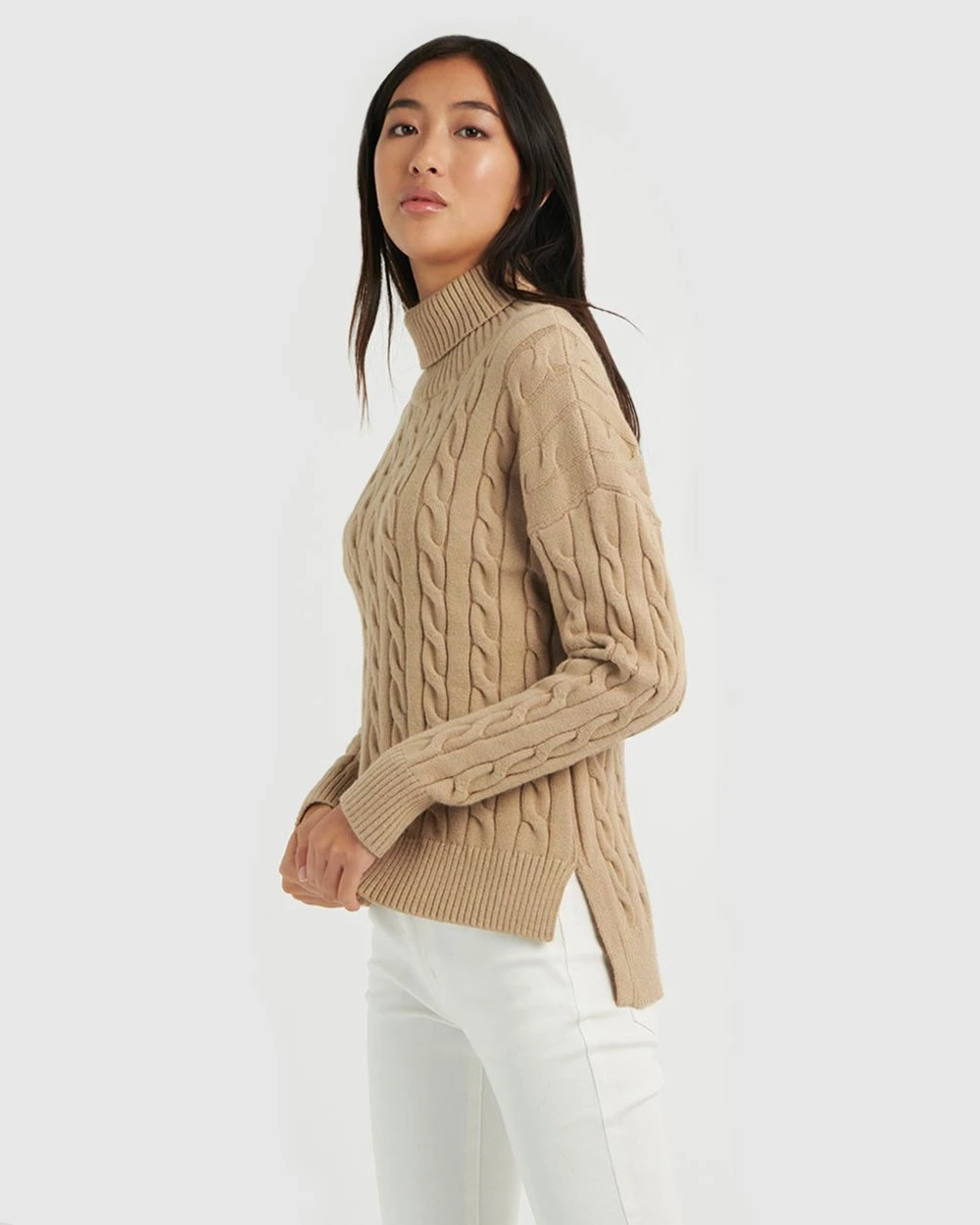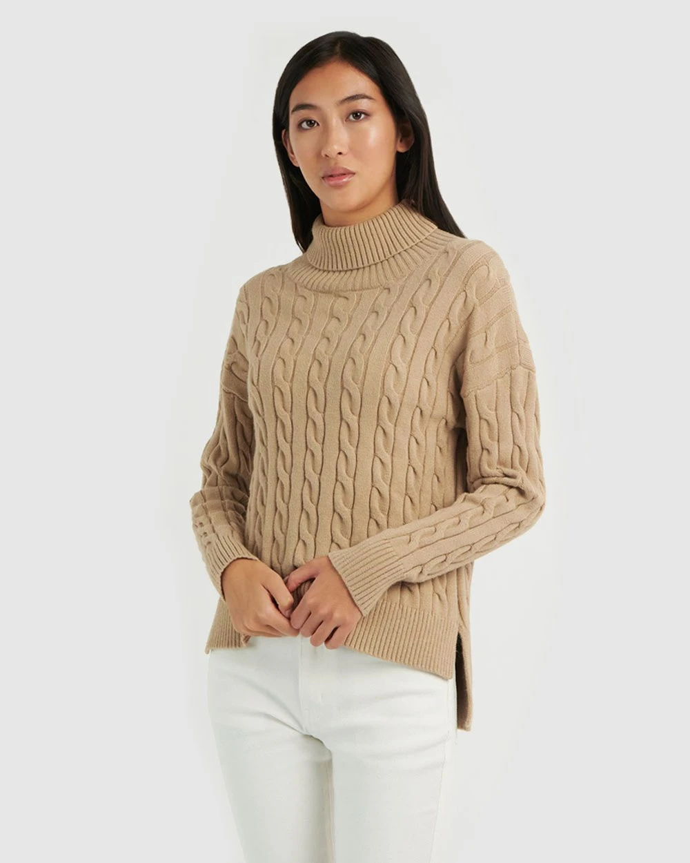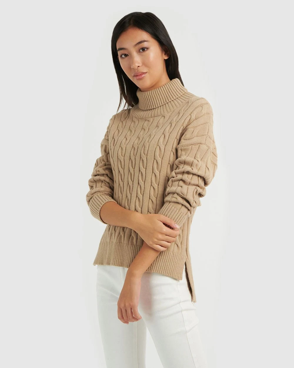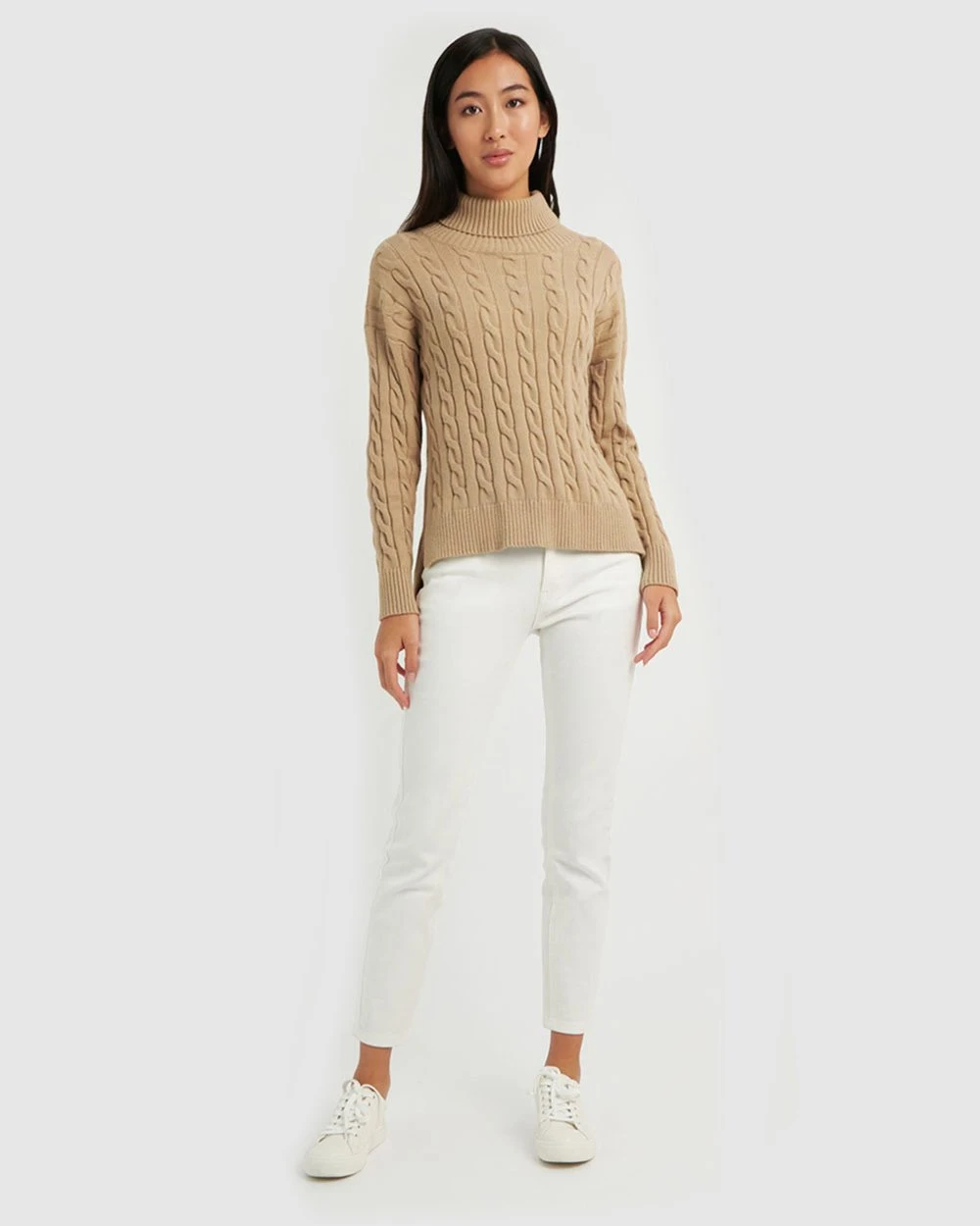 Fall in love this winter with our Scarlett Cable Knit Sweater by Forcast. The relax fit of the knit sweater will guarantee style with comfort, featuring cable knit texture, high low split hem line and contrast ribbed detailing on rolled turtle neck, sleeve cuffs and hem. Complete your soon-to-be favourite winter look with a pair of black slim pants and heeled boots.