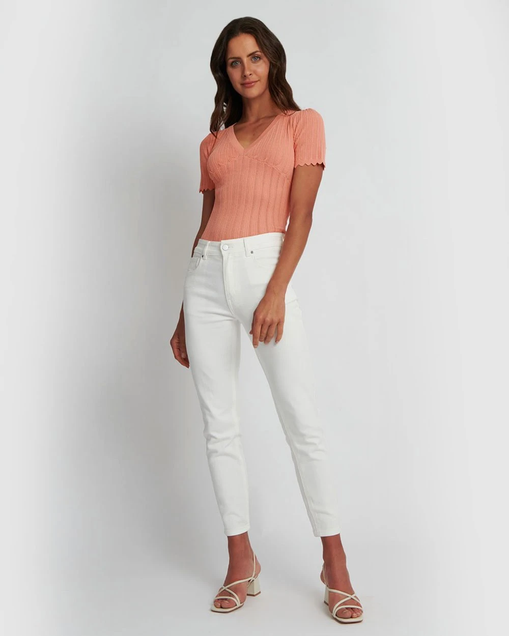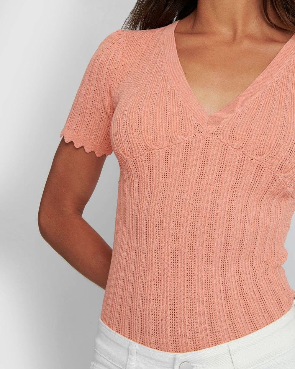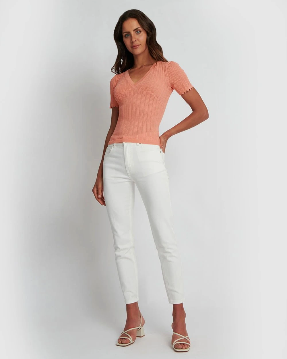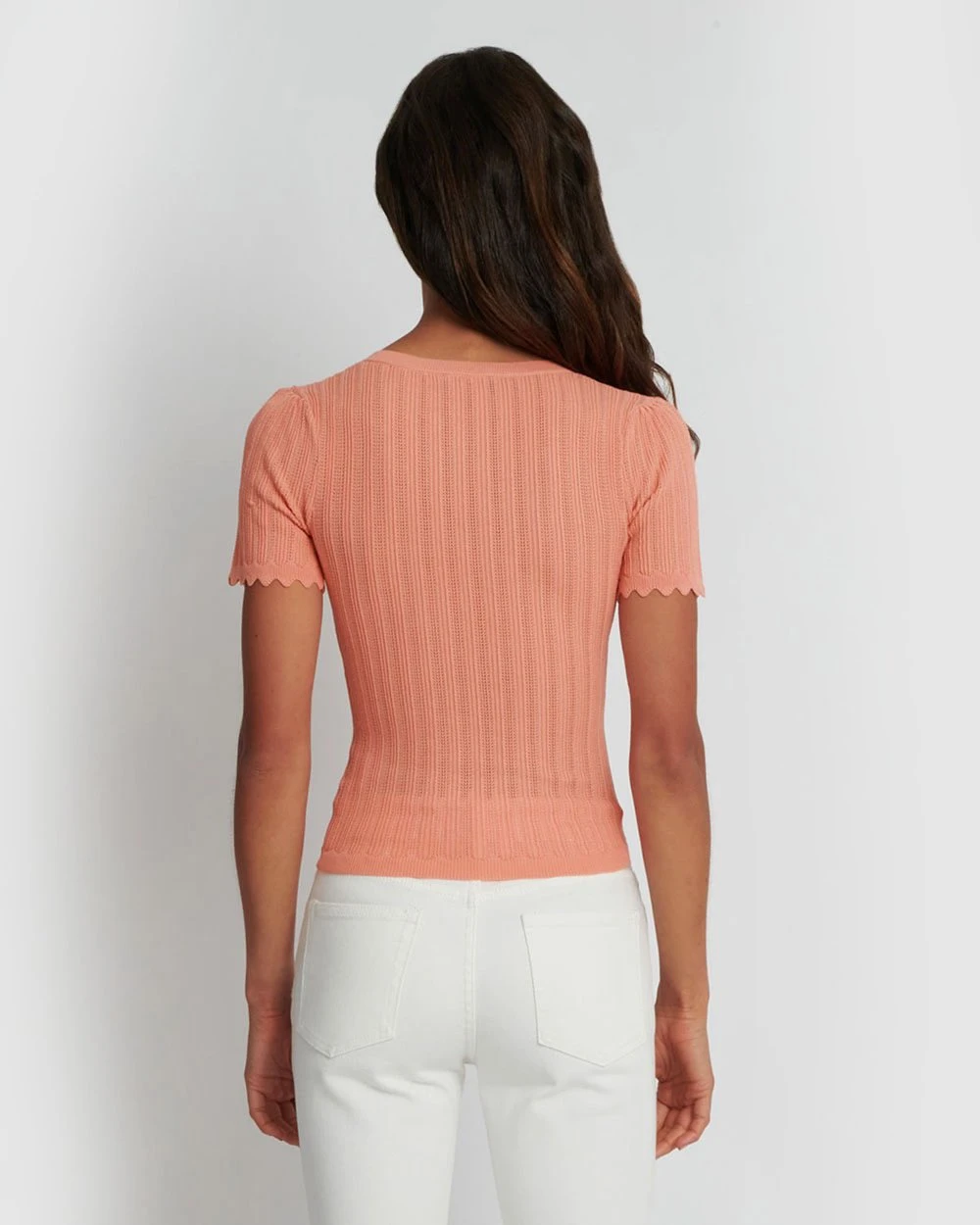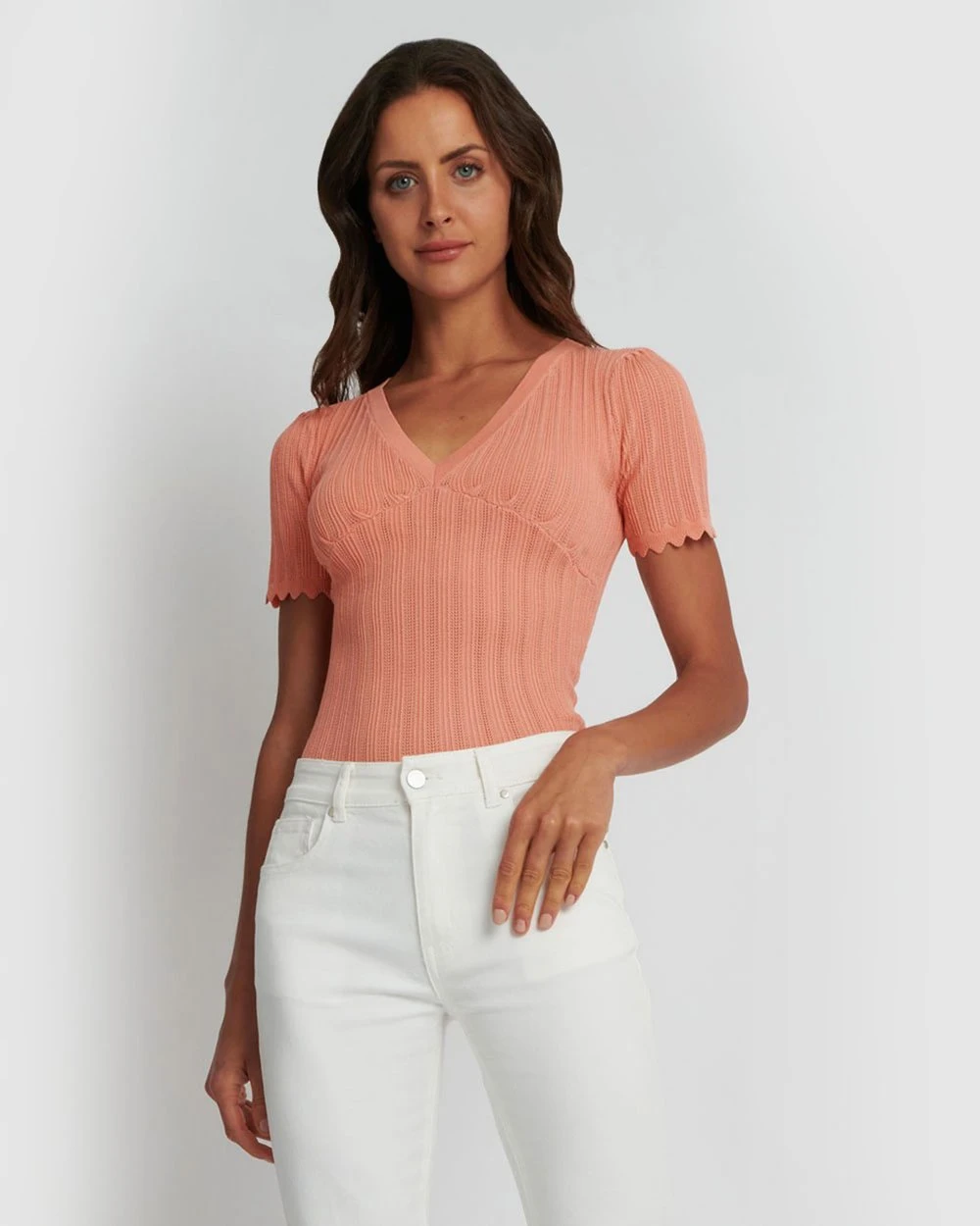 The Vienna Short Sleeve Scalloped Knit by Forcast will be a go to piece this season with its minimal yet classy design. This fitted style features a V-neckline that frames and accentuates the décolletage, while scalloped sleeves add an element of elegance. For a classy and on-trend ensemble wear with an A-line skirt and heels.