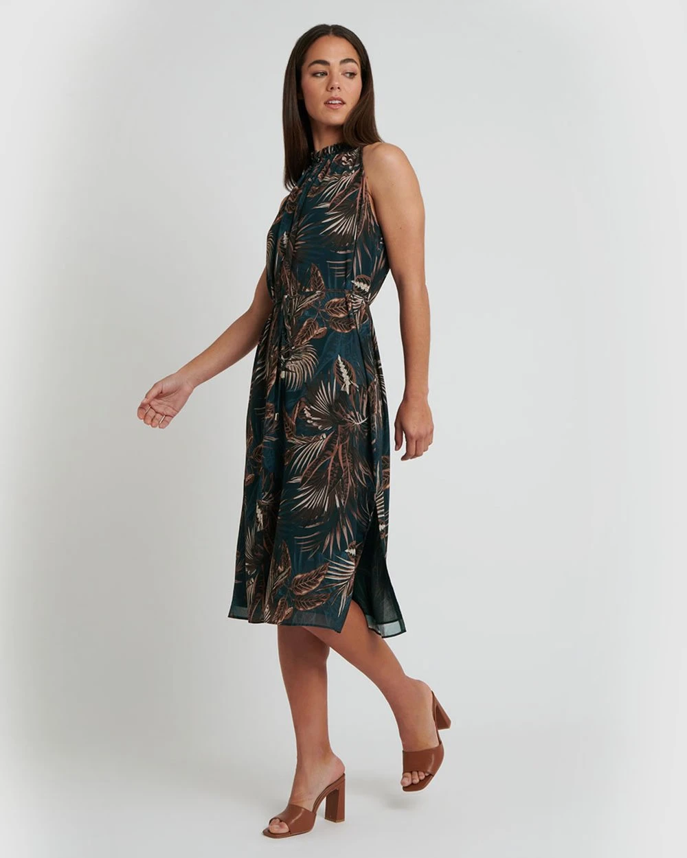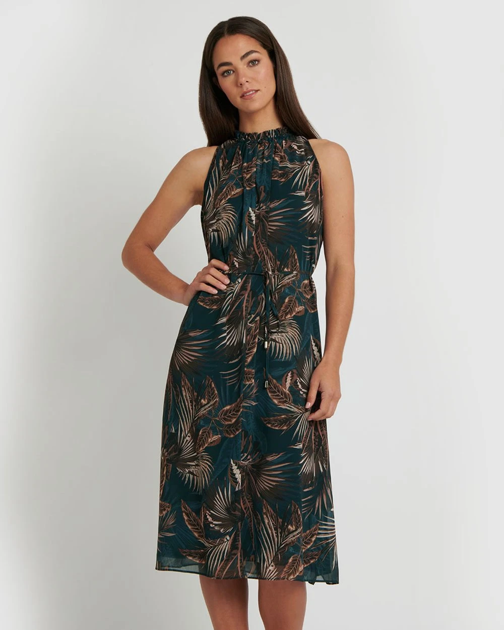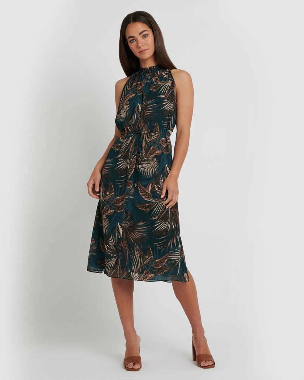 Light and flowy, the Yasmin Printed Dress by Forcast features exotic fauna print perfect for taking you through spring looking elegant. Designed with a ruffle neck line, self-tie belt with hardware tip and side hem split. For a romantic look to take you from desk to date, wear it with a simple nude heel.