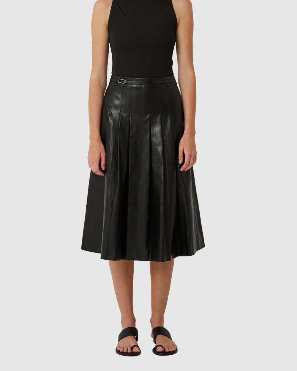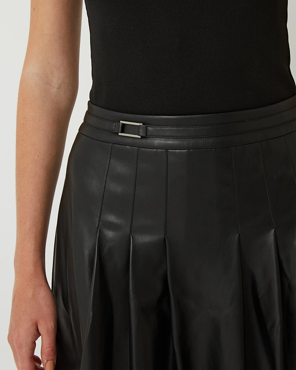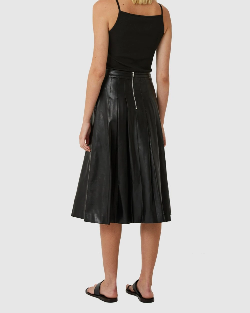The Alex Pleated Vegan Leather Midi Skirt from Friend of Audrey is a twist on the classic pleated skirt. The skirt features six pleats across the front and back to give volume to the skirt. The waistband draws in the waist with a belted detail. An exposed metal zipper located in the centre back allows the skirt to be slipped on with ease. This skirt is a must have vegan leather piece.