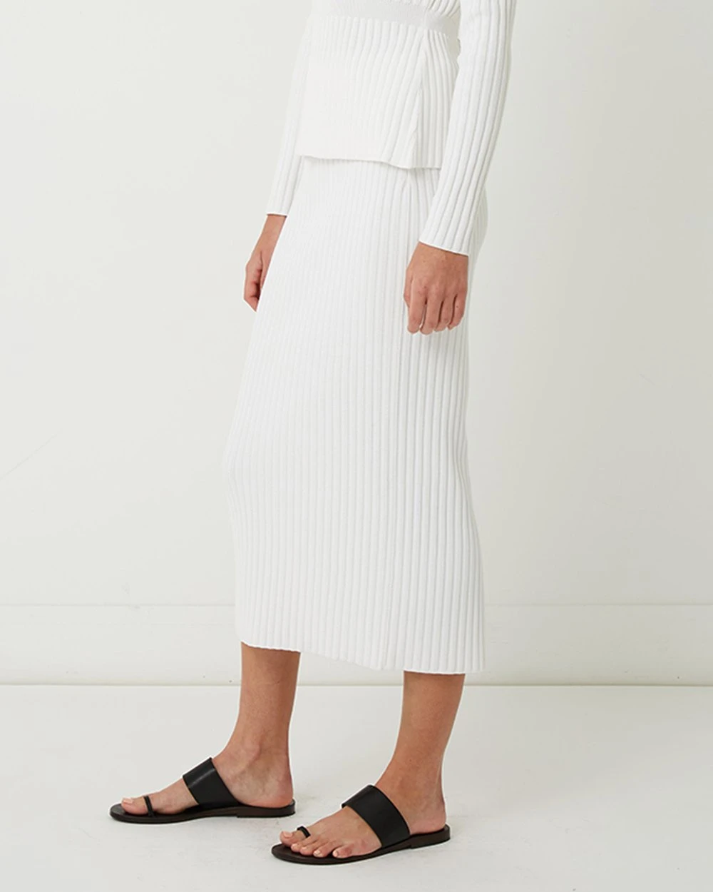 The Bette Longline Ribbed Knit Midi Skirt offers a flattering, slim fit with an elasticated waistband. The rib knit fabrication in a fresh white colourway make this the perfect transesasonal knit skirt. A flattering length, that sits just above the ankle, this skirt pairs perfectly with the Bette Ribbed Knit Tie Top.