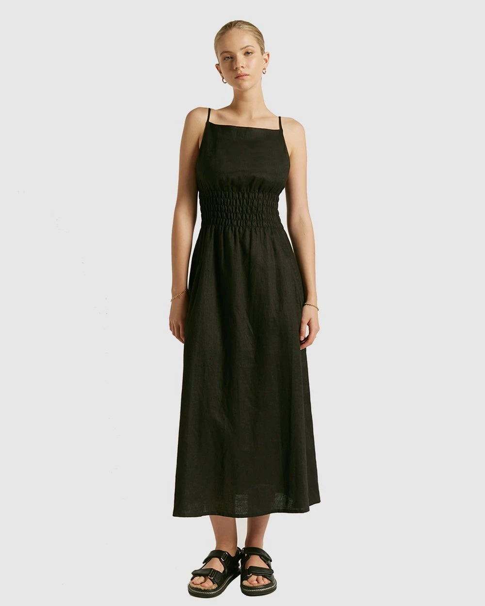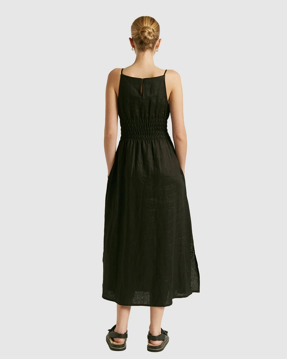 – Length: 120cm (size AU 8)- 100% Linen- Square neck- Keyhole button back closure- Shirred waist- Side splits – Designed in Australia