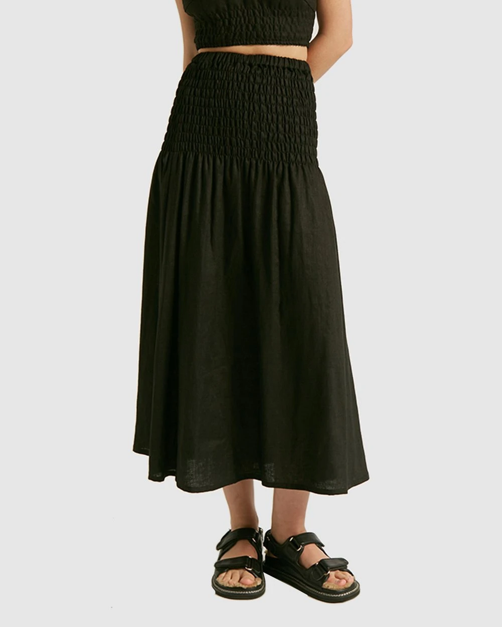 – Length: 89cm (size AU 8)- High-waisted- Above ankle Length – 100% Linen; Lined- Shirred waist- Designed in Australia