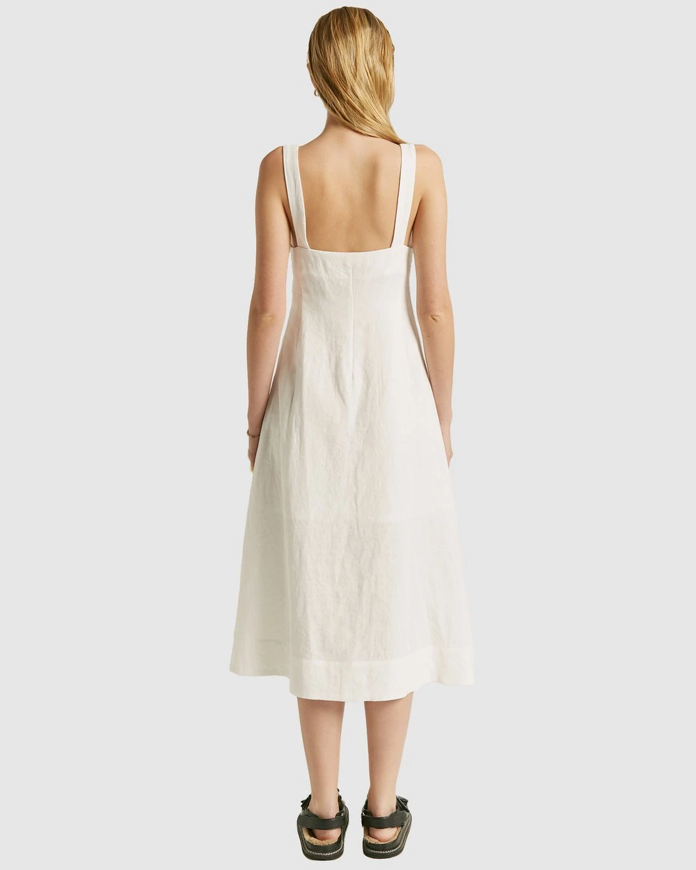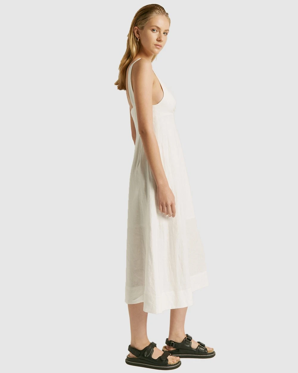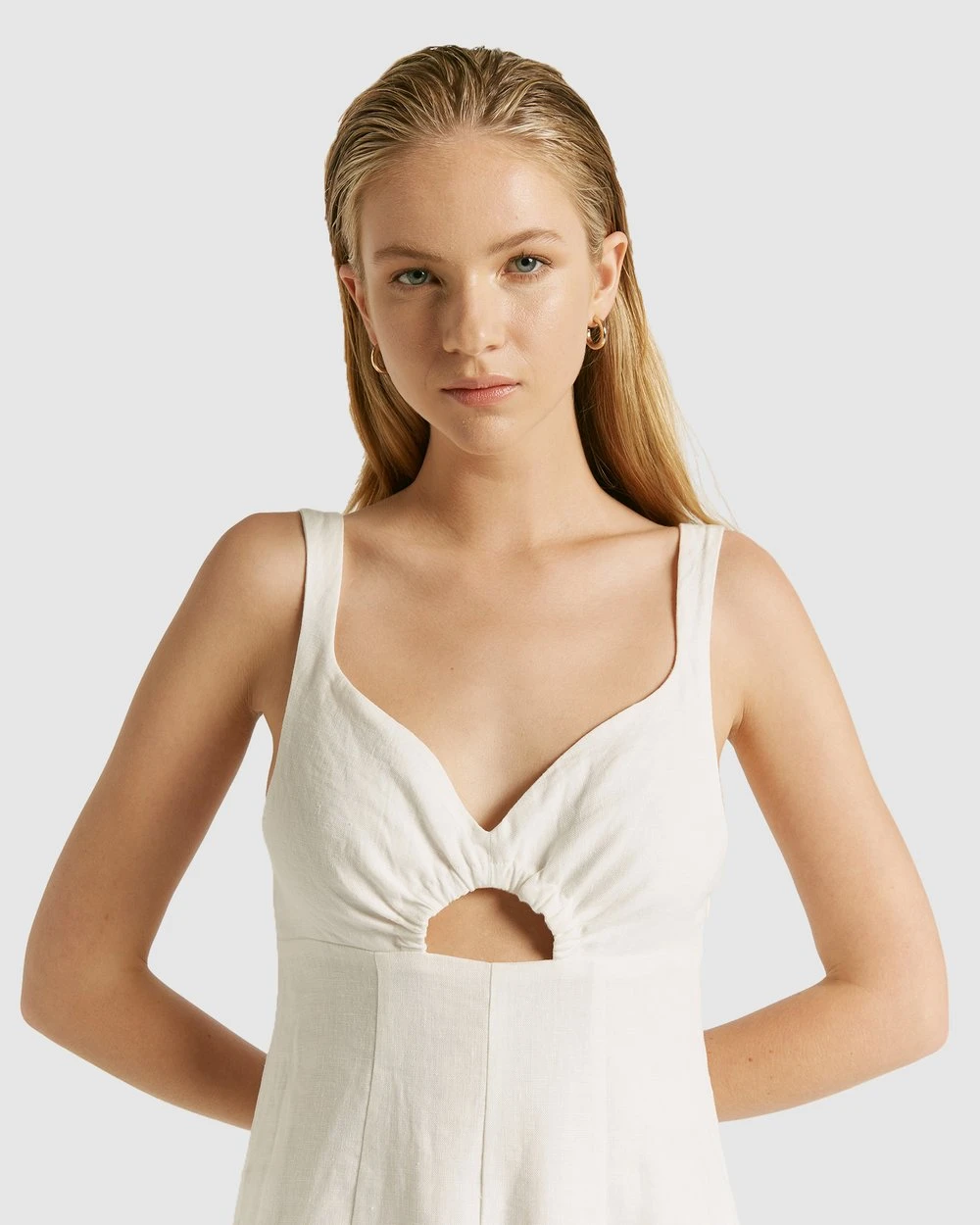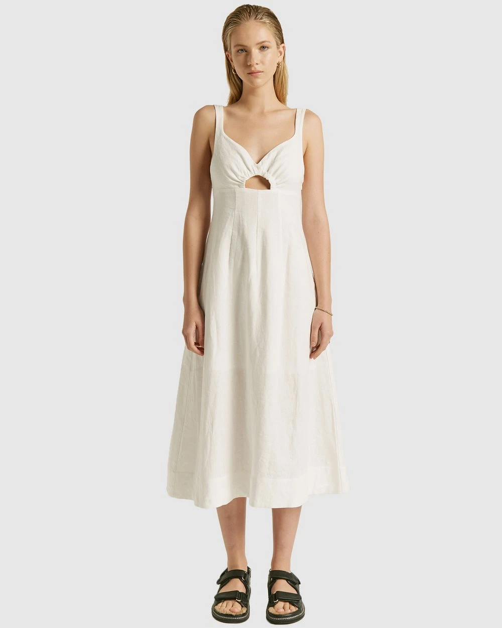 One can never own too many white summer dresses. The Joan Linen Cut-Out Dress from Friend of Audrey has the right amount of style and sophistication. The flattering neckline partners with the front cut out with ruched detail along the bust. Finished with a wide hem, this midi dress moves effortlessly when you walk.