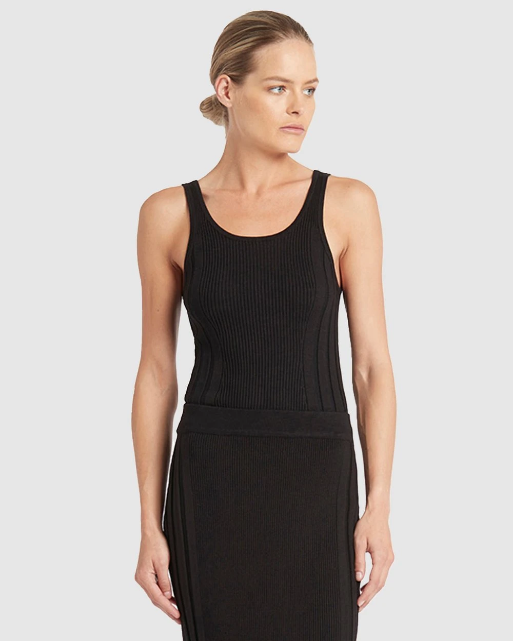 – Length: 61cm (Size S)- Round scoop neck- Close rib throughout body- Wider rib knit pattern along sides- Figure skimming- Black colourway- Designed in Australia