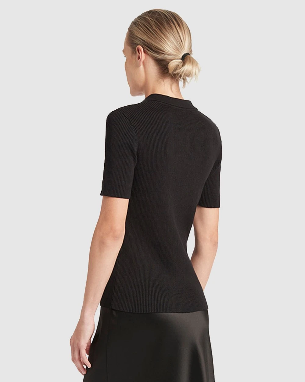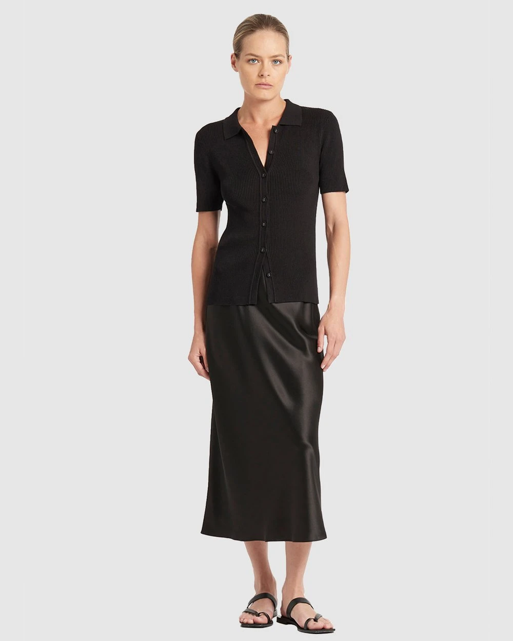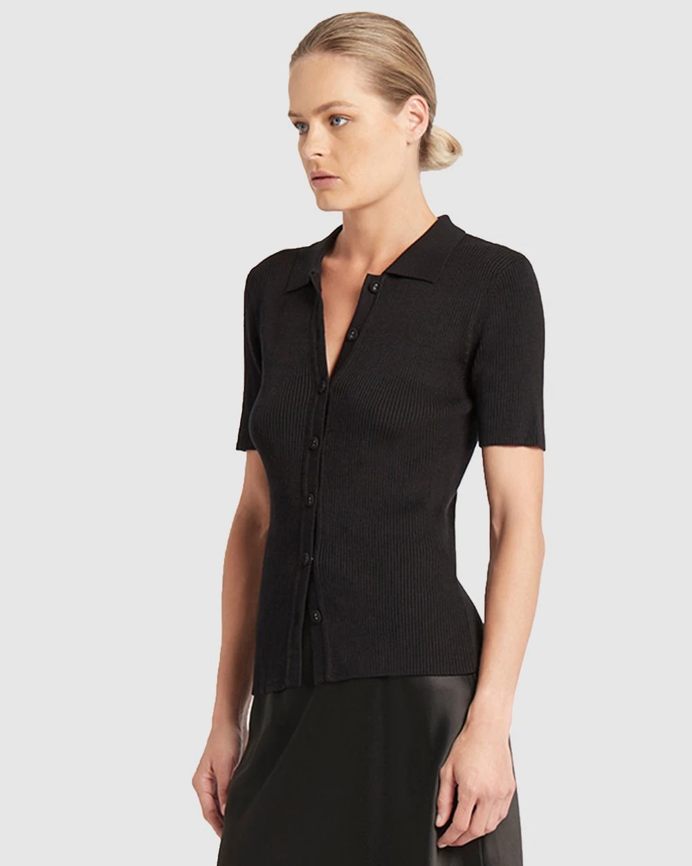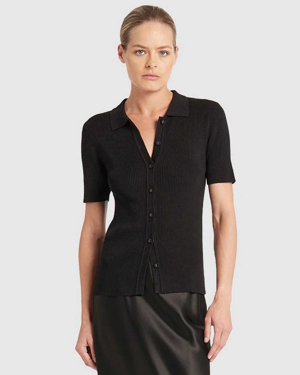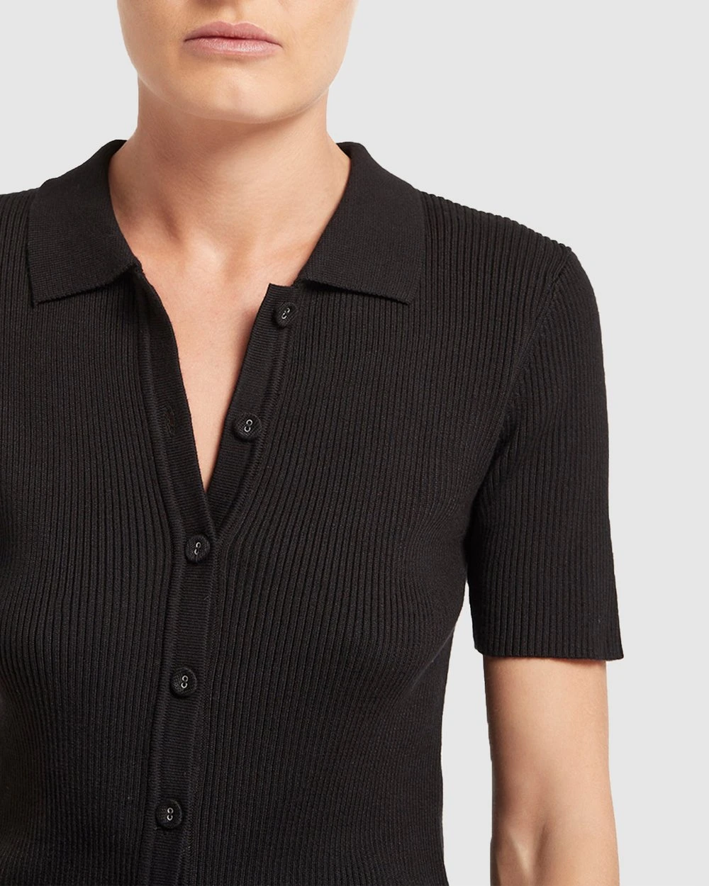 – Length: 60cm (Size S)- Collar- Buttons through front- Short sleeves- Figure-skimming silhouette- Soft, rib knit fabrication- Black colourway- Designed in Australia