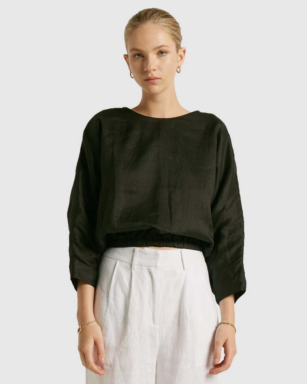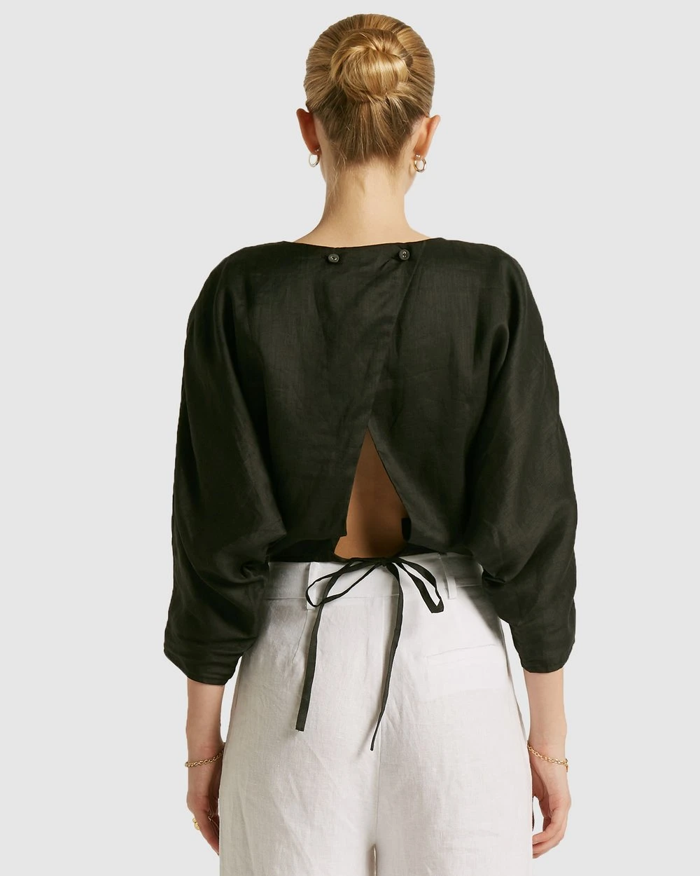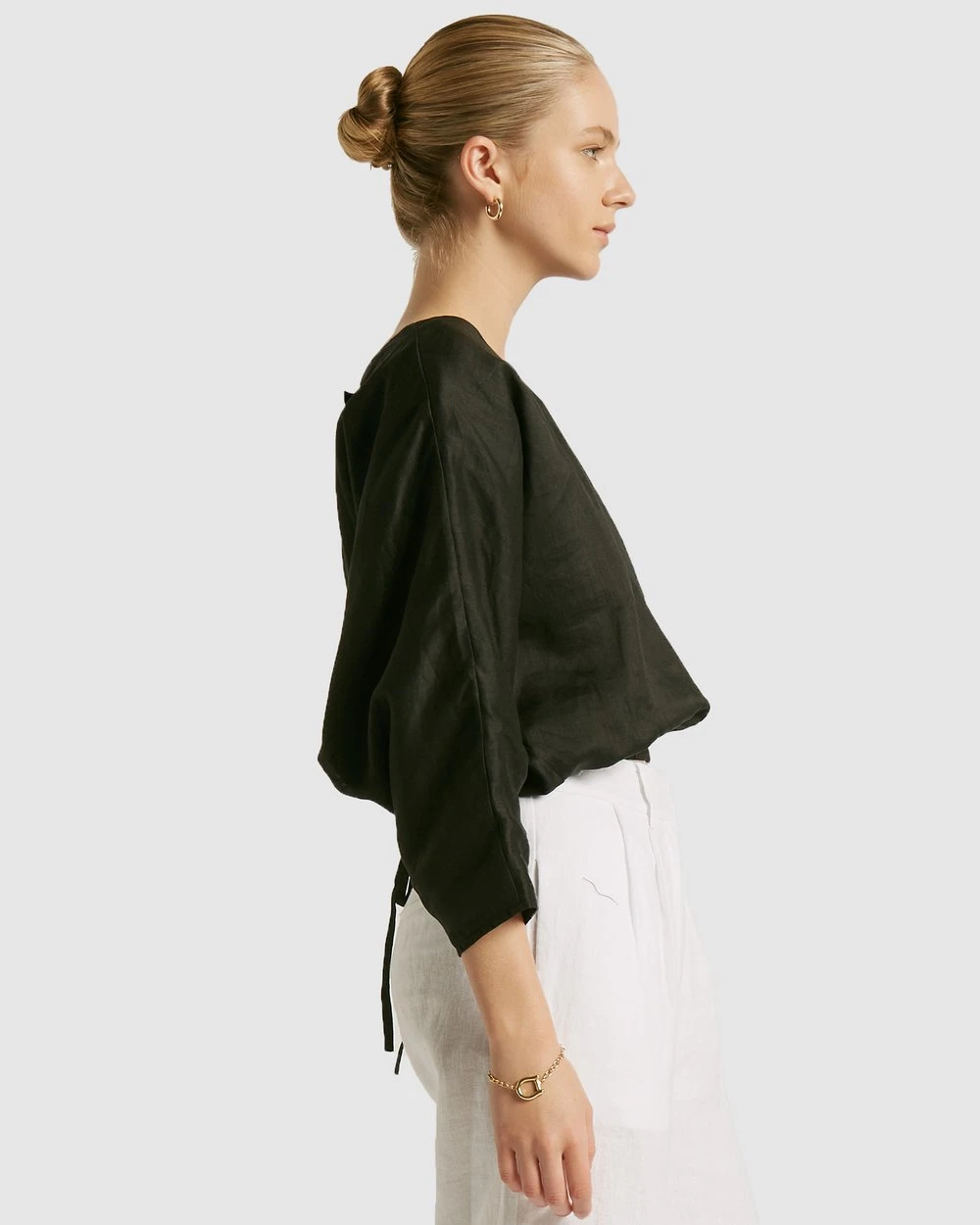 The Mica Ramie Tie Top by Friend of Audrey is cut from an airy ramie fabrication. Designed for a relaxed silhouette, the batwing sleeves and elasticated waistband makes this piece comfort as well as style. Other features include the open back with waist tie and self covered buttons.