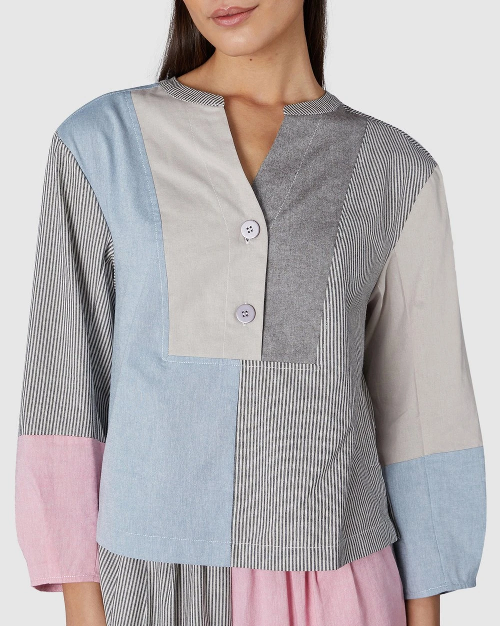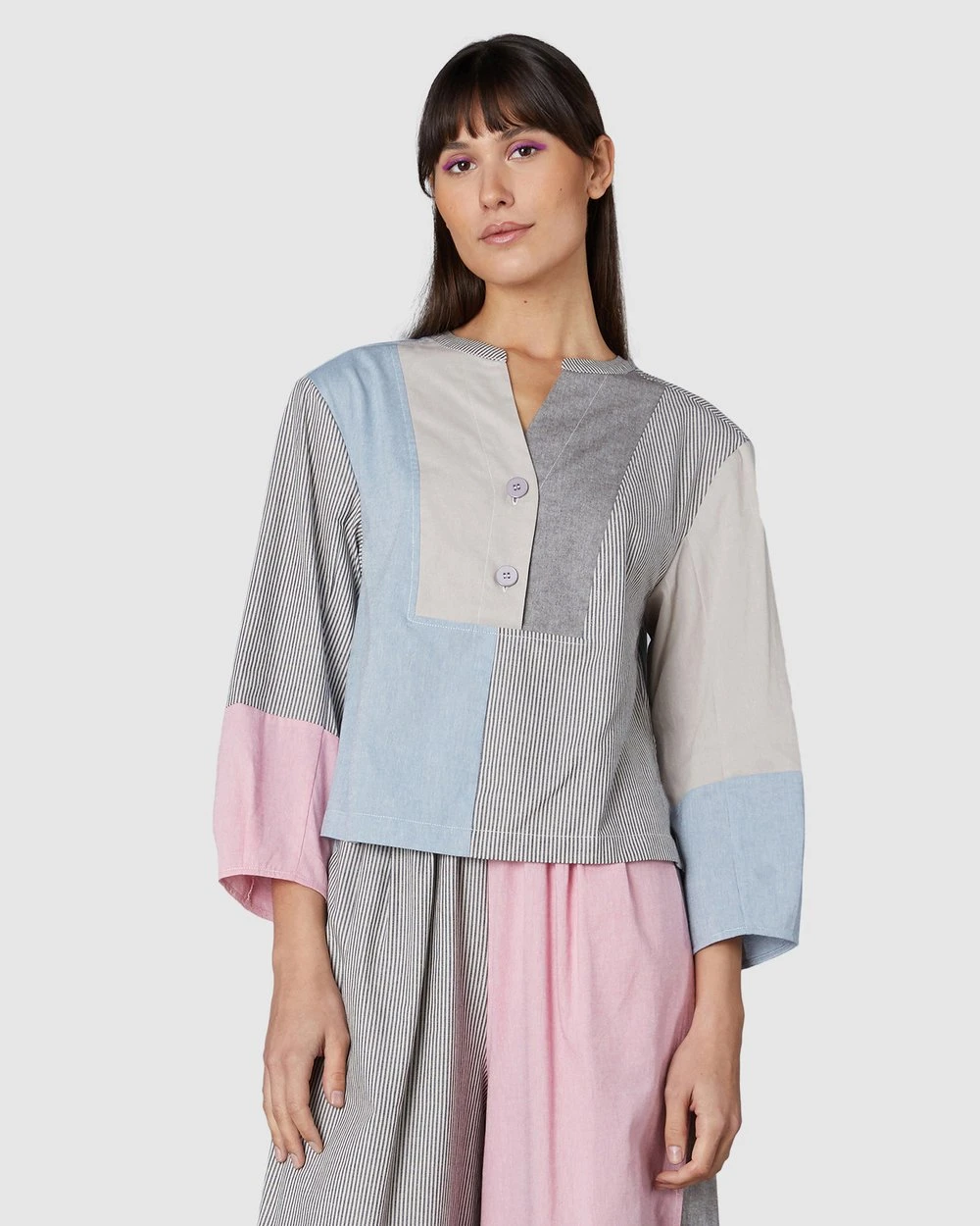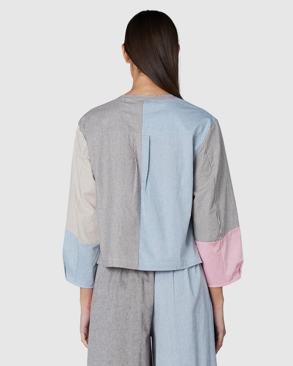 The Clipped Chambray Top by Gorman is a spliced organic cotton chambray top. This top has balloon sleeves with a spliced seam detail, a rounded neckline with collar stand, organic cotton yarn-dye chambray fabrication, front yoke shaping and a front button opening.