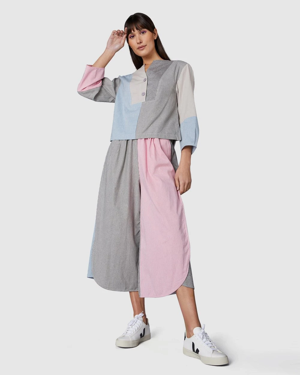 Our model is wearing a size AU 8. They usually take a standard AU 8/Small, and are 5’10” (179cm) tall, with 80cm bust, 64cm waist and 94cm hips.