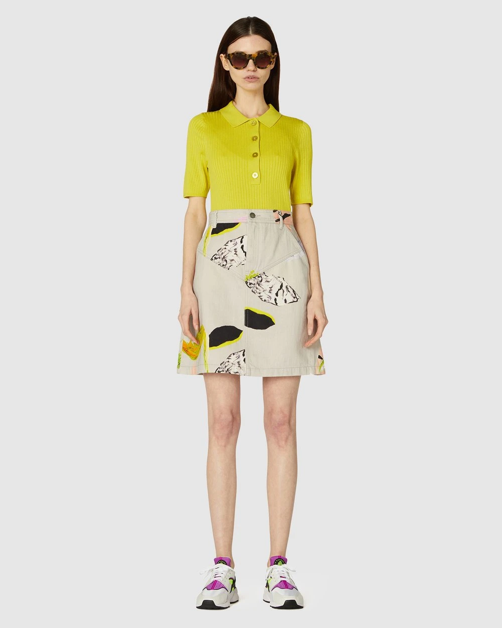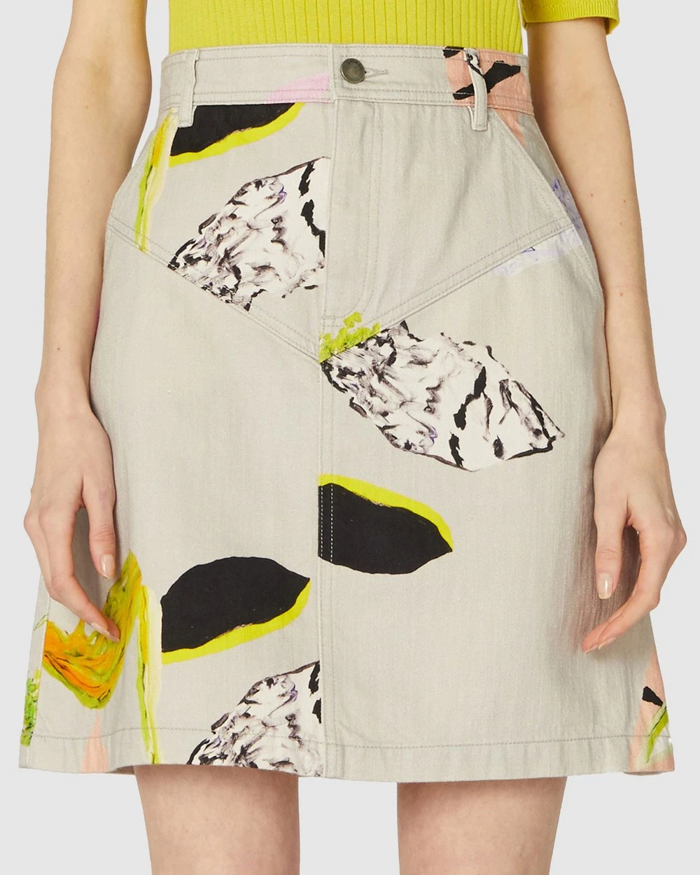 The Floret Denim Skirt by Gorman is a printed organic cotton twill skirt. This skirt has organic cotton denim twill fabrication, mini skirt length, front yoke seam shaping, front slant pockets, button fly front opening, belts loops, back patch pockets and an a-line silhouette.