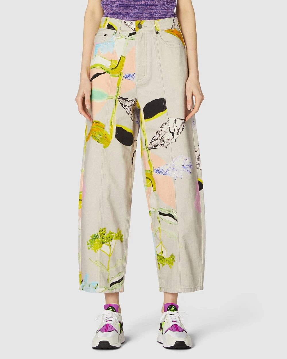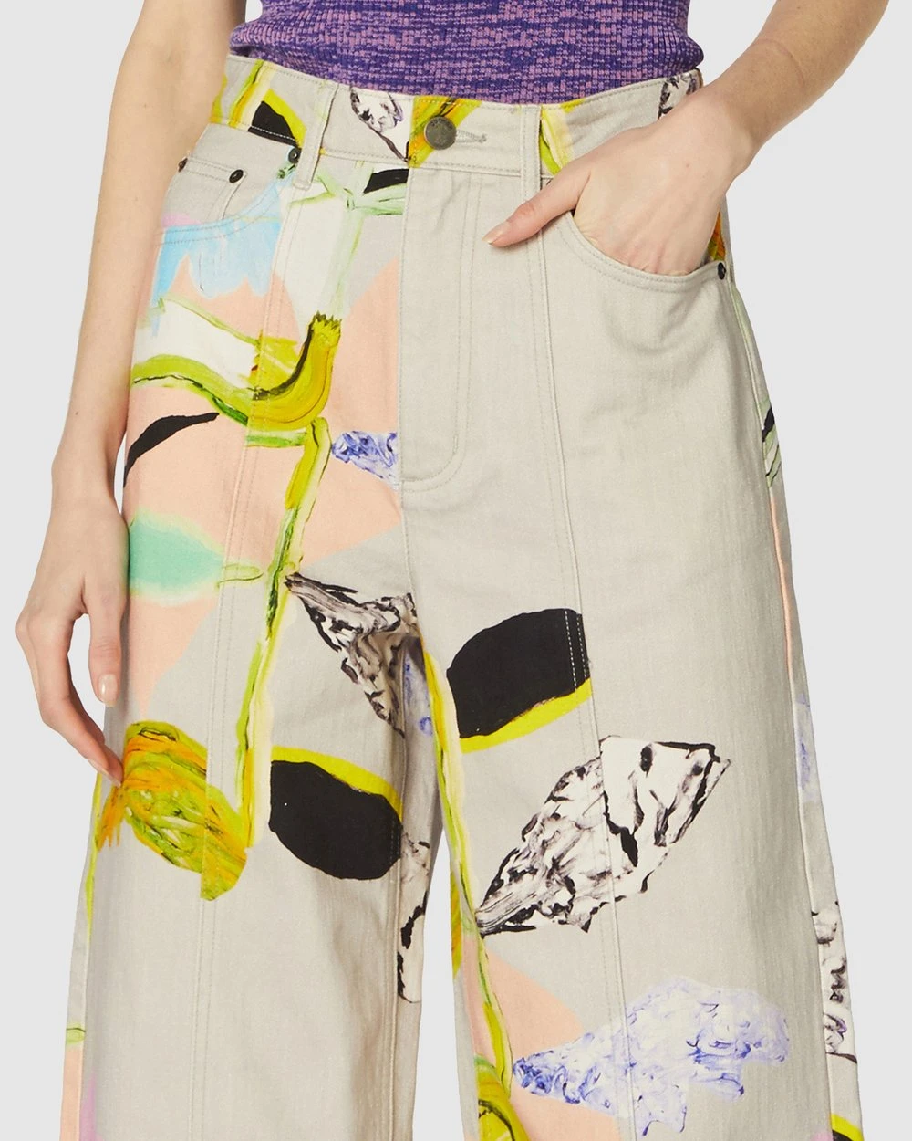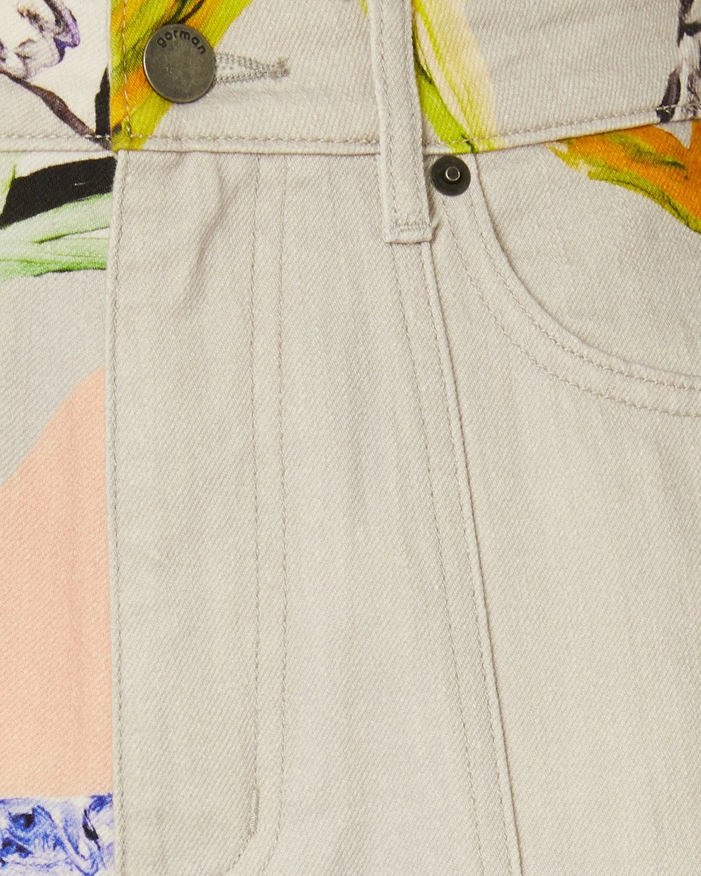 The Floret Jeans by Gorman are printed organic cotton jeans. This pair of jeans has a tapered leg cut, organic cotton denim twill fabrication, high-waisted rise, front slanted pockets, front leg seam shaping, a fitted waitband with belt loops, button fly front opening and back patch pockets.