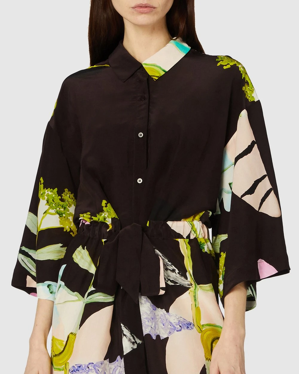 The Floret Shirt Dress by Gorman is a printed viscose silk blend dress. This dress has viscose silk sandwashed fabrication, a loose, relaxed silhouette, length that finishes below the knee, a full collar neckliine, front button placket opening, drop shoulders, cropped kimono sleeve shaping, an adjustable tie at waistline and an exclusive gorman x kaitlin johnson print.