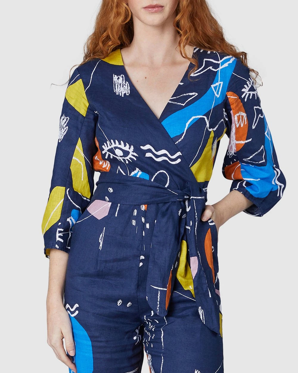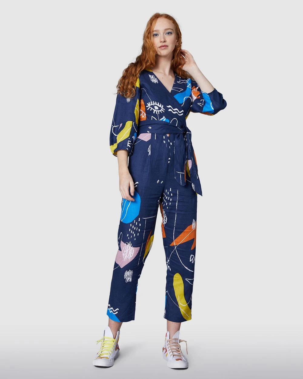 The Incomplete Thought Pantsuit by Gorman is a printed linen wrap pantsuit. This pantsuit features a zipper opening at back neckline, soft v-neckline shaping, side tie detail, side seam pockets, light gathering at waistline, faux wrap front, and balloon sleeves.