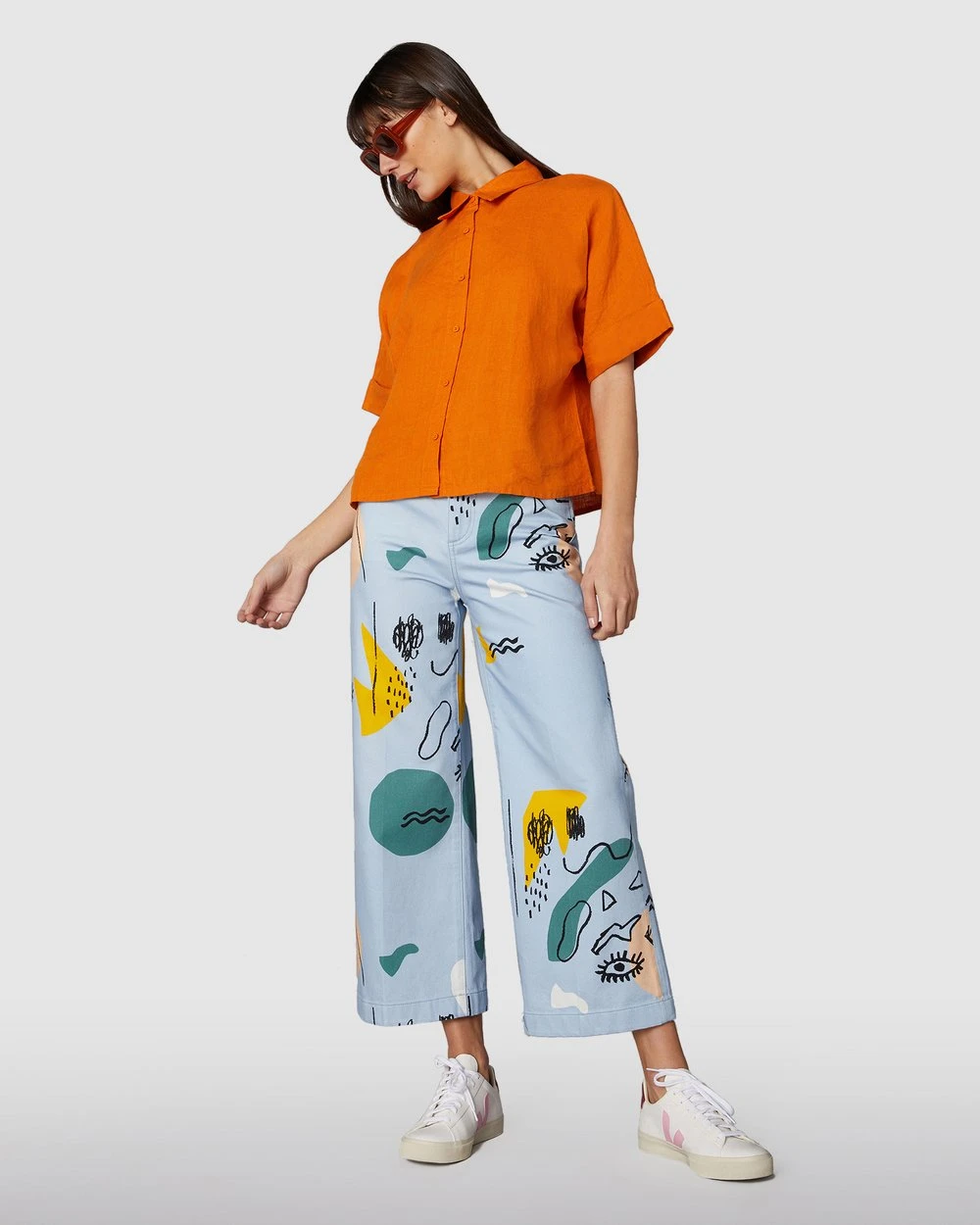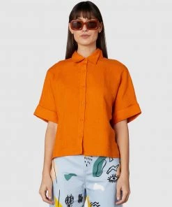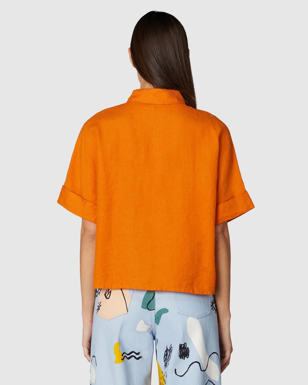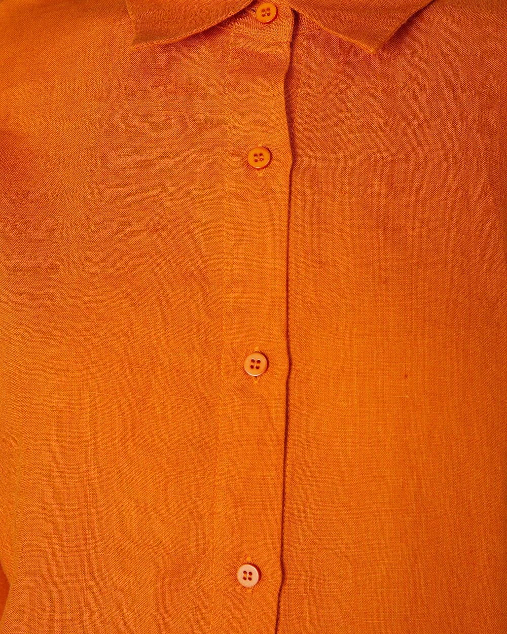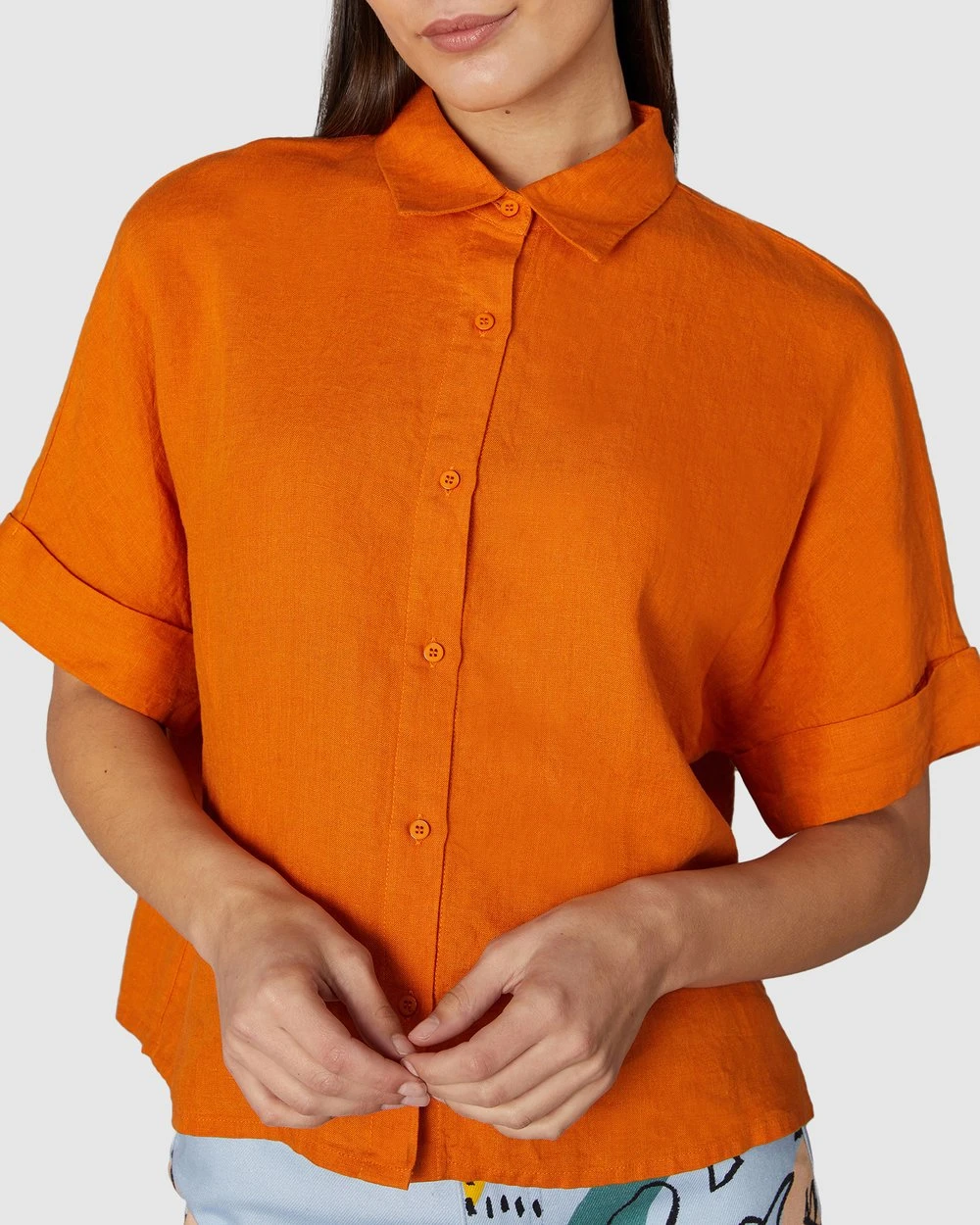 The Kate Shirt by Gorman is an everyday linen shirt. This shirt has short extension sleeves, breathable and lightweight natural linen fabrication, loose, oversized style, length finishes at the hip, a collar neckline and a button front placket opening.