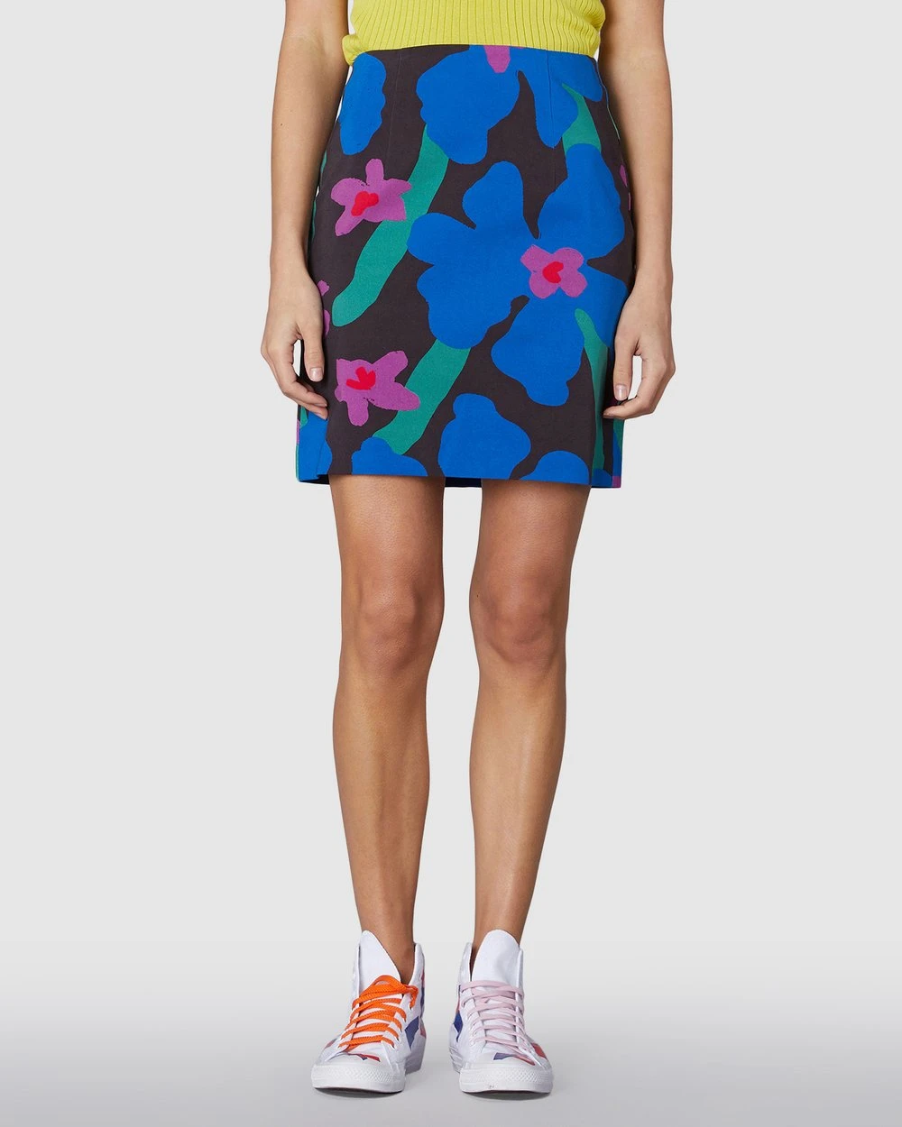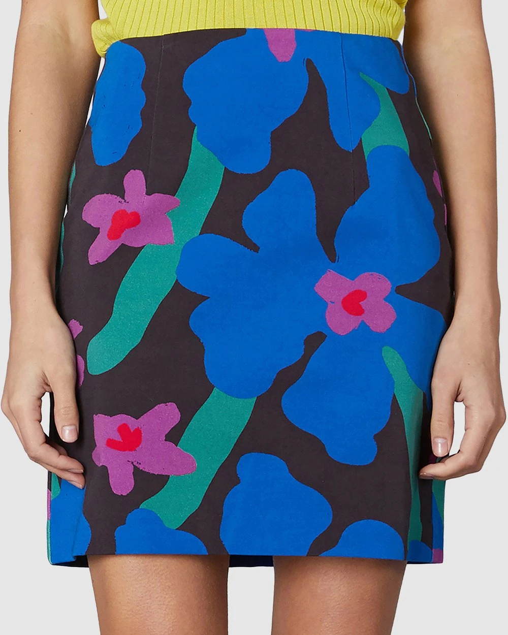 The Lawn Daisy Mini Skirt by Gorman is a printed organic cotton mini skirt. This skirt has organic cotton elastane twill fabrication, mini skirt length, invisible zip at back waistline, darts at waistline, an a-line silhouette and an exclusive gorman print.