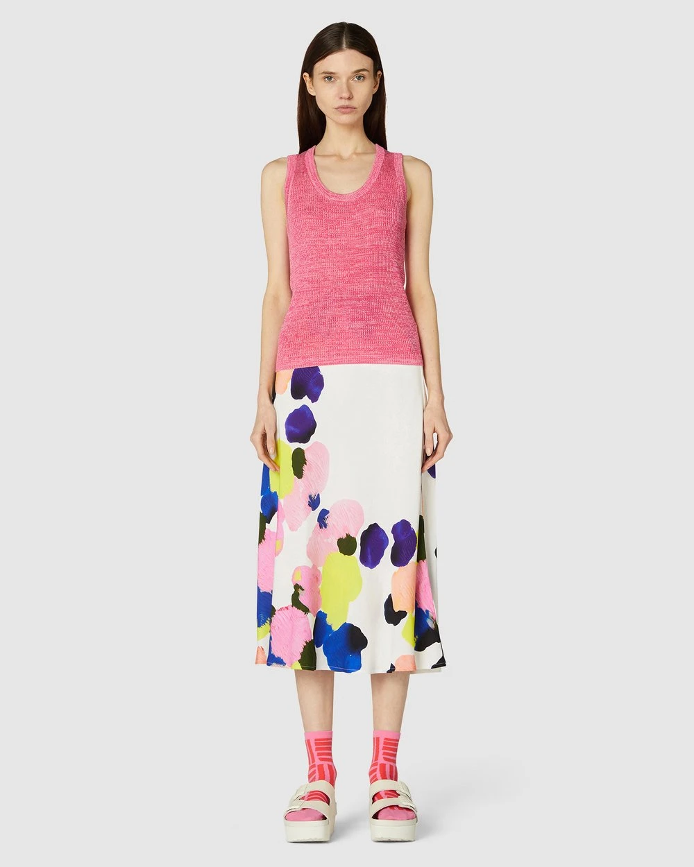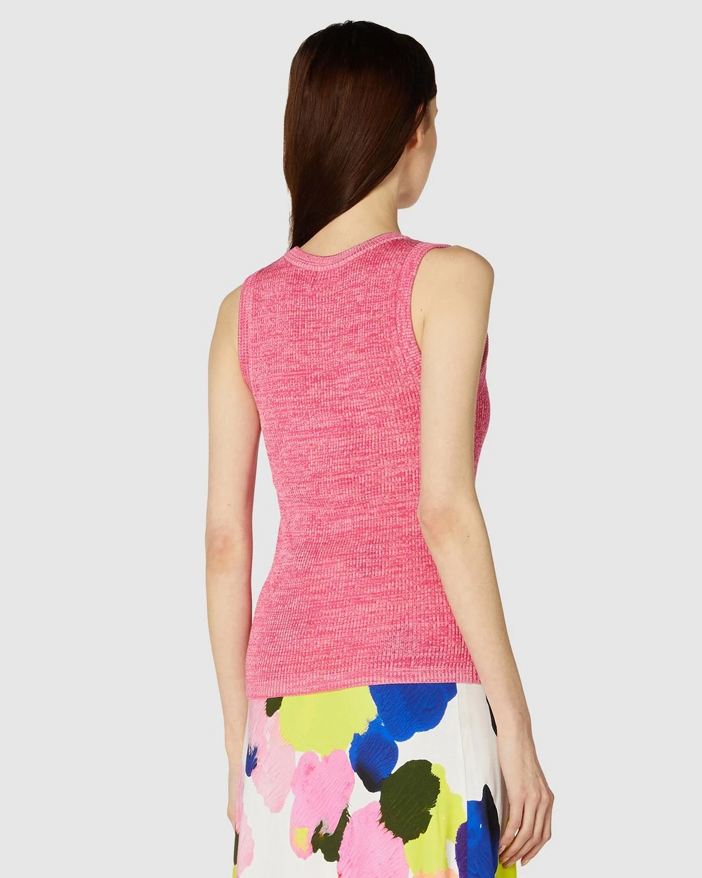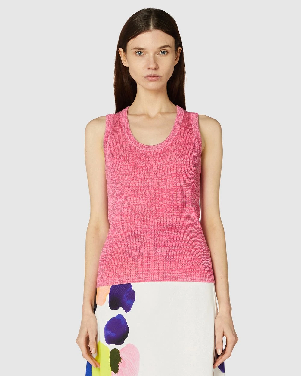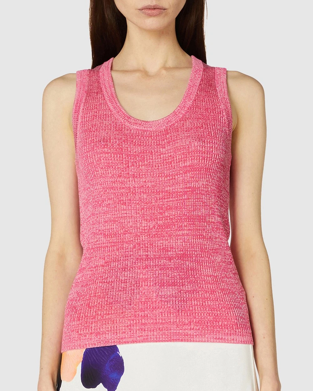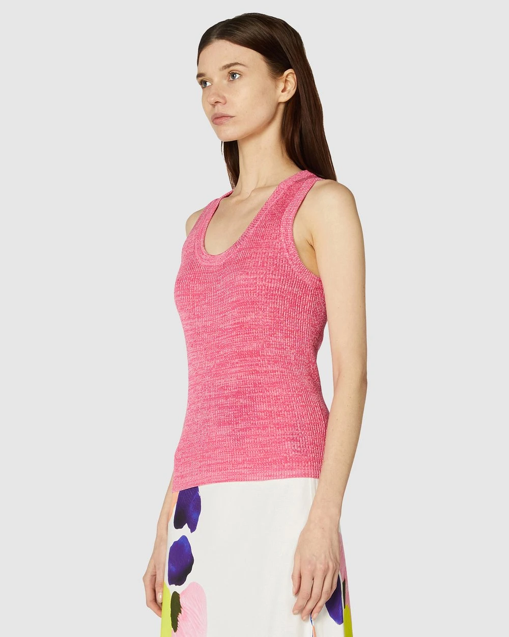 The Miriam Knit Tank by Gorman is a knitted lyocell tank top. This tank has sustainable lyocell yarn composition, a sleeveless cut, ribbed stitch finish around the neck and arm holes and a dropped scoop neckline.