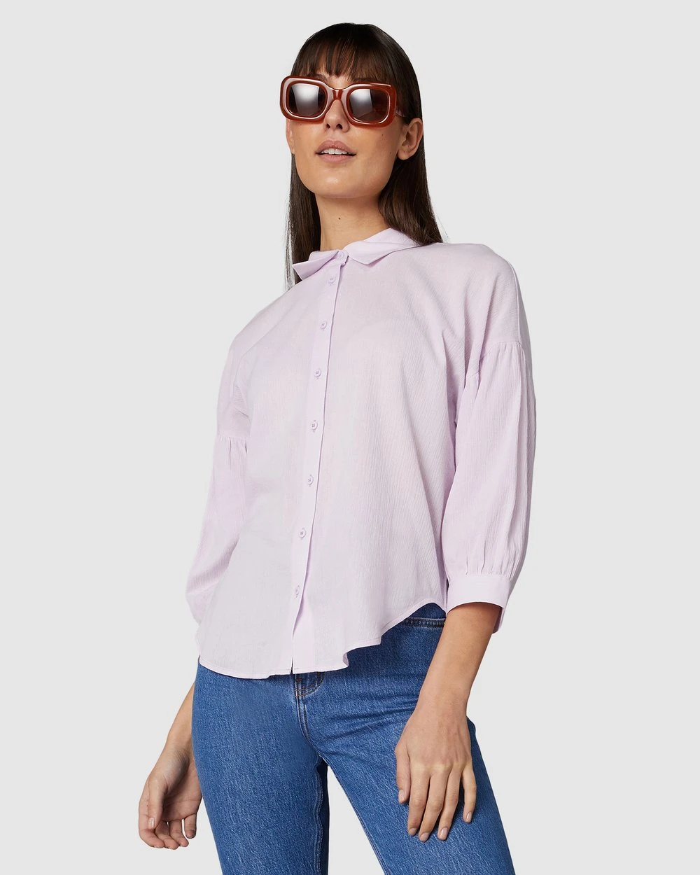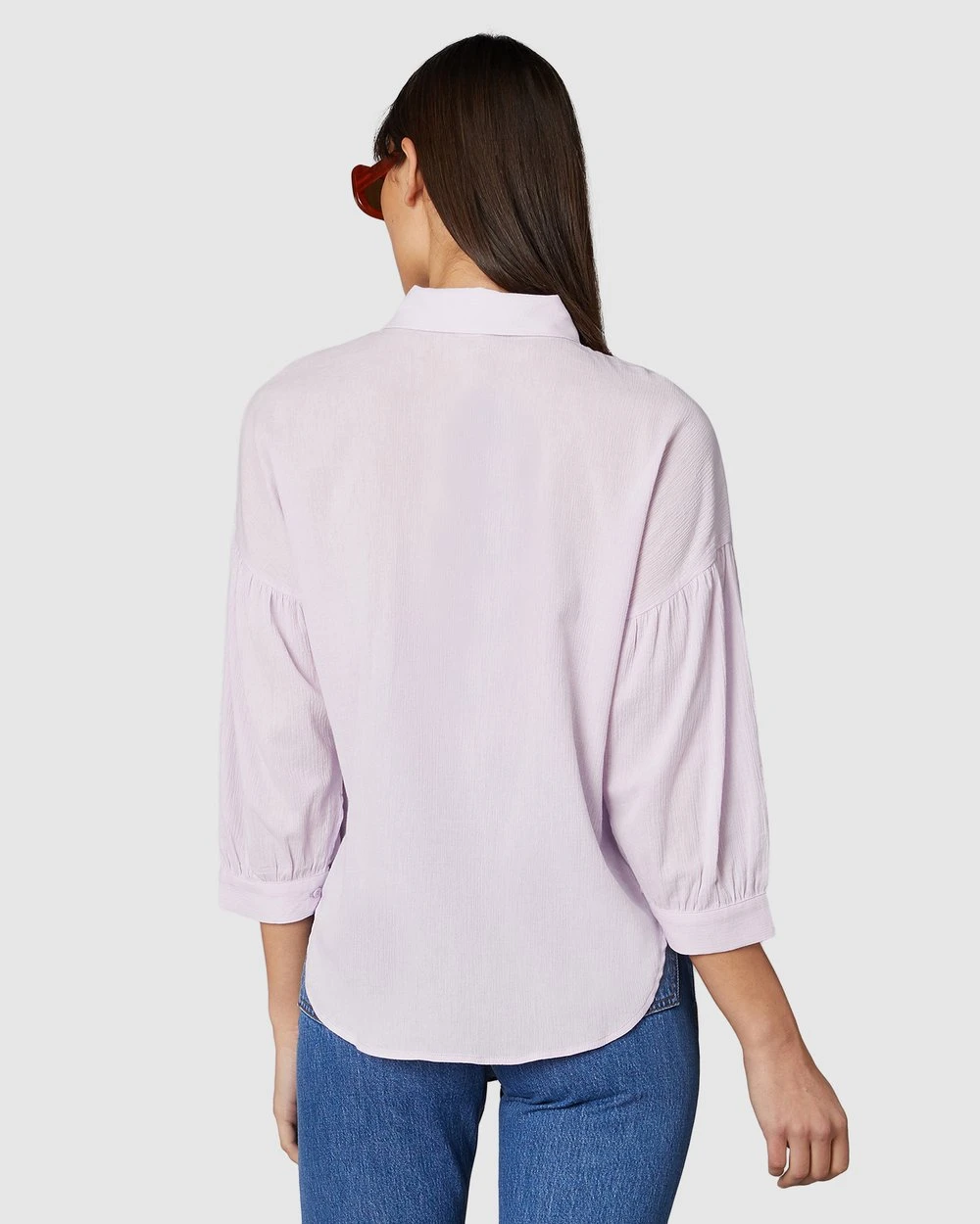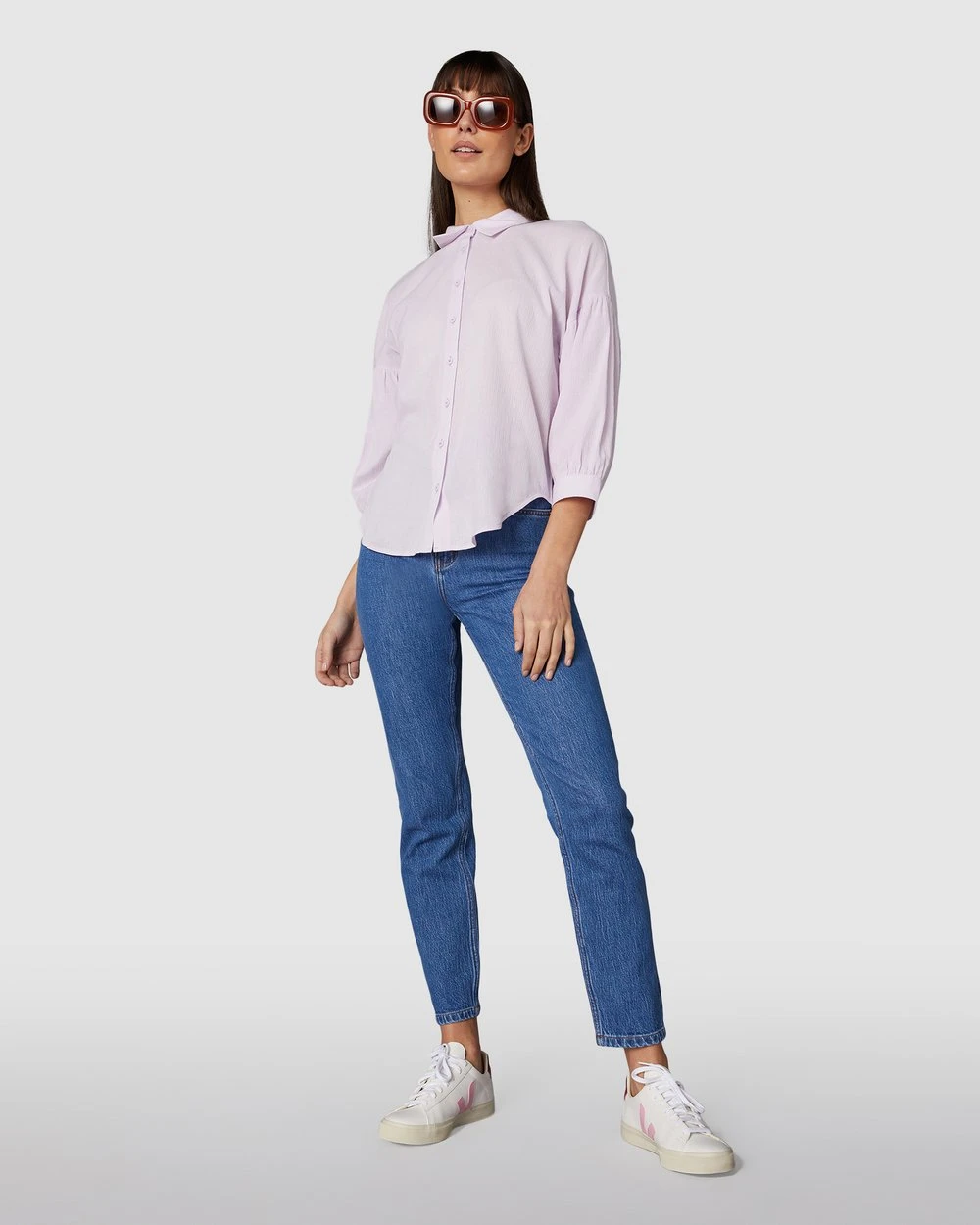 The Quinn Shirt by Gorman is a organic cotton cheesecloth shirt. This blouse has a shirt collar neckline, placket opening at the sleeve cuffs, organic cotton cheesecloth fabrication, drop shoulder style, a curved shirt hemline, cropped sleeve length, button front placket opening and box pleats at the back bodice.