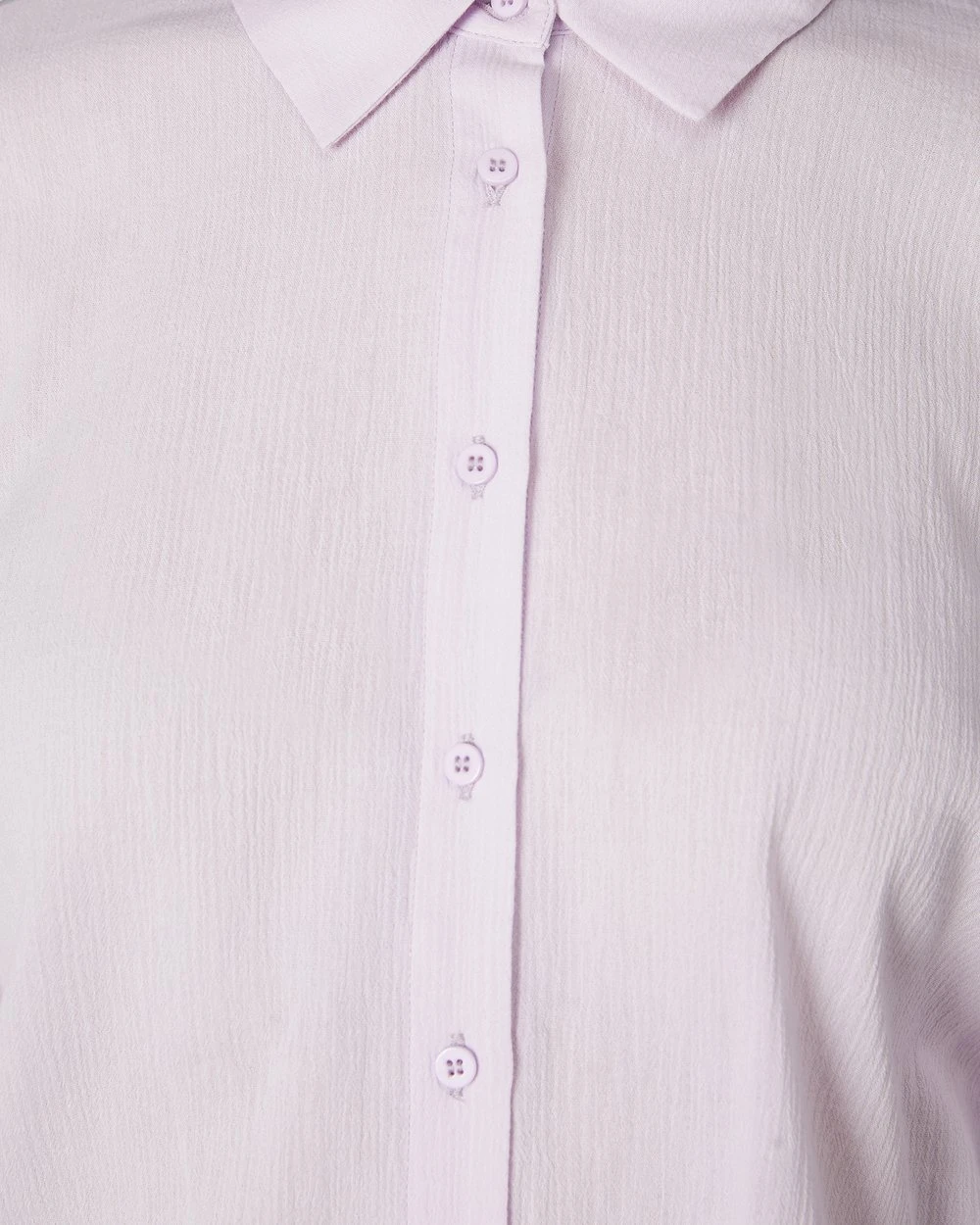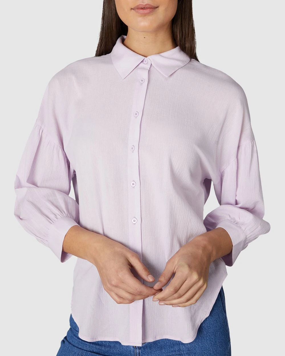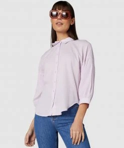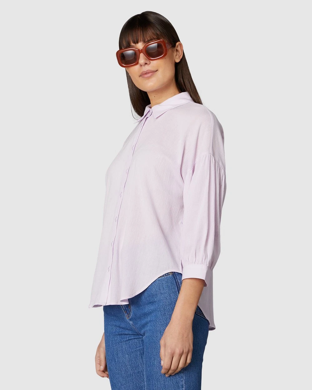 The Quinn Shirt by Gorman is a organic cotton cheesecloth shirt. This blouse has a shirt collar neckline, placket opening at the sleeve cuffs, organic cotton cheesecloth fabrication, drop shoulder style, a curved shirt hemline, cropped sleeve length, button front placket opening and box pleats at the back bodice.