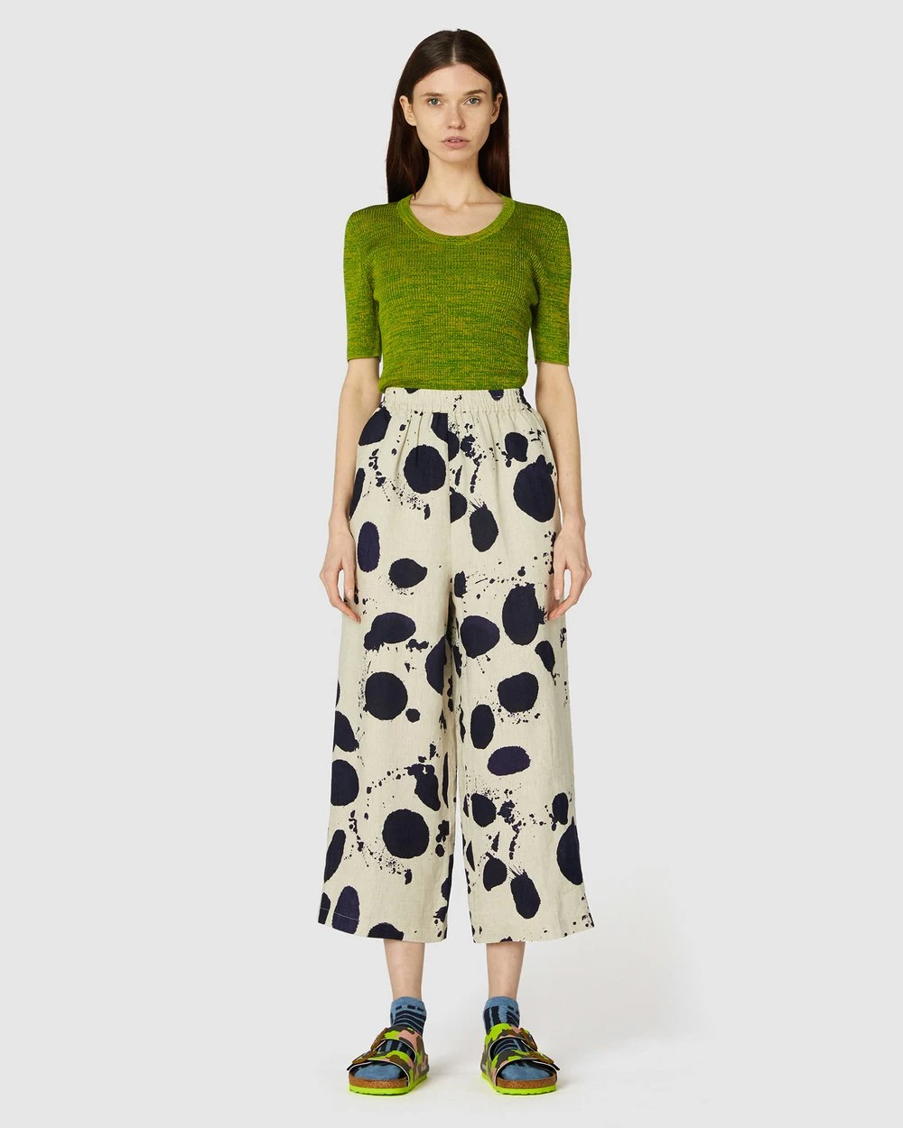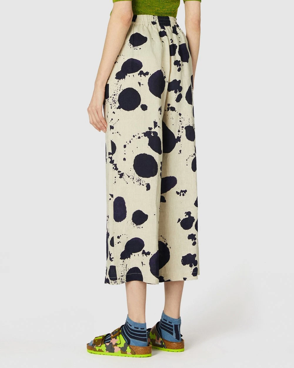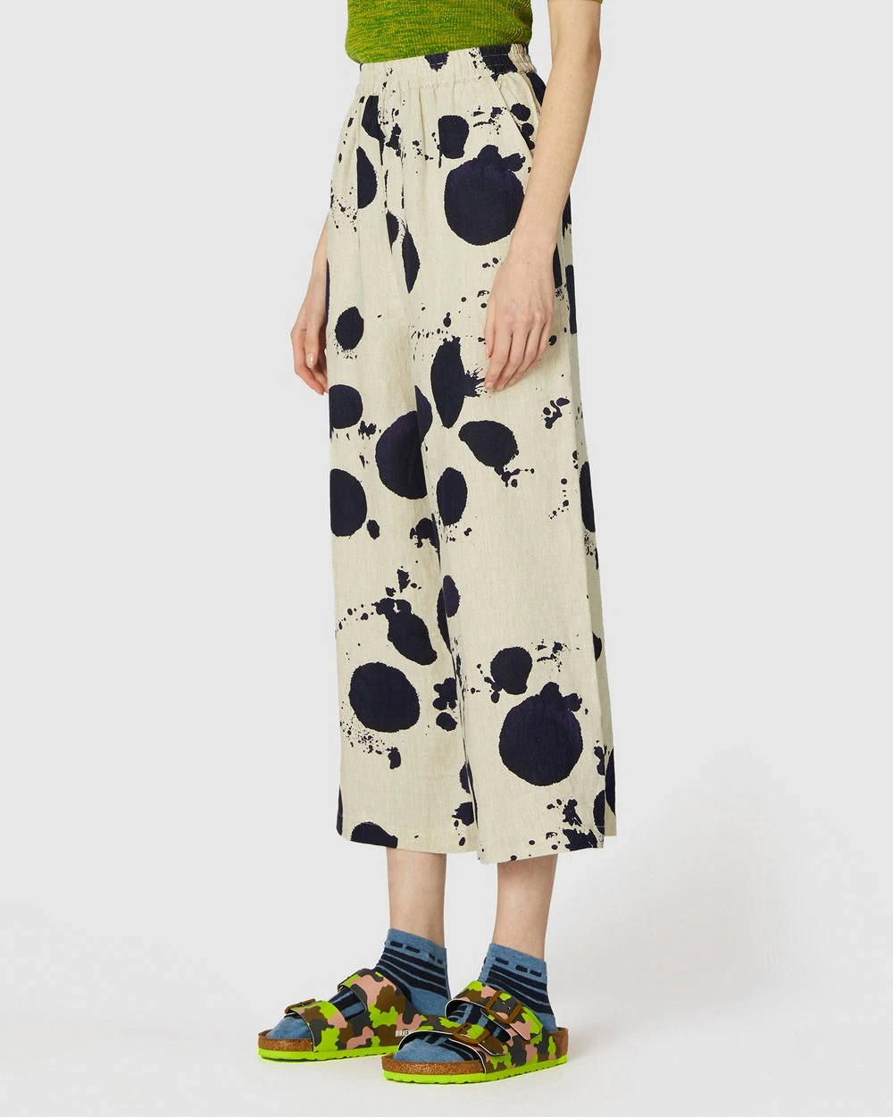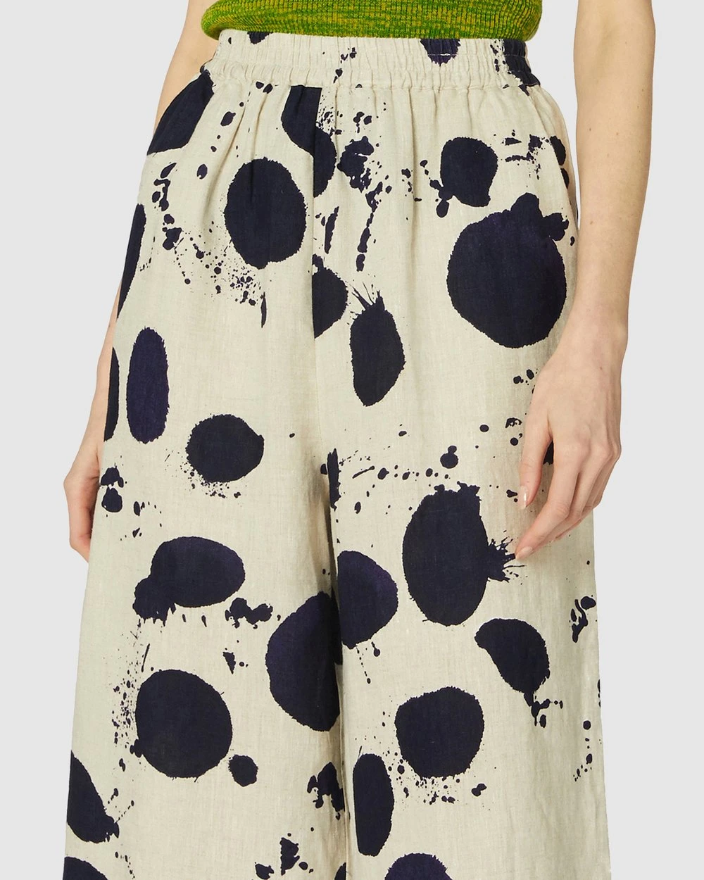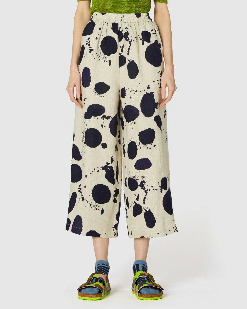 The Squeaky Clean Pants by Gorman are a printed natural linen pant. This pair of pants has side seam pockets, natural oatmeal linen fabrication, a loose leg cut, light gathering at the waistline, high-waisted rise, an exclusive gorman print and an elasticated waistband.