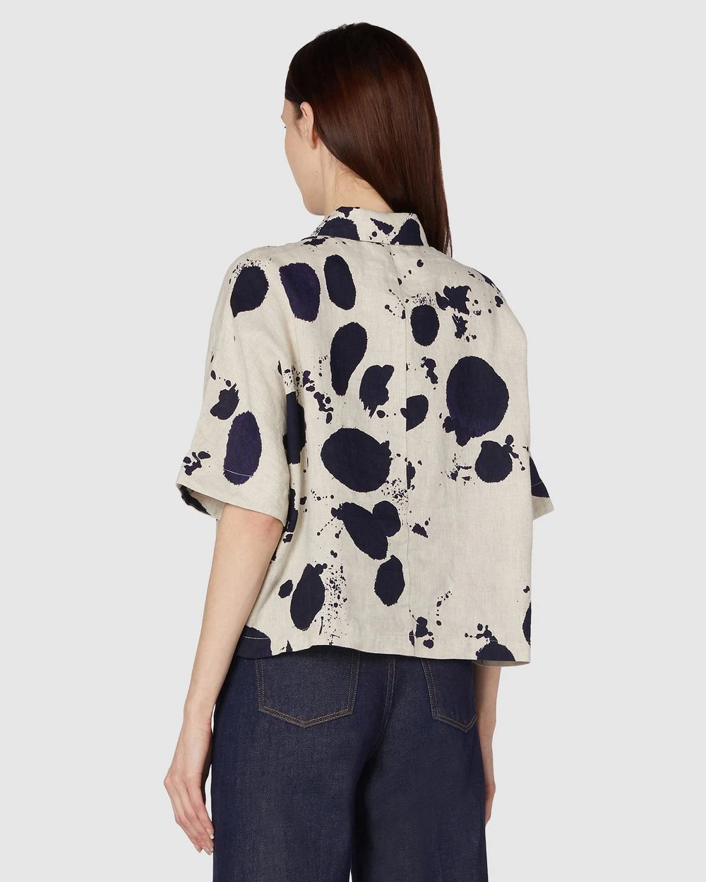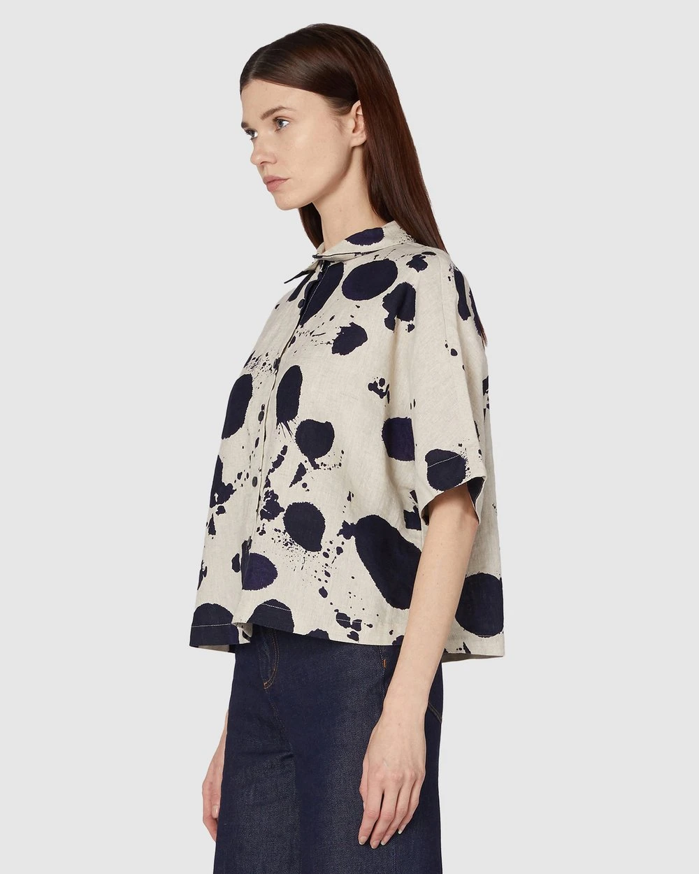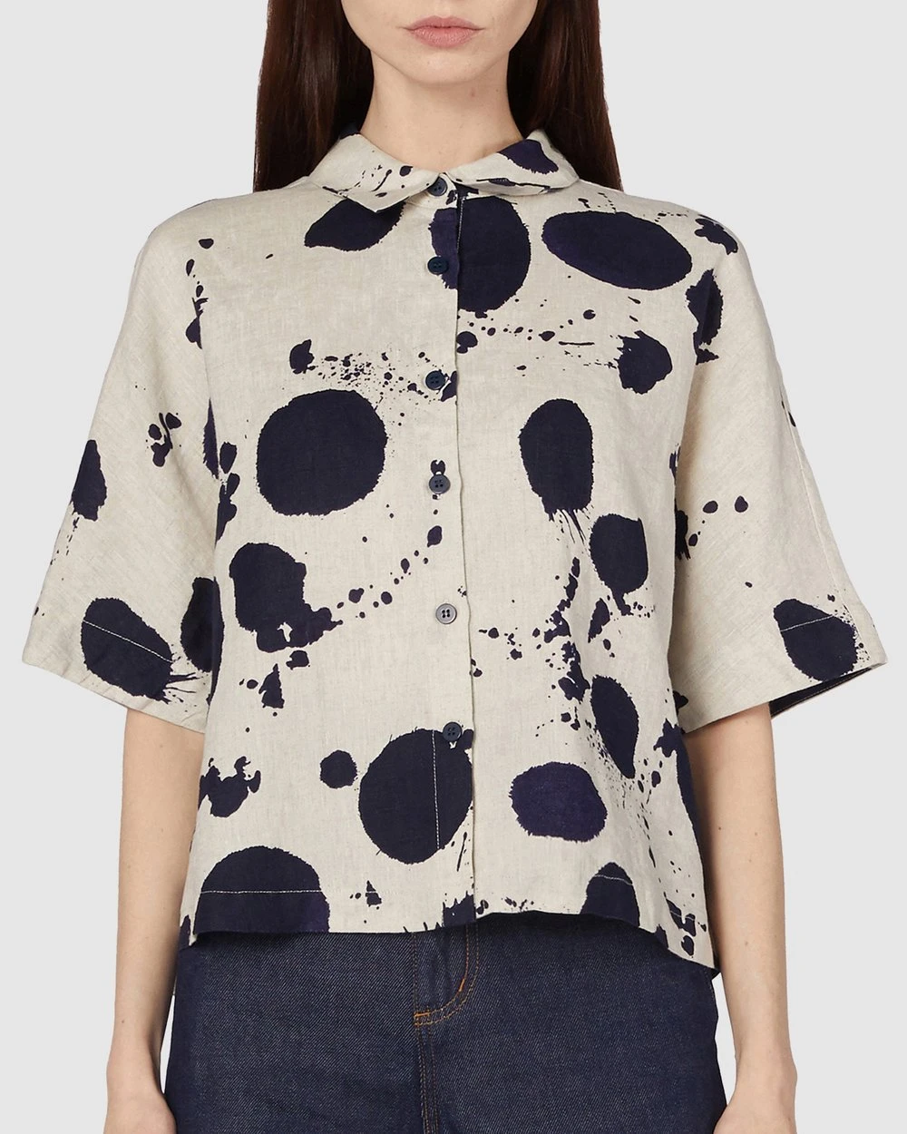 The Squeaky Clean Shirt by Gorman is a printed natural linen shirt. This shirt has short extension sleeves, rolled cuff detailing, natural oatmeal linen fabrication, a full collar neckline, front button placket opening, an exclusive gorman print and cropped length.