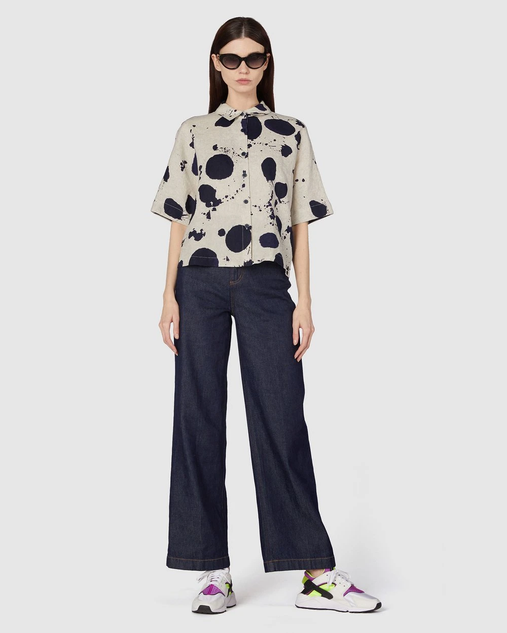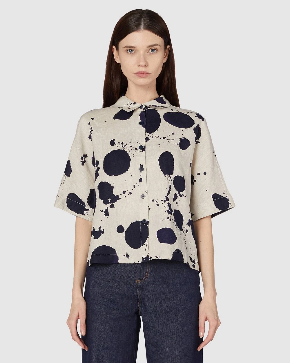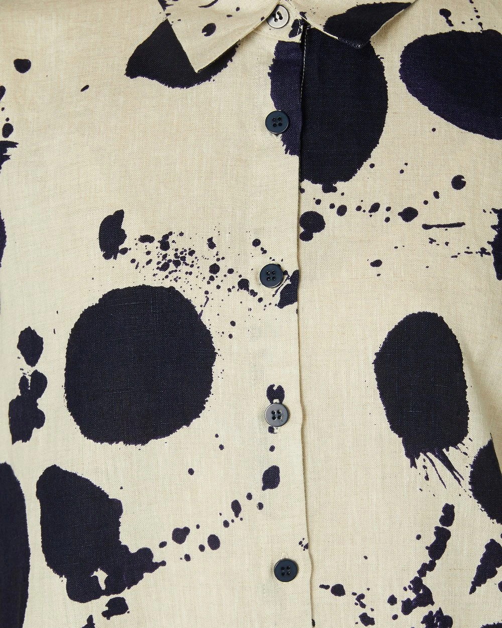The Squeaky Clean Shirt by Gorman is a printed natural linen shirt. This shirt has short extension sleeves, rolled cuff detailing, natural oatmeal linen fabrication, a full collar neckline, front button placket opening, an exclusive gorman print and cropped length.