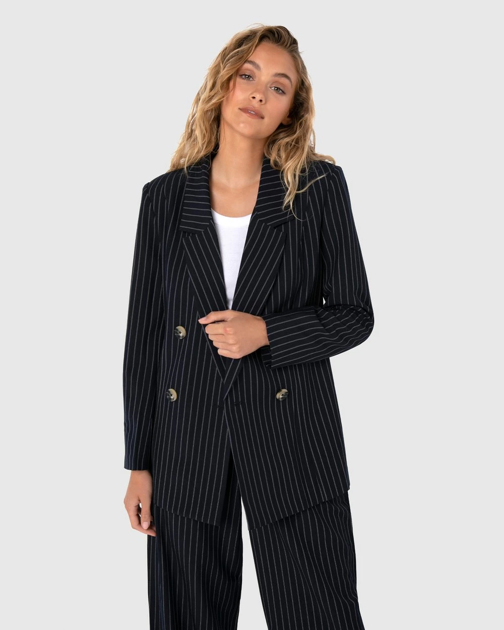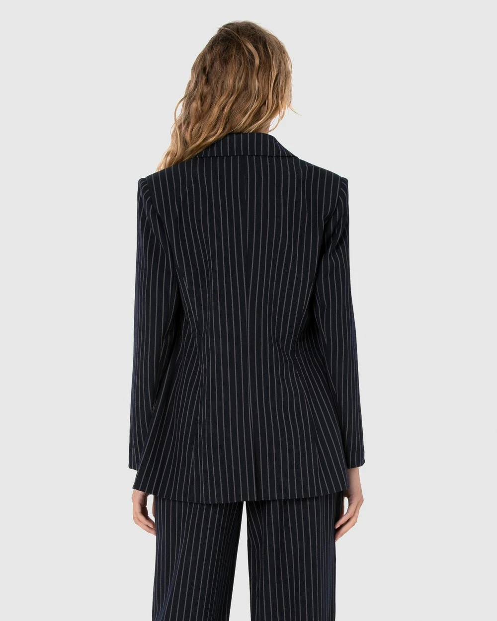 Embrace your inner girl boss with the Madalin Blazer by Madison The Label. This pinstriped beauty has a slight relaxed fit, long sleeves and tortoiseshell style buttons. Pair with matching pants and heels for a business chic style.