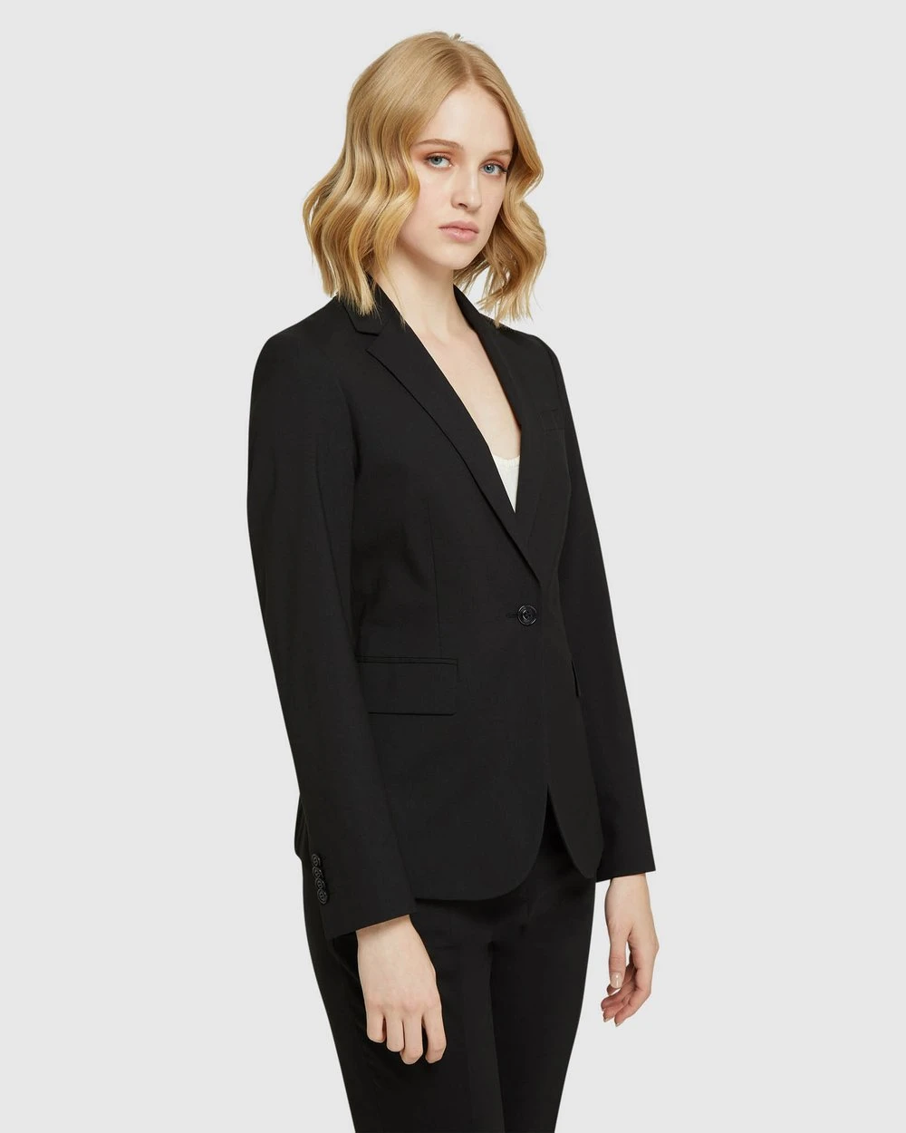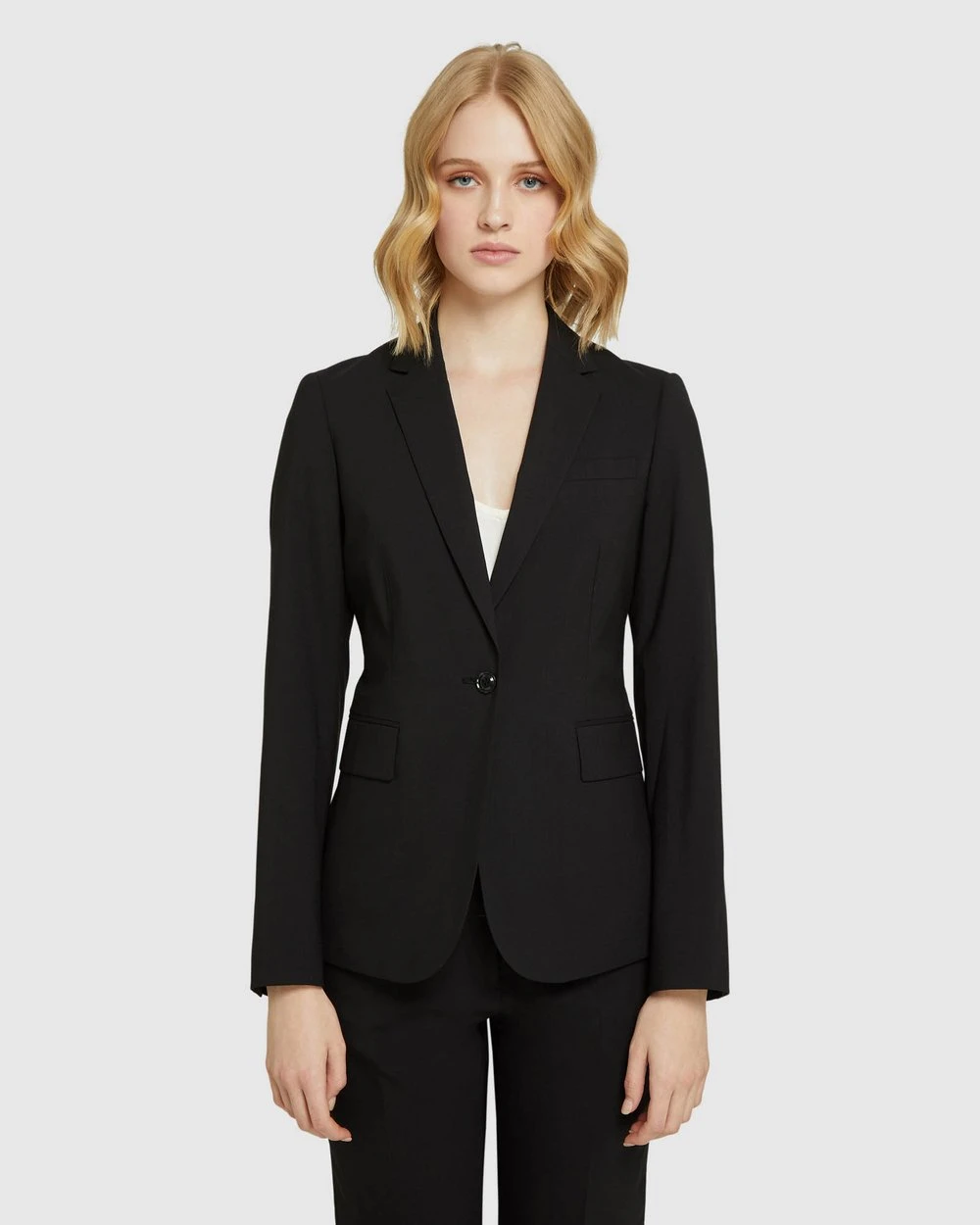 Update your working wardrobe with the Alexa Black Wool Stretch Suit Jacket by Oxford, crafted from a wool blend with added stretch in a slim fit, it features a slim lapels and single button fastening.