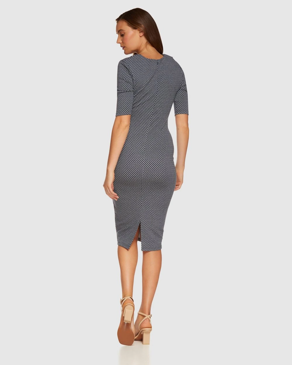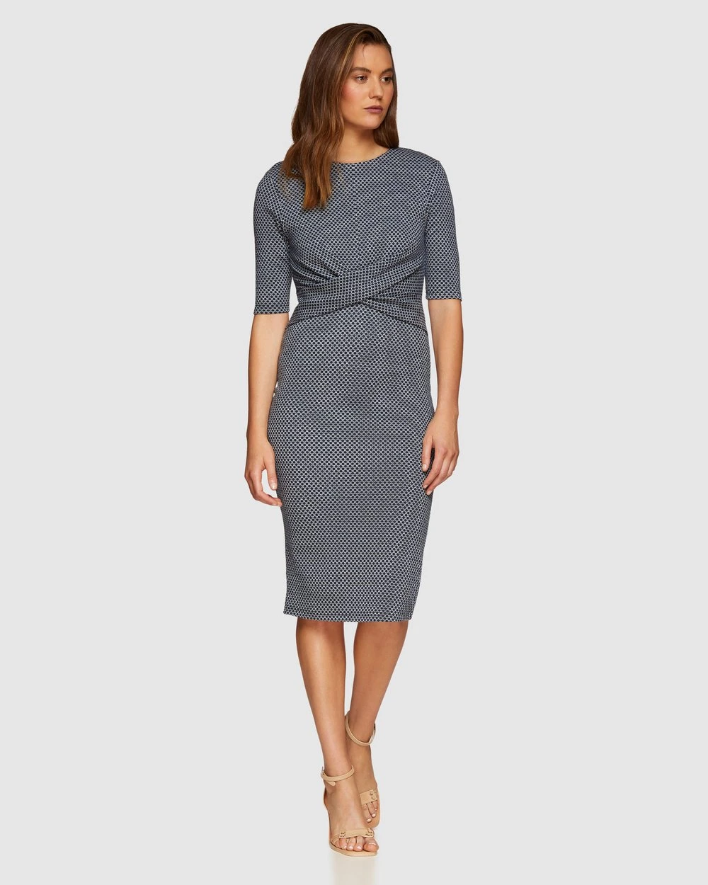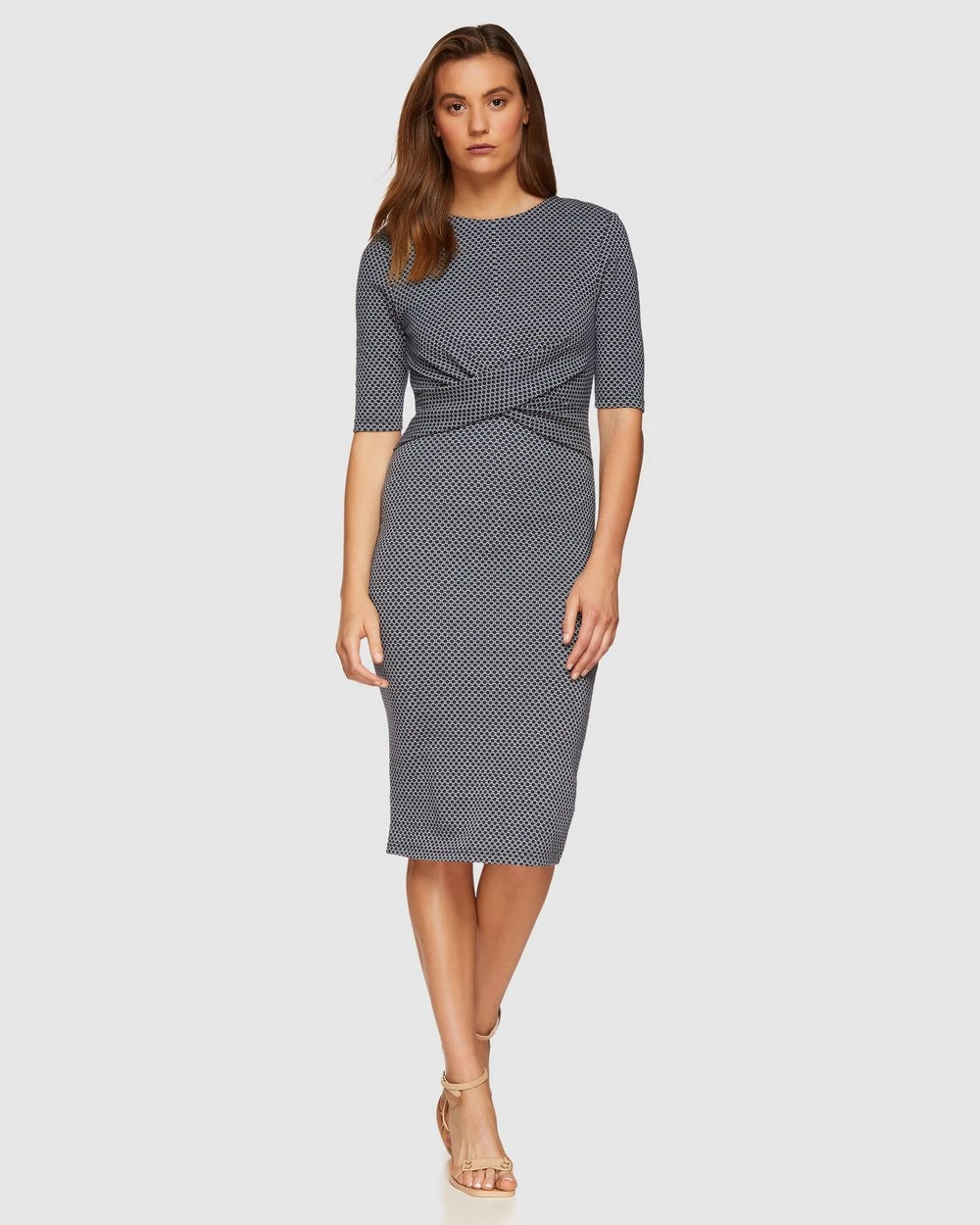 Striking and stylish, the Oxford Annie Stretch Knit Geo Dress is an elegant look perfect for work or play. This flattering knee-length dress with an intricate geometric pattern gathers beautifully at the hips and features a gorgeous wrap detail at the waist that will accentuate your figure. Pair it with heels and a clutch to complete the look.