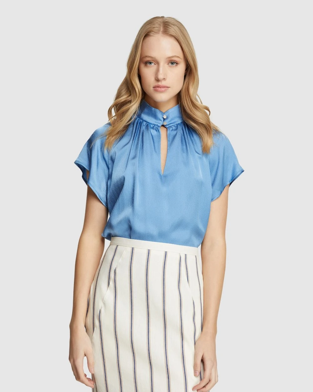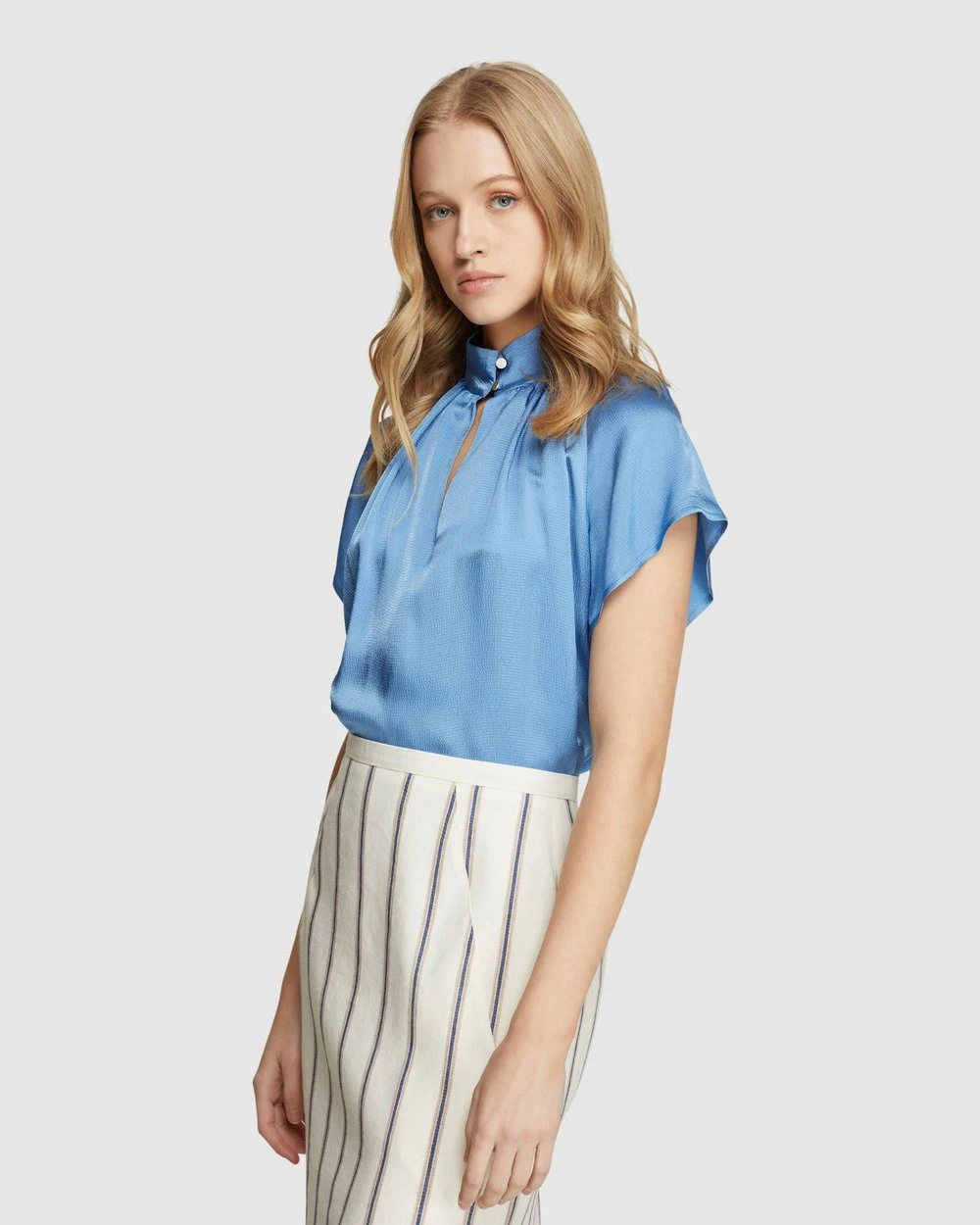 Make a statement in Ariela High Collar Blouse by Oxford. This elegant style is has a silky, textured finish and features a button-up mandarin collar, keyhole neckline, and wide capped sleeves.