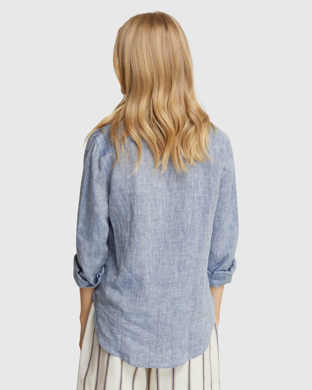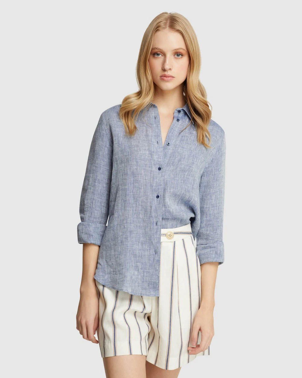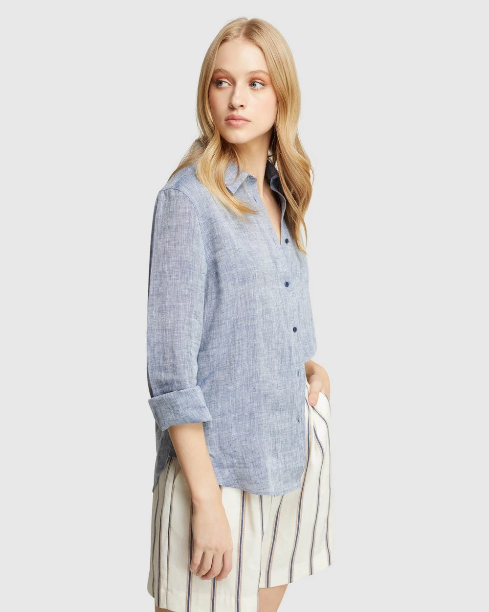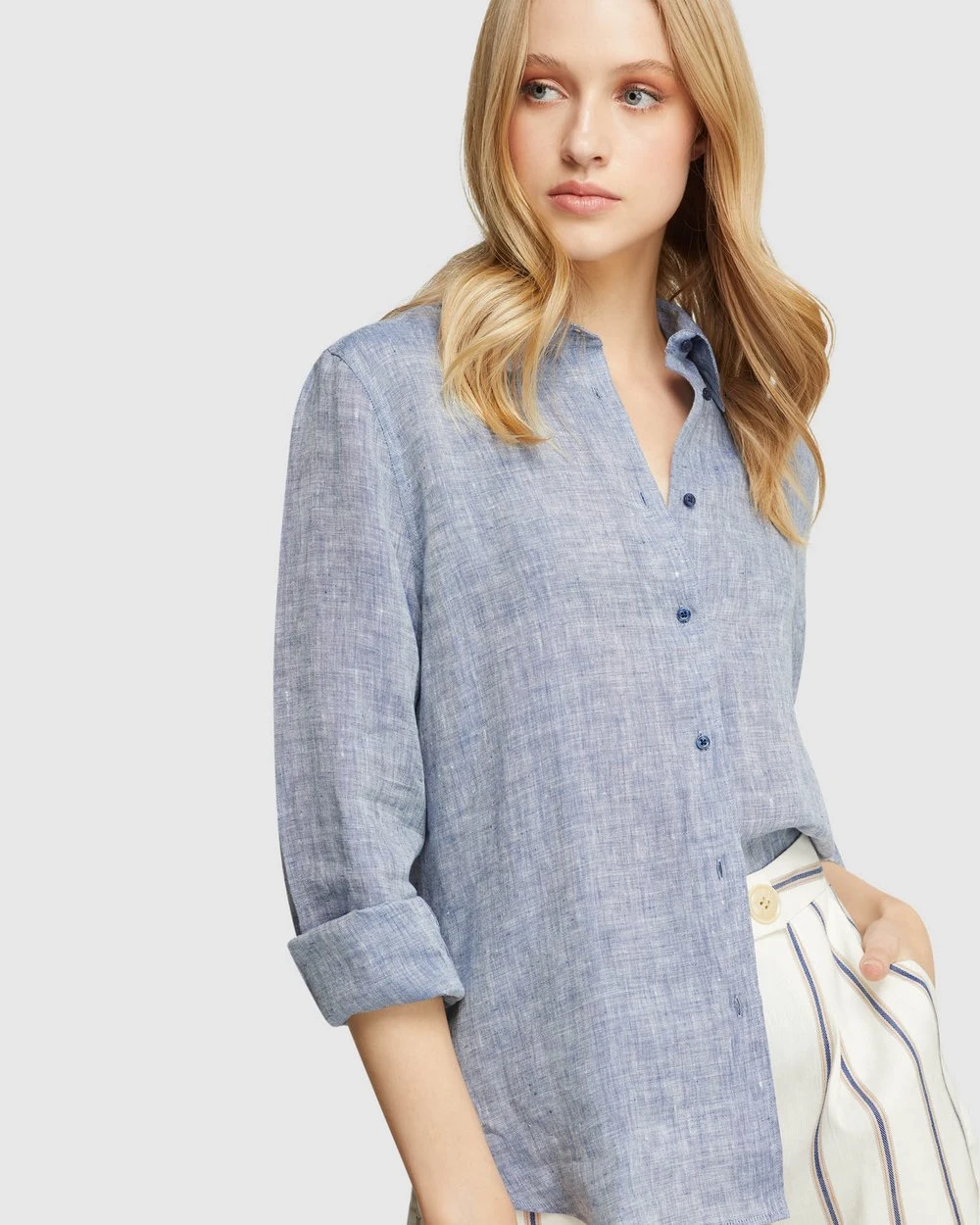 A timeless feminine style, the Arizona Pure Linen Shirt by Oxford is a must-have wardrobe item. This sleek Shirt is crafted from 100% linen with a melange finish and cut in a regular fit. It features large cuffs, contrast buttons and a small collar.