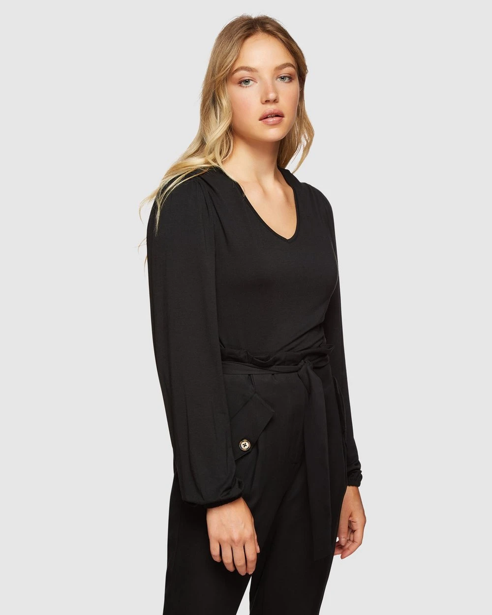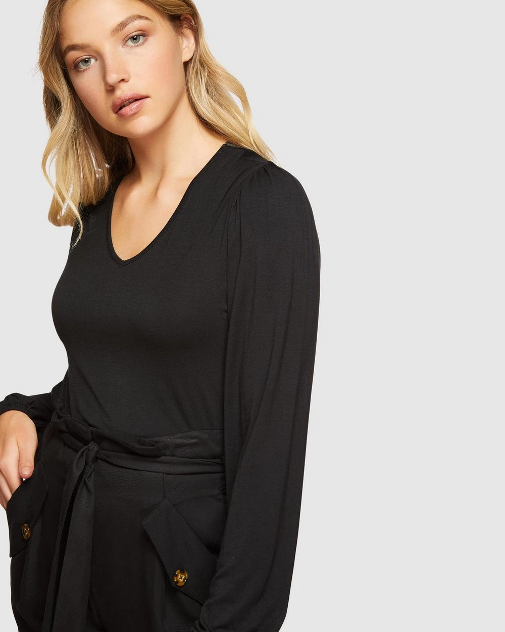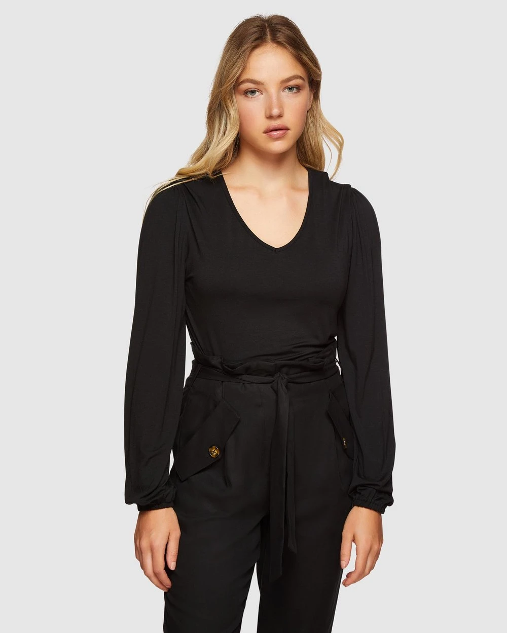 Update your staple collection with the Oxford Bella Long Sleeve T-Shirt. This elegant t-Shirt is a loose fit with v-neckline and long ballooned sleeves. Team yours with some high-waisted pants and heels for an effortless look at work or play.