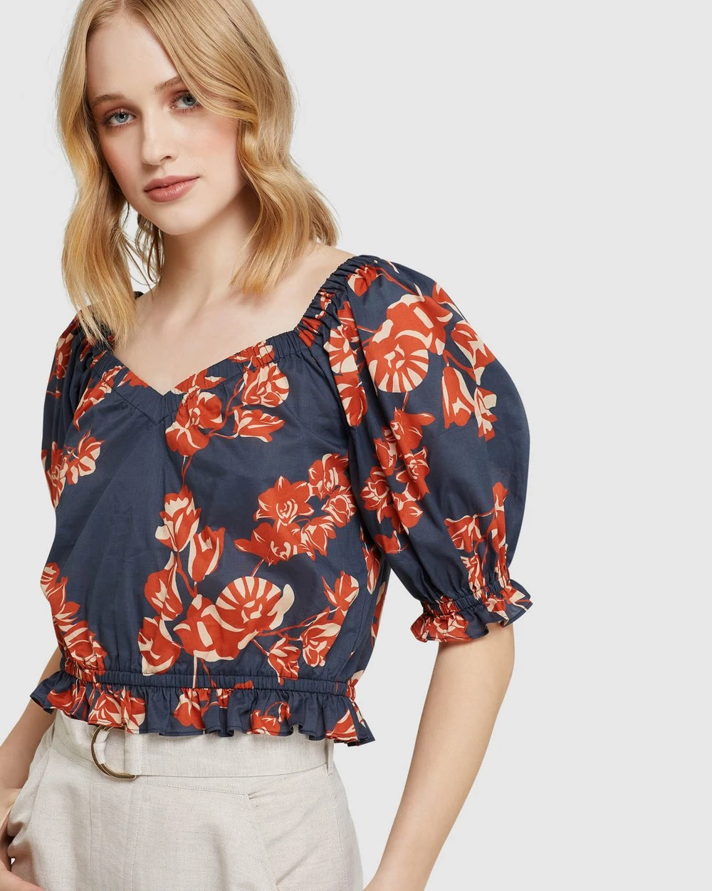 A gorgeous summer style, the Billy Tropical Print Cotton Top by Oxford, is crafted from 100% cotton in a cropped style with a wide neckline and puffy sleeves.