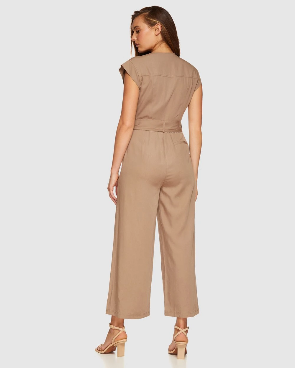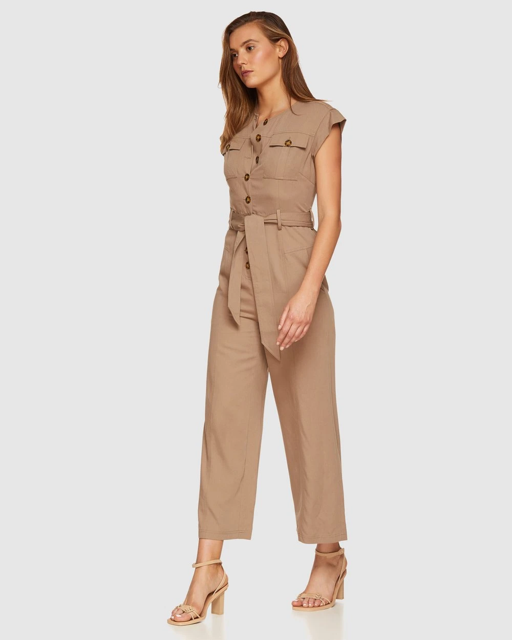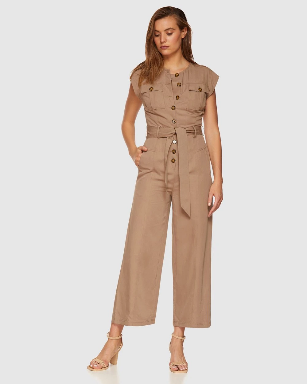 Reach the peak of hassle-free, stunning style in the Oxford Candice Jumpsuit. This close fitting jumpsuit in an olive hue features a wide leg and belted waist with contrast buttons, capped sleeves and a round neckline. All you need is a pair of simple heels to complete the look.