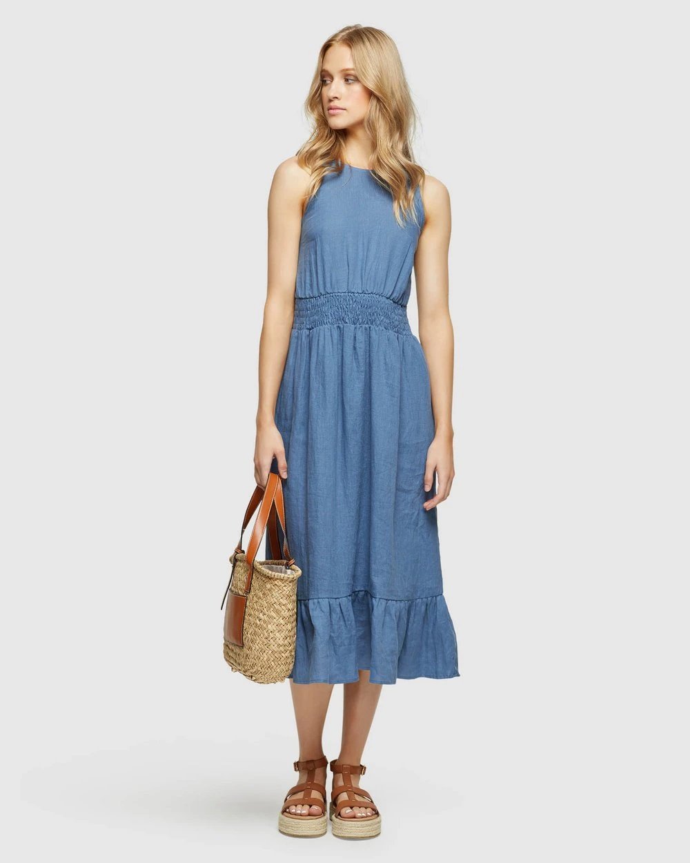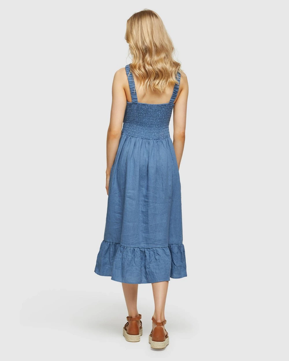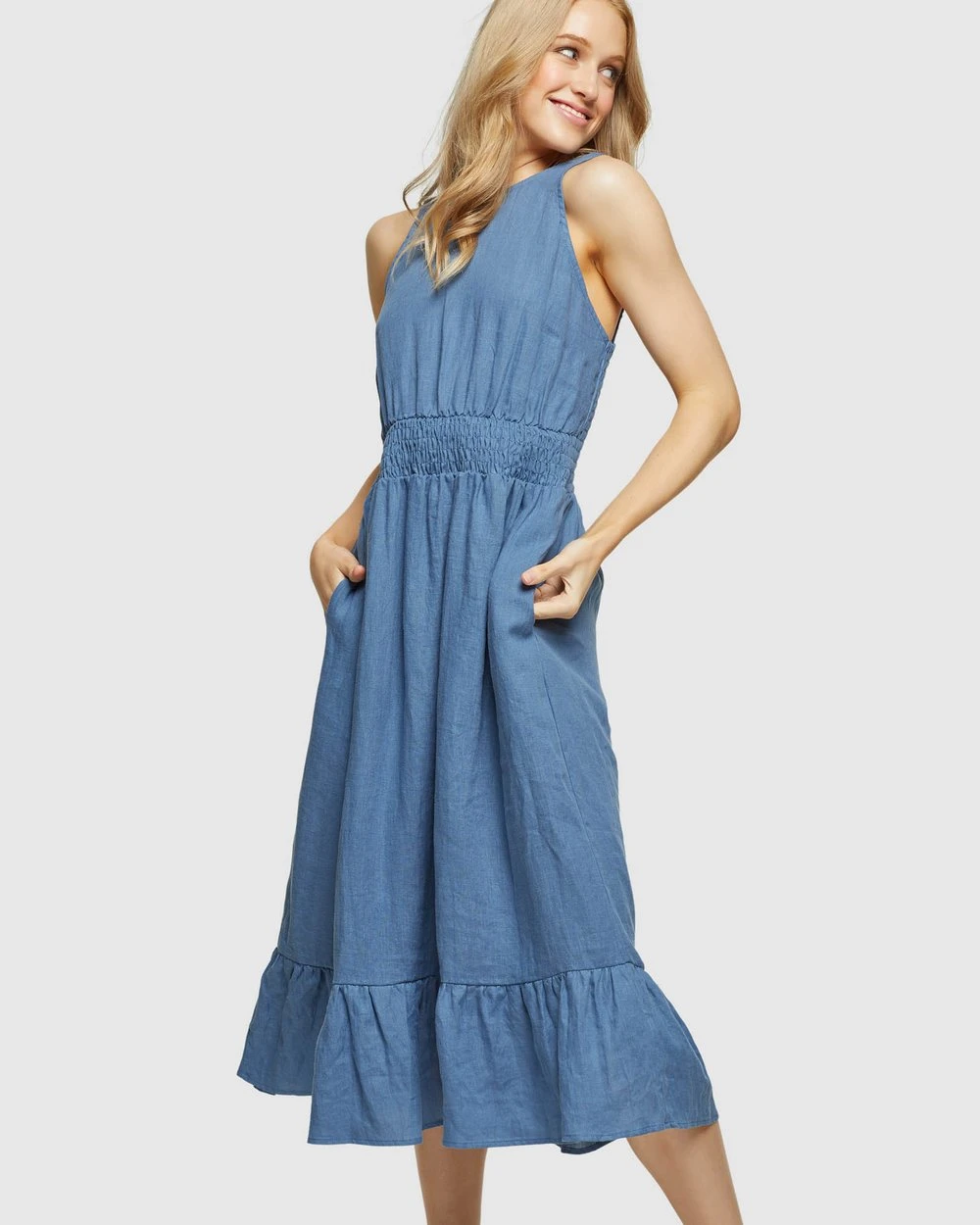 A gorgeous relaxed style, the Cara Linen Dress by Oxford is your dream summer dress. This effortless style is crafted from 100% linen and features elegant shirring detail through the front, back, and straps with an elastic waist, peplum hem, and side pockets.