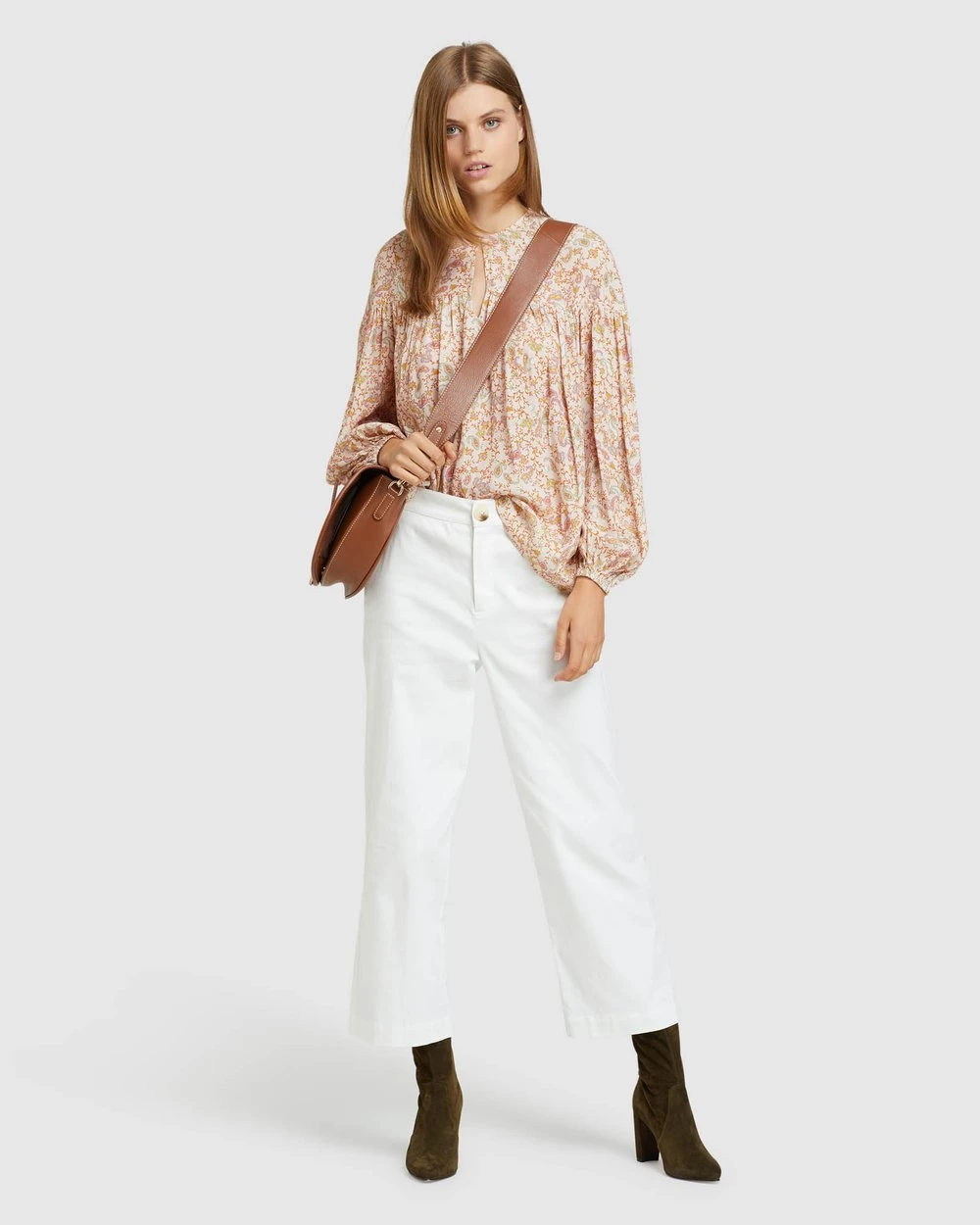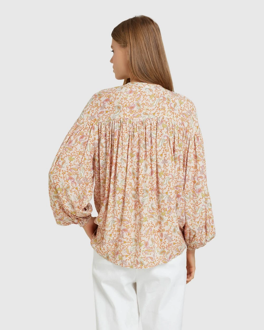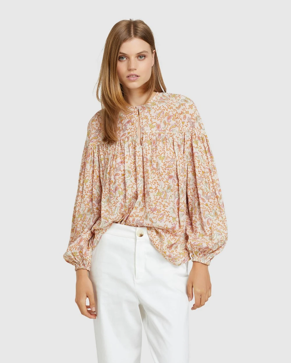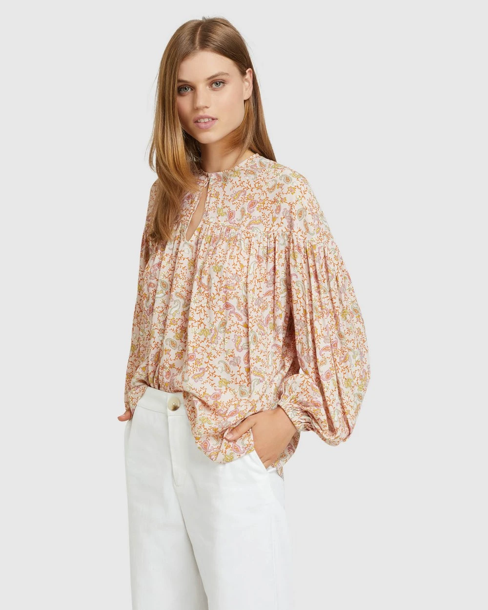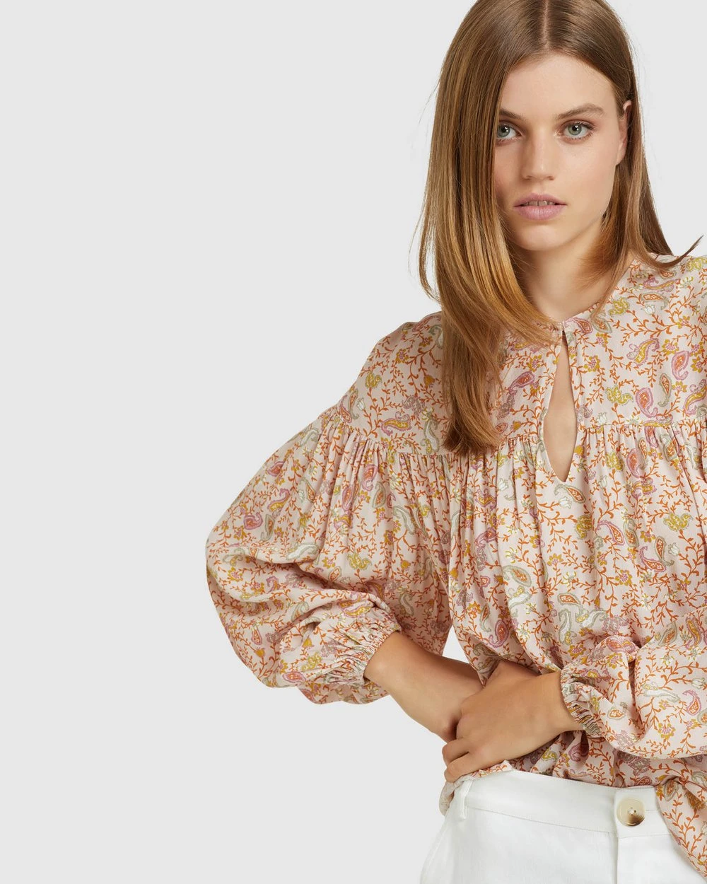 A gorgeous look with a boho feel, the Carina Paisley Printed Blouse by Oxford will take you from work to play. This relaxed fit blouse has a floral print and features a keyhole neckline, ballooned sleeves and a drapey feel.