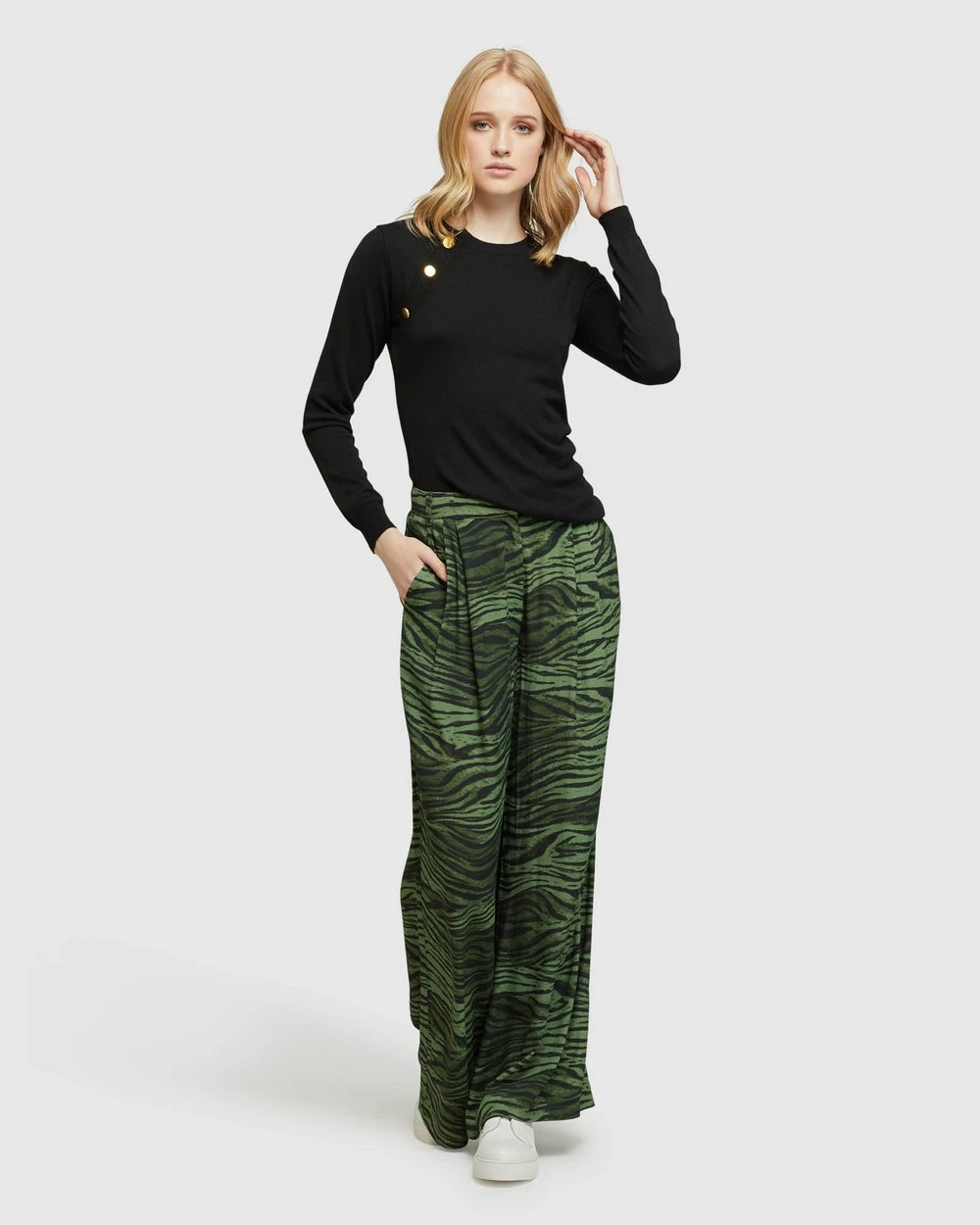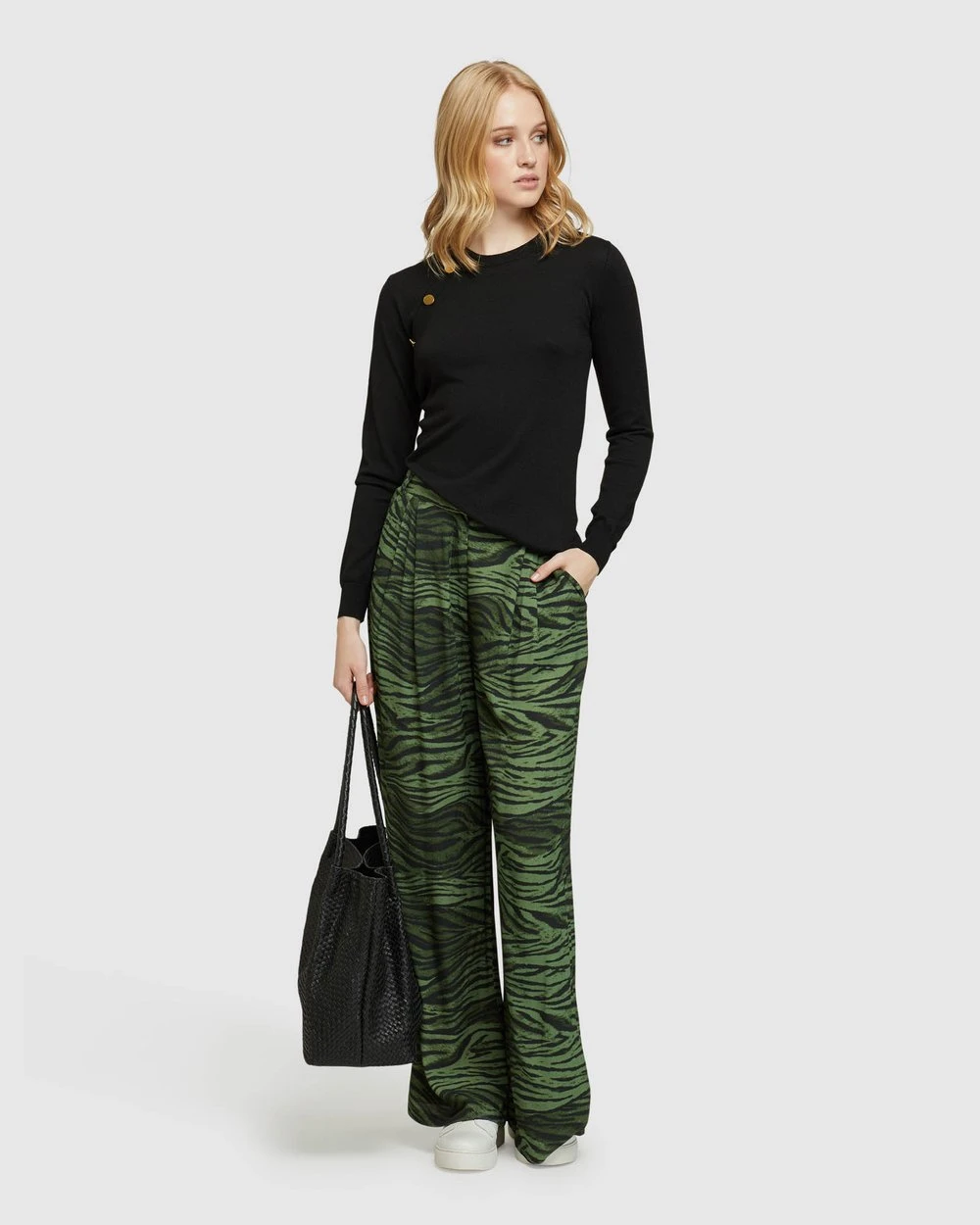 Inside leg: 78cm, Front rise: 31cm, Opening leg: 30.4cm (size 8). Our model is wearing size AU 8 pants and usually takes a size 8. She is 178 cm (5’84”) tall with an 81cm (32″) bust, a 63 cm (25″) waist and 86cm (34″) hips.