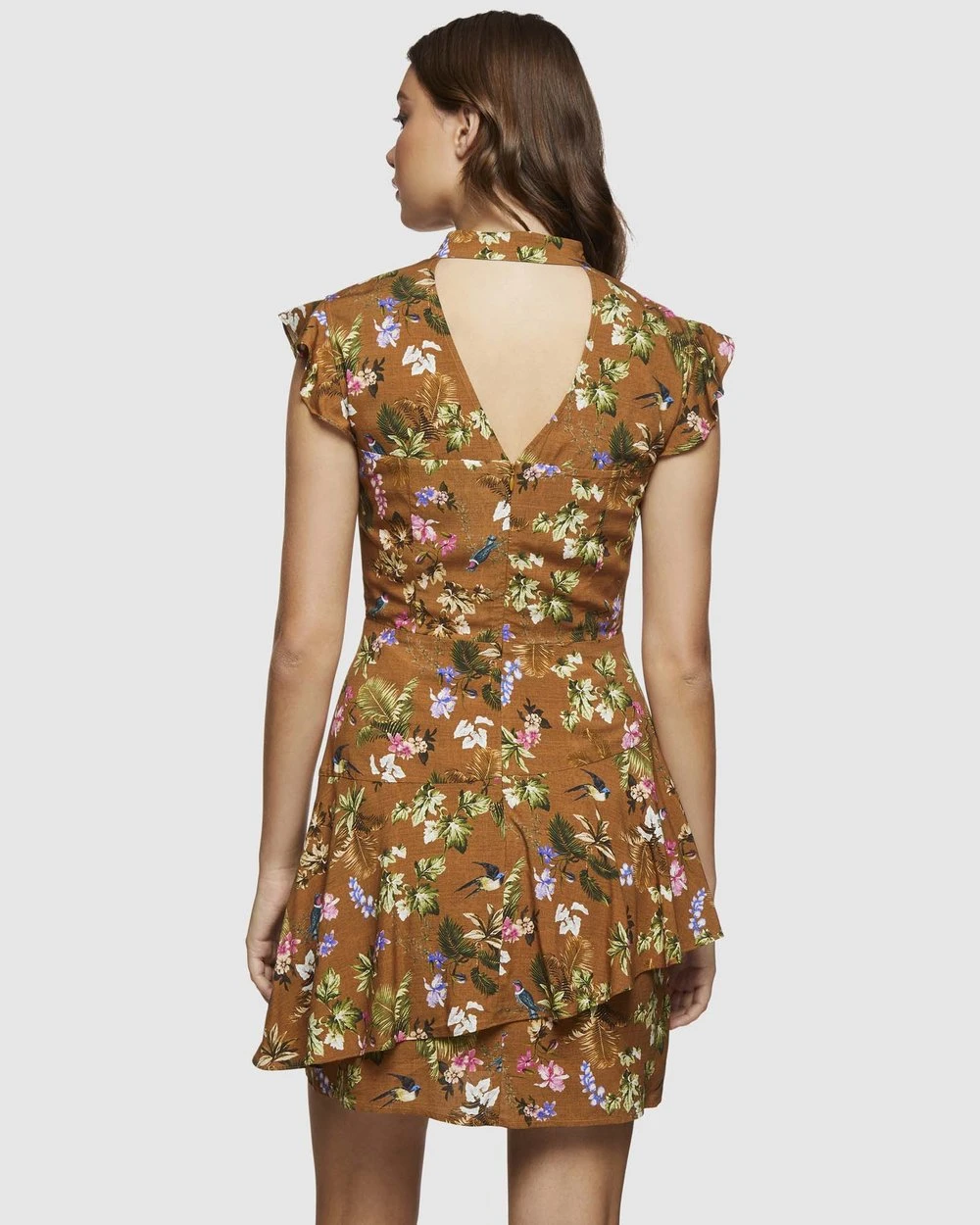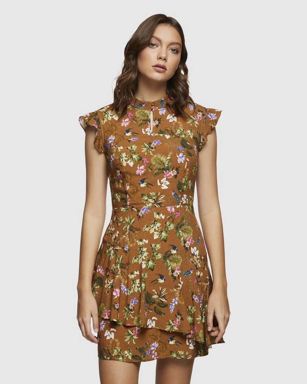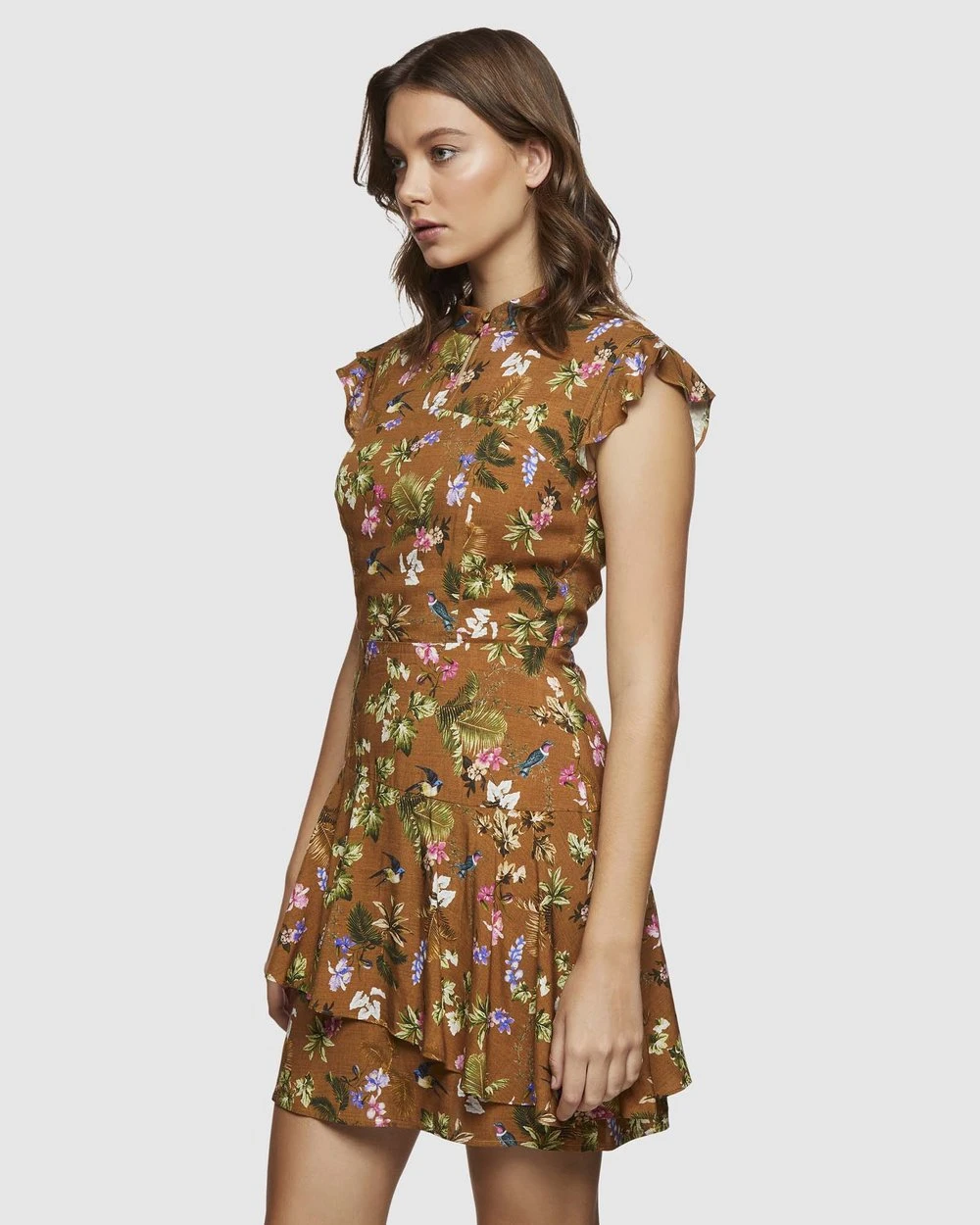 Make an impact at work or play in the Oxford Christina Floral Dress. This fun and flirty style features a spice coloured print with high neckline and frill detail around the shoulders and hemline. Style yours with boots for a casual chic look.