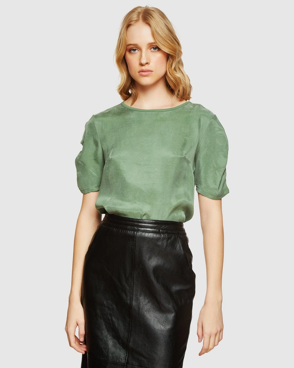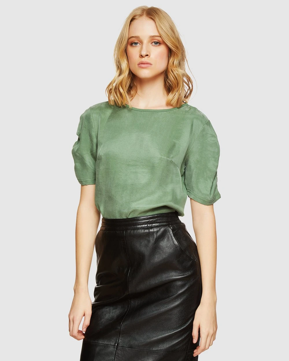 – Ruched sleeves