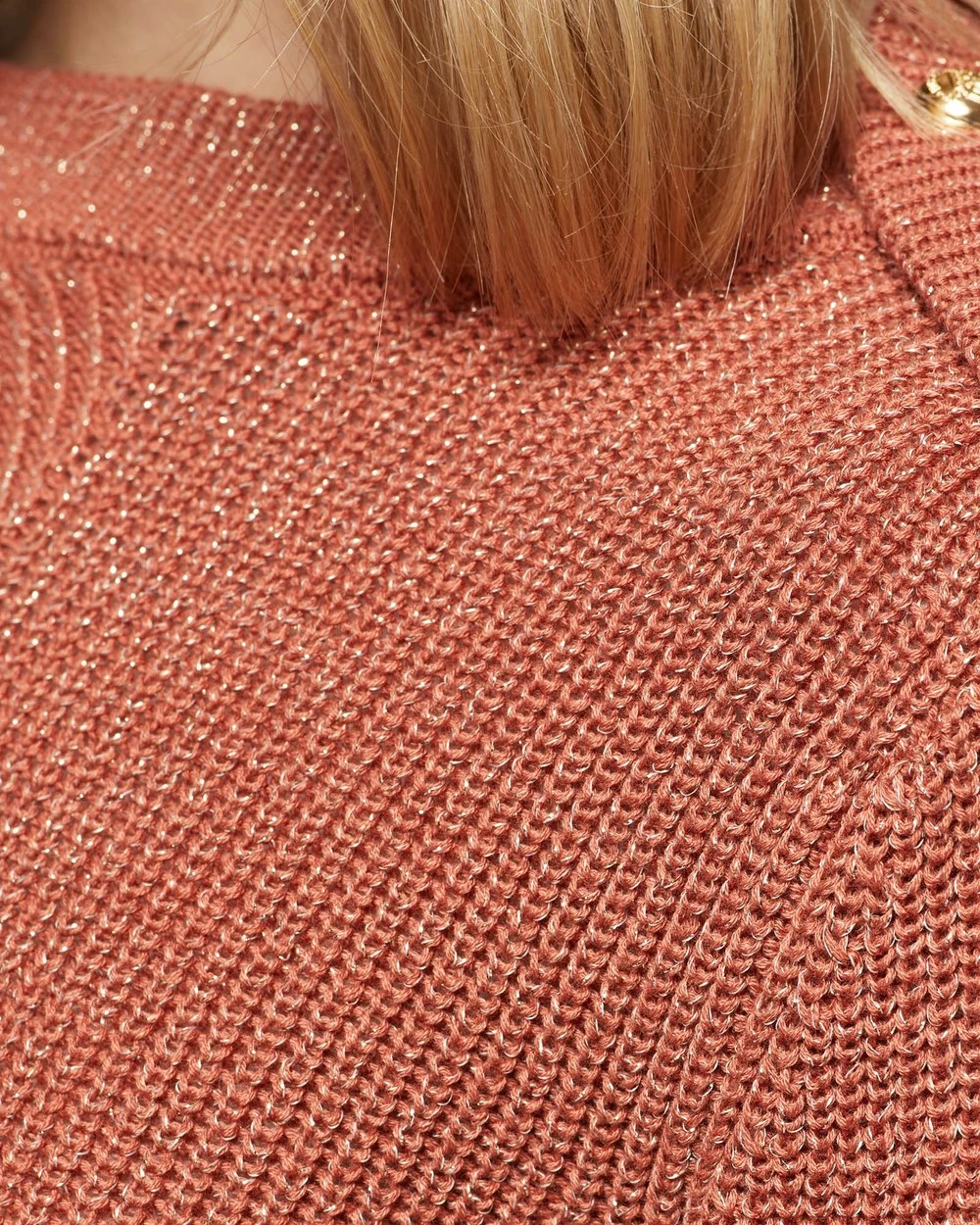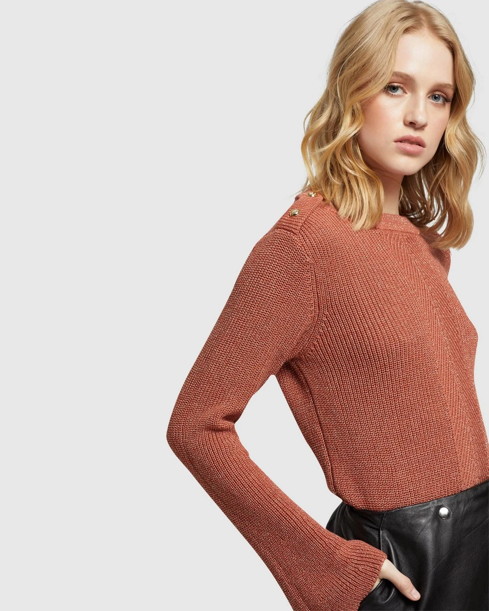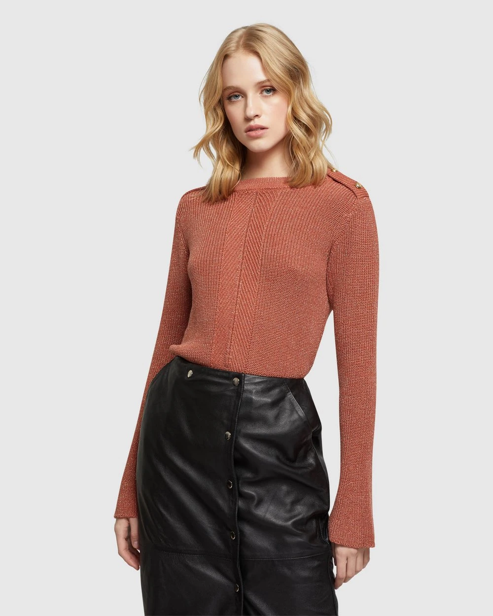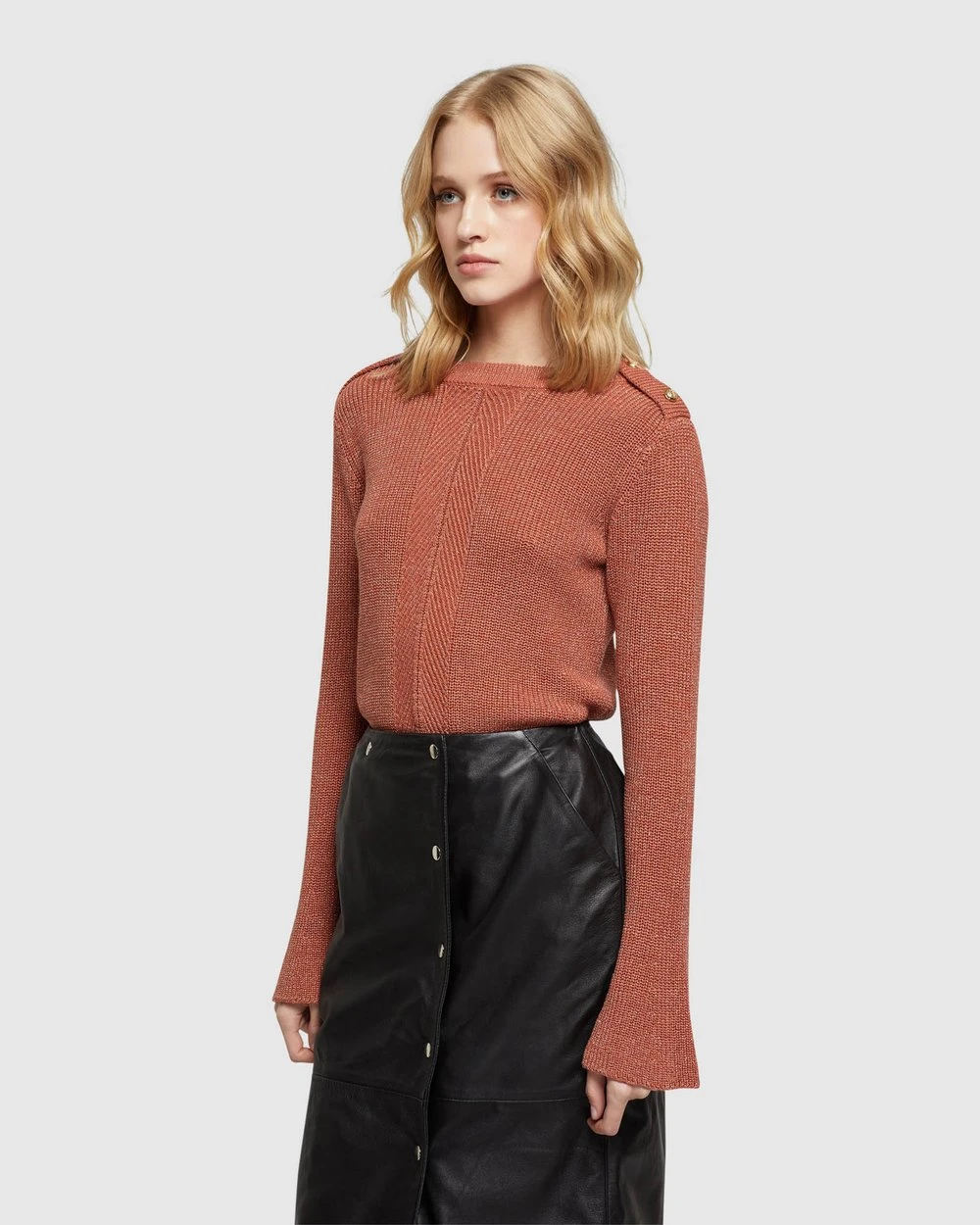 Add some sparkle to your collection with the Oxford Claudine Cable Knit, a chic and cosy style for the cooler months. This relaxed fitting jumper is crafted from cable knit weave with a metallic embellishment. It features smart shoulder epaulettes with shiny buttons, a round neckline, flared sleeves and large trims. Pair it with the Oxford Jemma Leather Skirt and heels to complete the look.