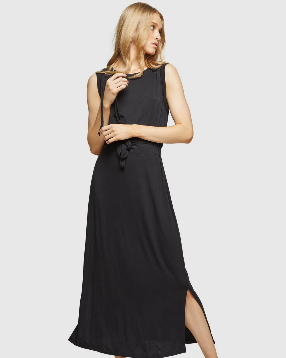 A gorgeous relaxed style, the Coco Drawstring Waist Knit Dress by Oxford is your dream summer dress. This knitted dress has a hint of stretch and features side splits, a round neckline, and a drawstring waist for a flattering silhouette.