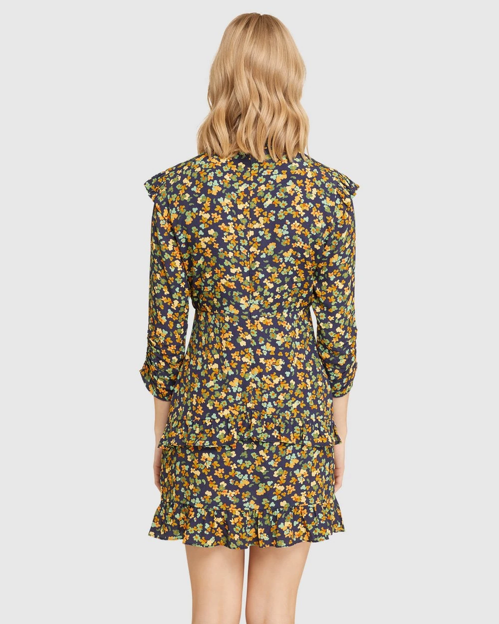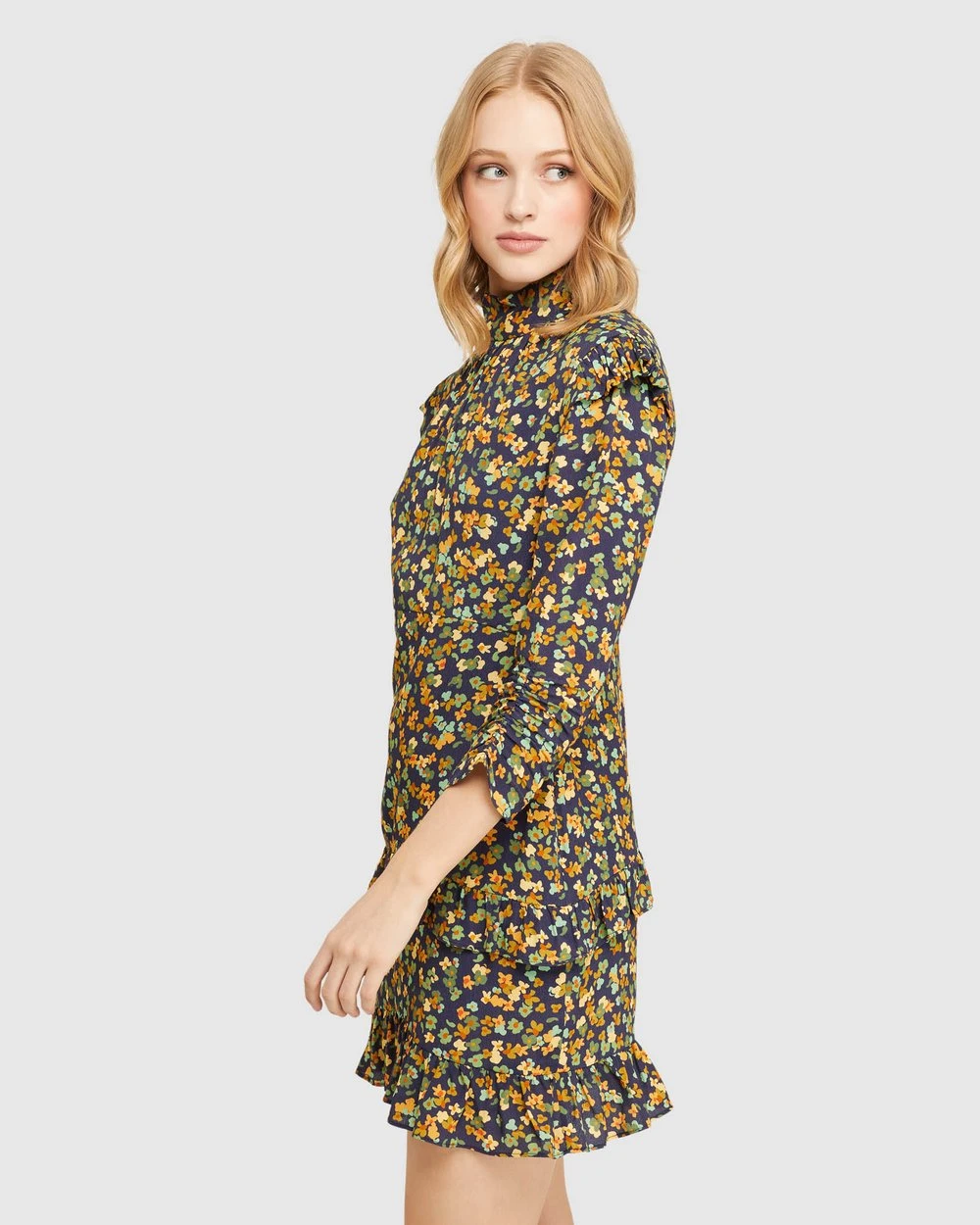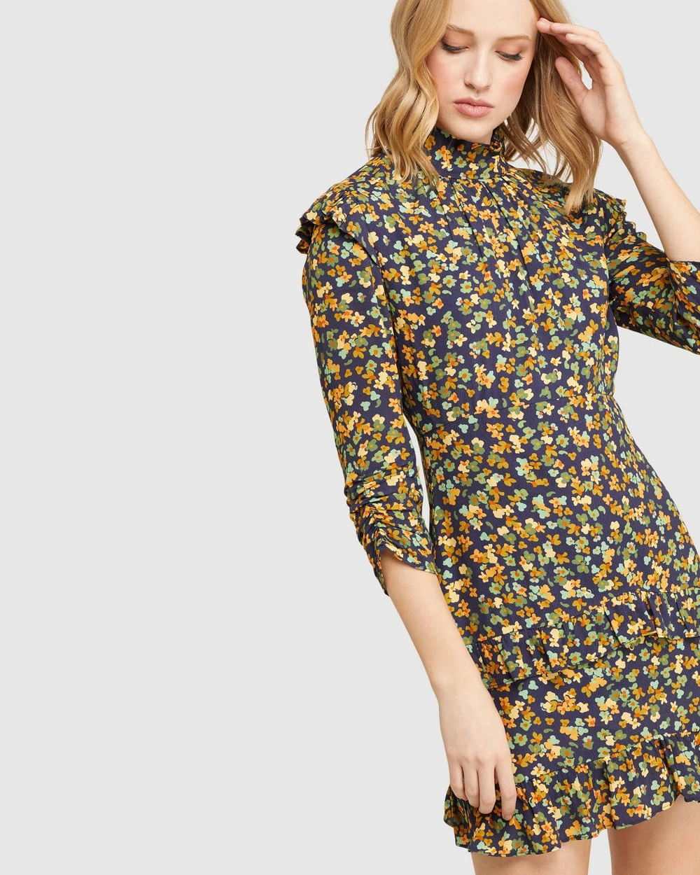 A statement style with a retro feel, the Coraline Daisy Print Dress by Oxford is a fun look with flair. This gorgeous floral style is cut in a figuring-hugging fit and has frill detail on the shoulders and skirt, with a high neckline and ruched sleeves.