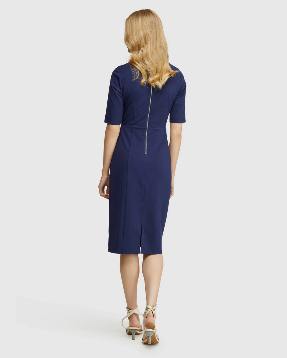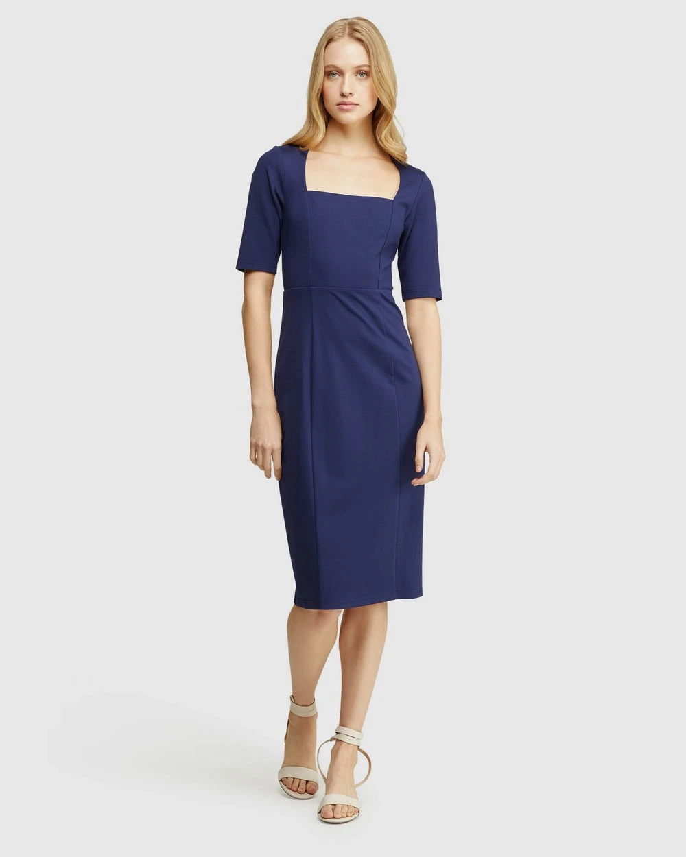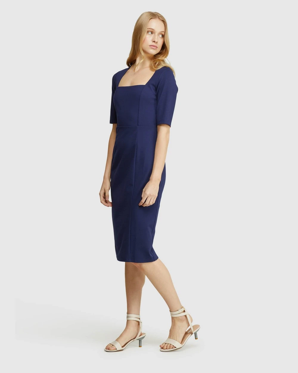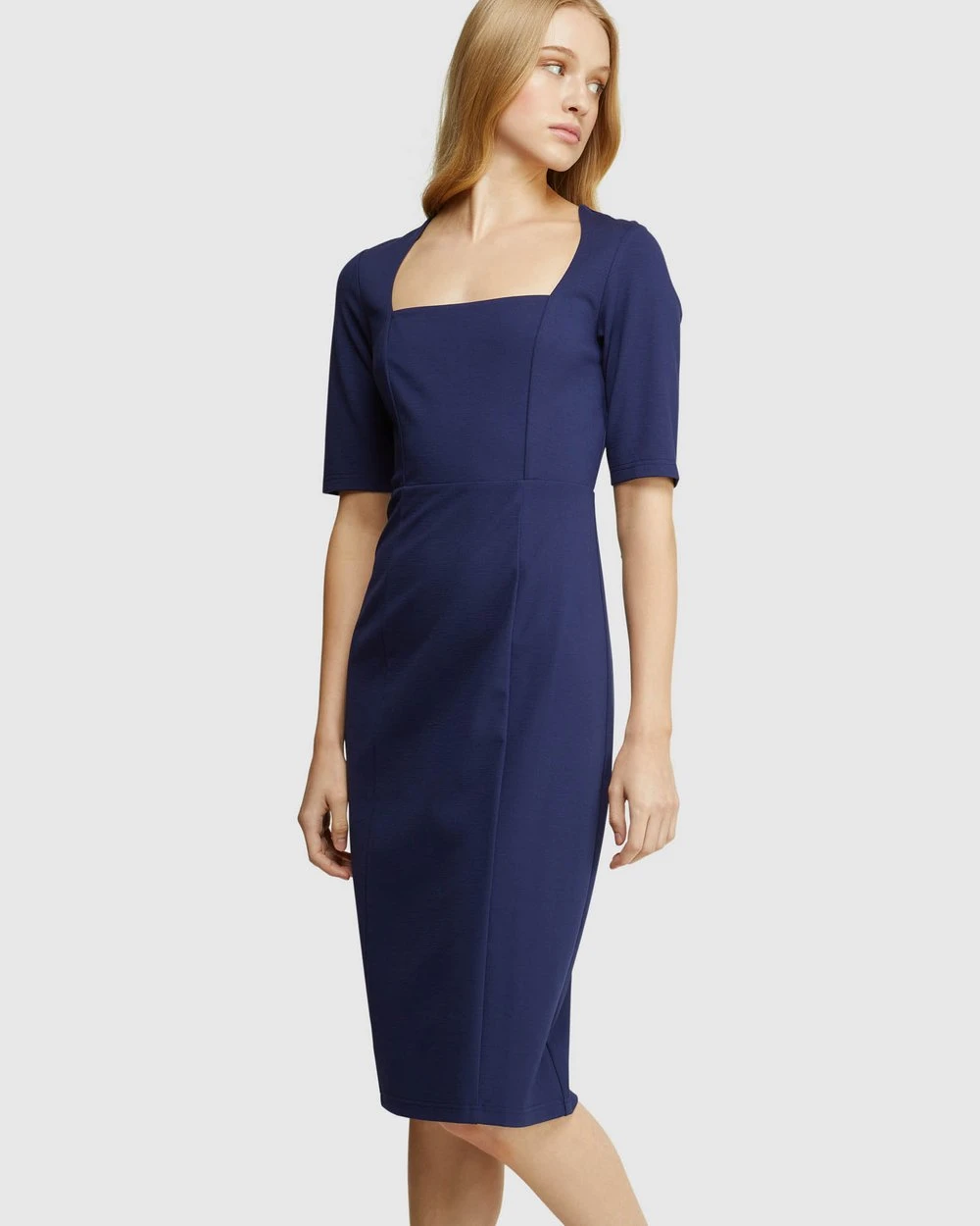 The Dallas Ponti Dress by Oxford is a smart and confident style for work or play. This knee-length dress is crafted from a textured Ponti fabrication and has a flattering silhouette with a fitted waist. It features a tapered cut, exposed back zipper, short sleeves and a square neckline.