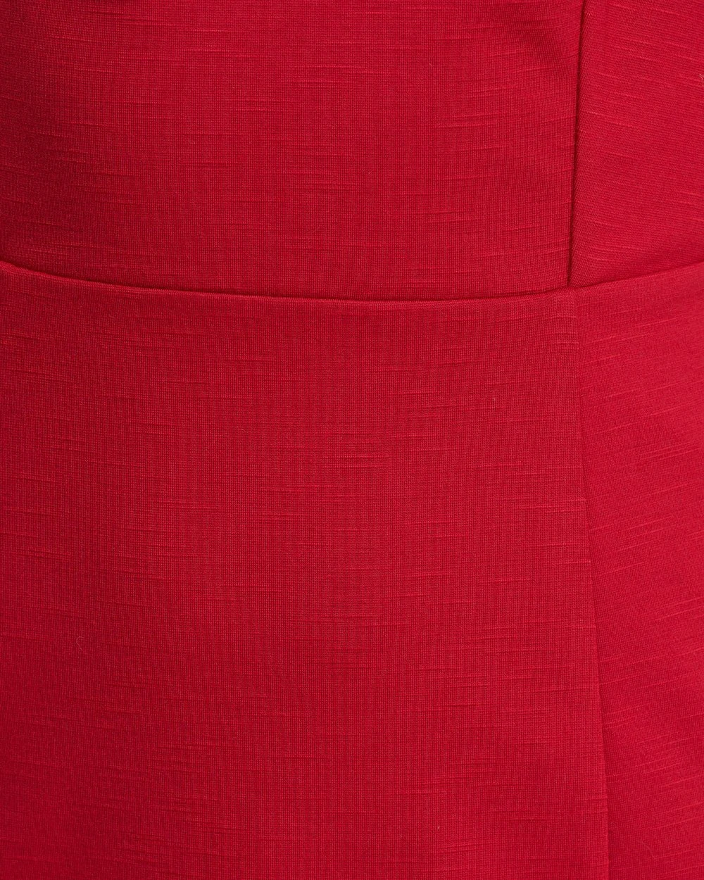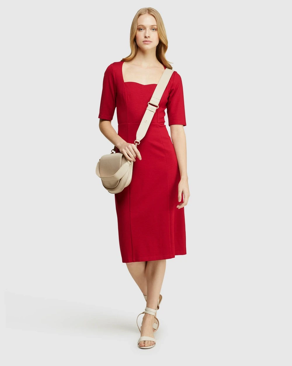 The Dallas Ponti Dress by Oxford is a smart and confident style for work or play. This knee-length dress is crafted from a textured Ponti fabrication and has a flattering silhouette with a fitted waist. It features a tapered cut, exposed back zipper, short sleeves and a square neckline.