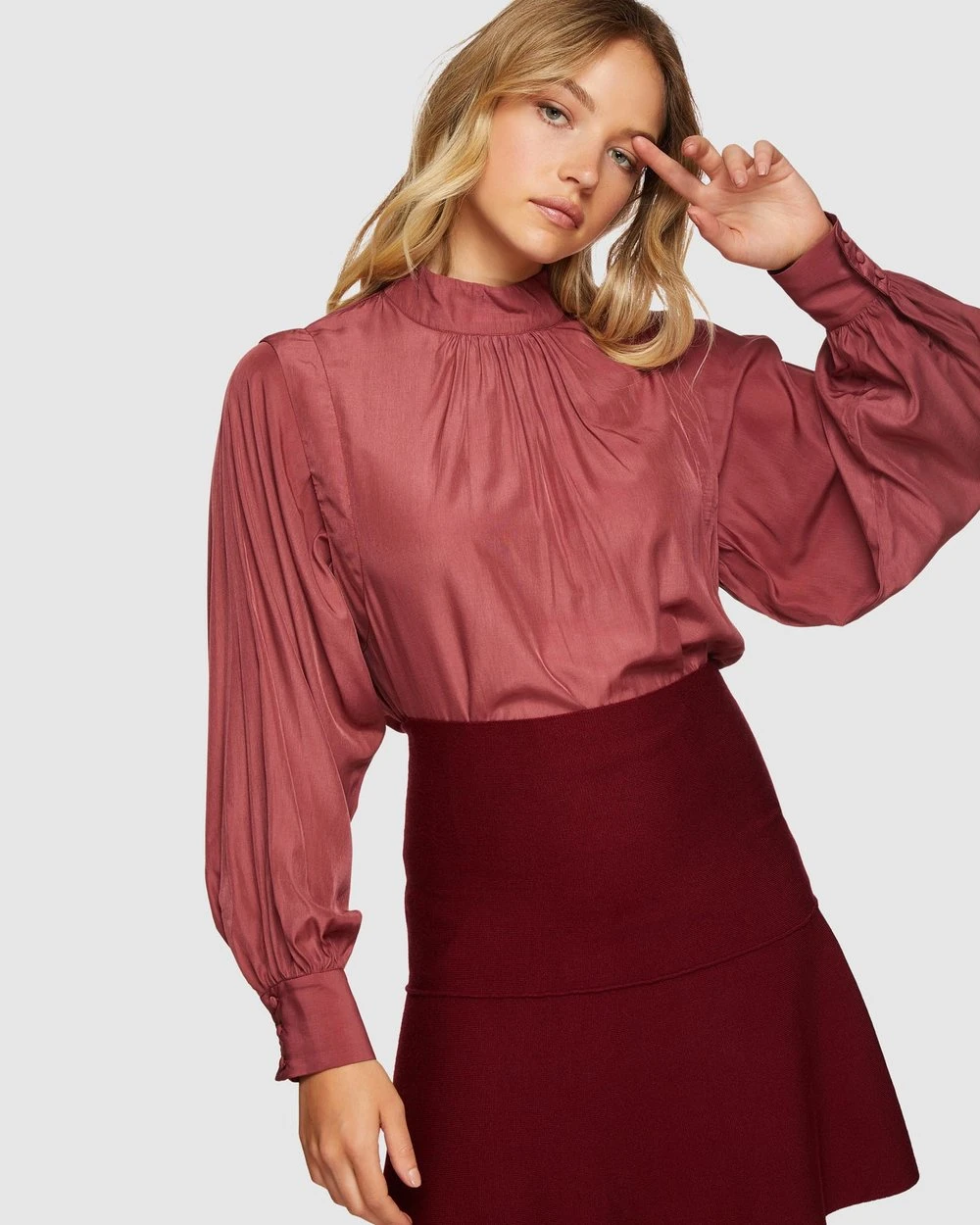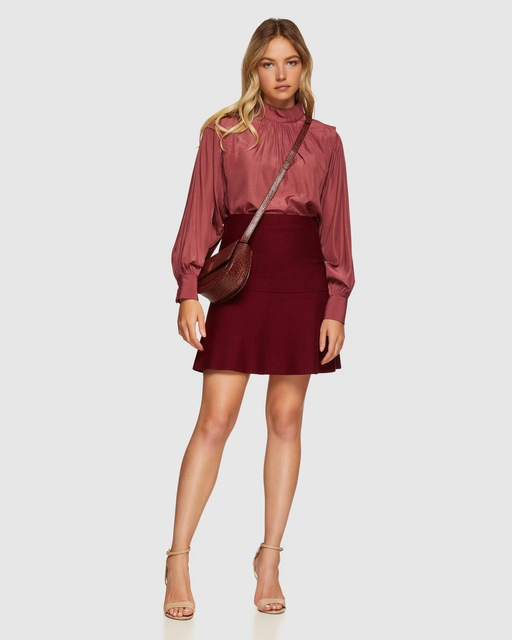 Our model is wearing a size AU 8 skirt and usually takes a size 8. She is 175 cm (5’9″) tall with an 86cm (34″) bust, a 61 cm (24″) waist and 89cm (35″) hips.