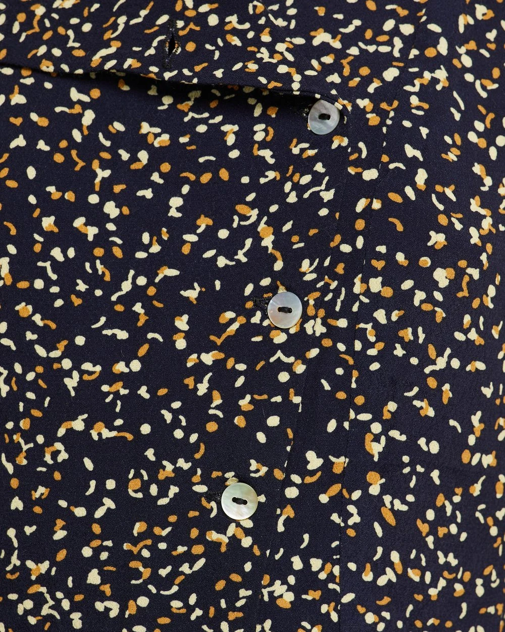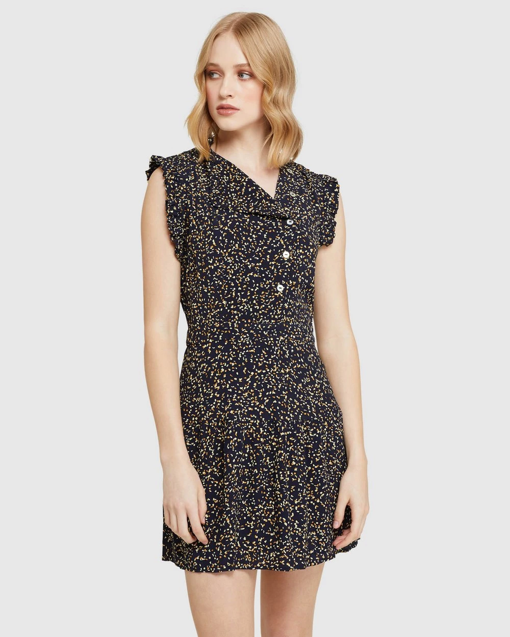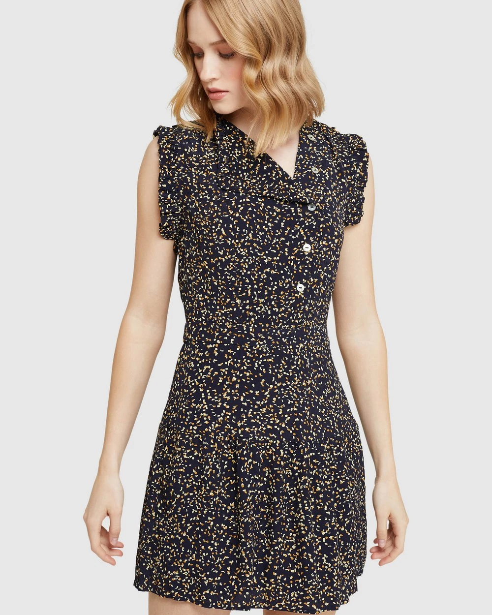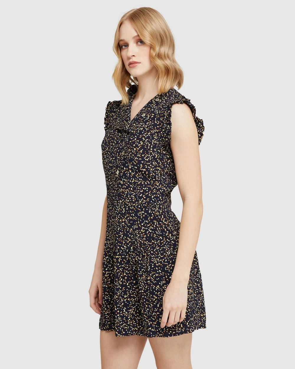 Effortless summer style, the Delilah Black Confetti Dress by Oxford is cut in a close fit and has a fun spot print with an asymmetrical button up neckline and frilled shoulder detail.